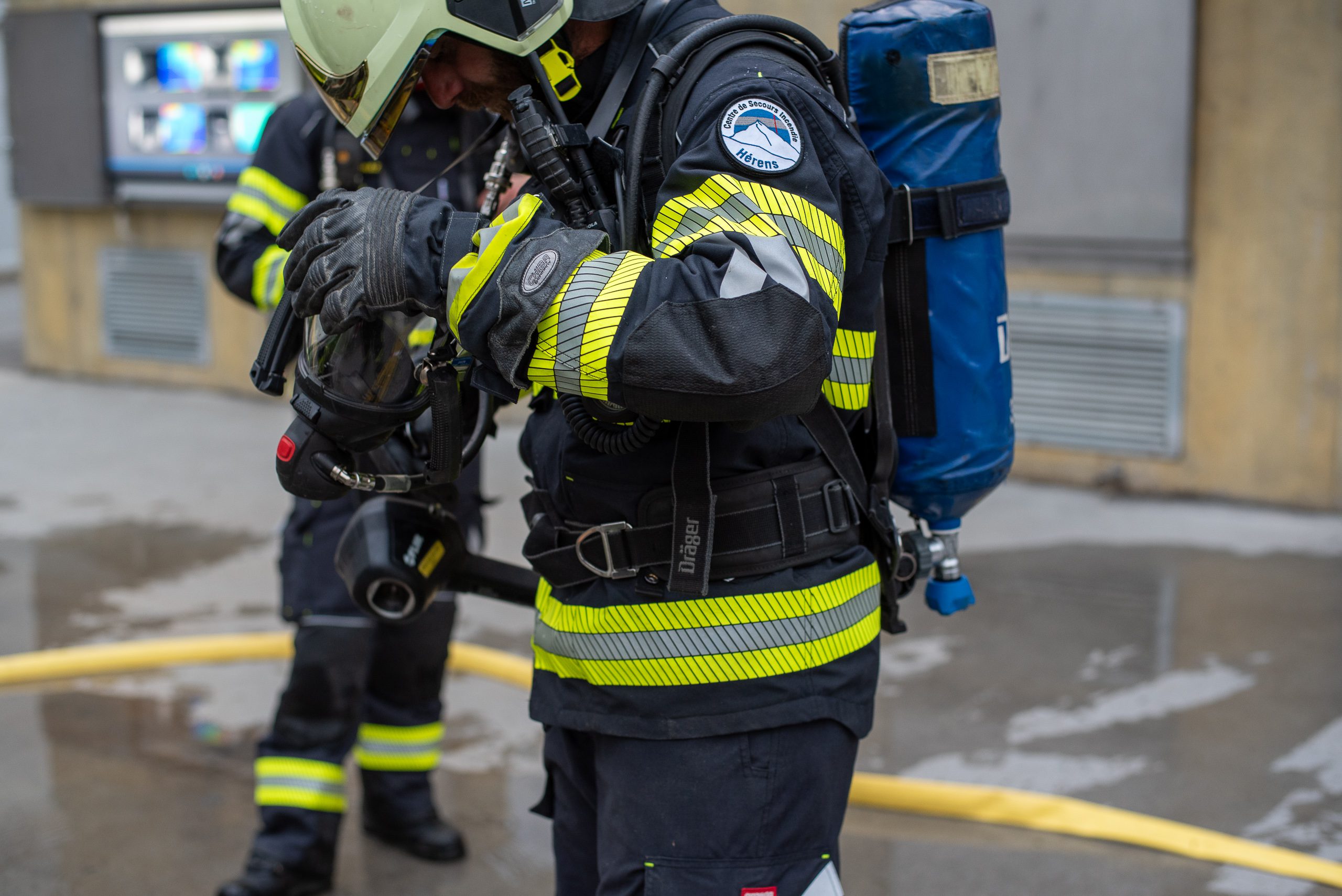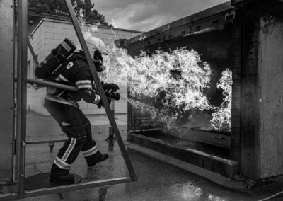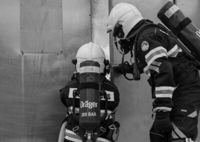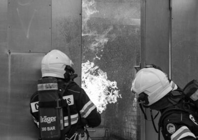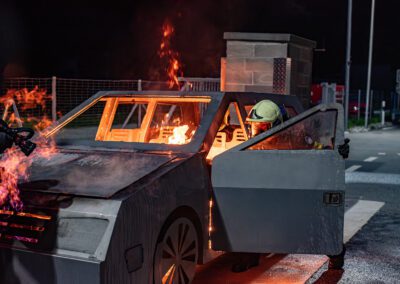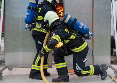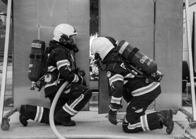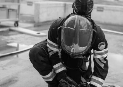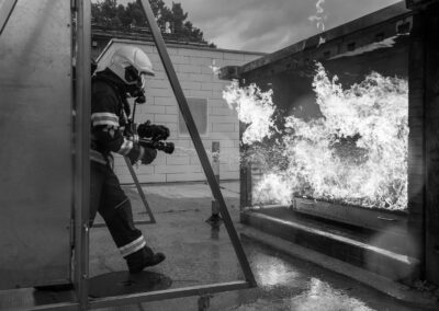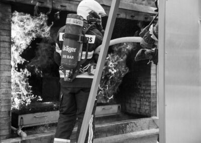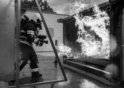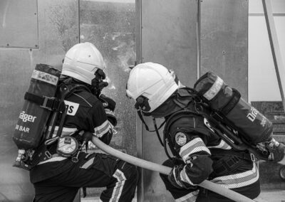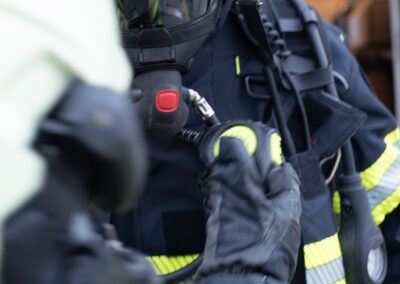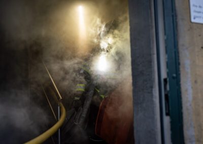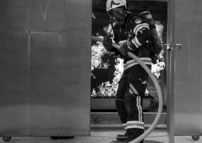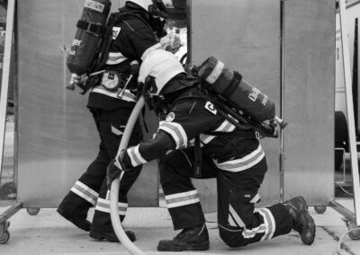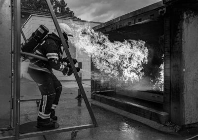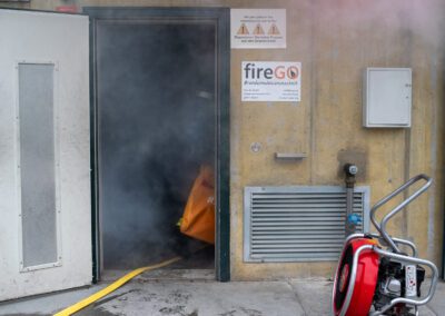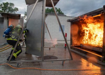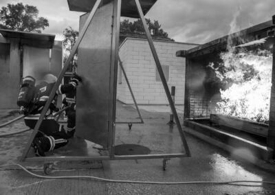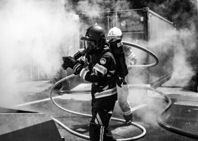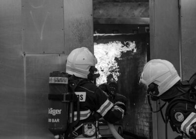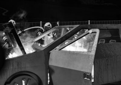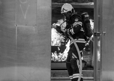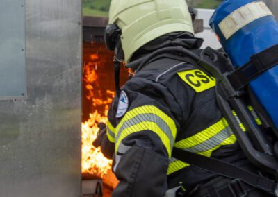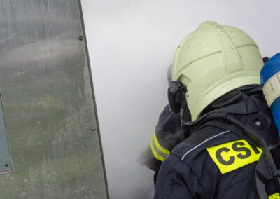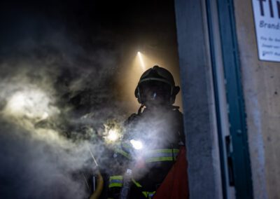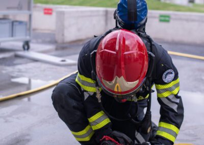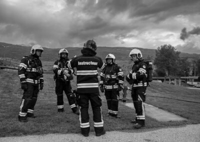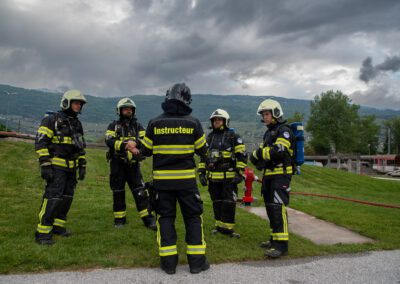 Séance de protection respiratoire réalisée à Grône : exercices centrés sur la coordination entre équipiers lors de l’ouverture de porte avec extinction immédiate, l’extinction de feu de voiture, ainsi que la gestion désenfumage dans cage d’escalier et local. Les participants ont aussi été confrontés à des pénétrations de pièces enfumées avec extinction ciblée. Ces mises en situation ont permis de renforcer les automatismes, la communication et les procédures de sécurité en environnement hostile.