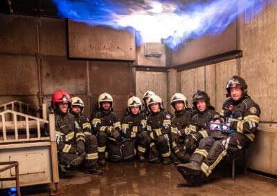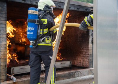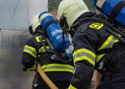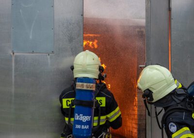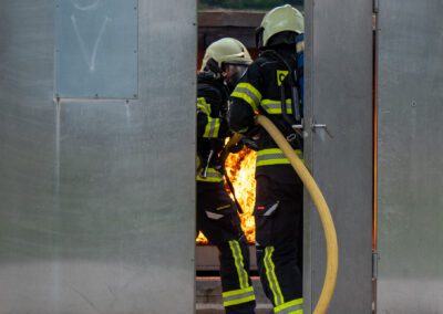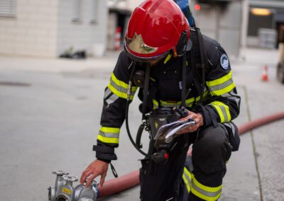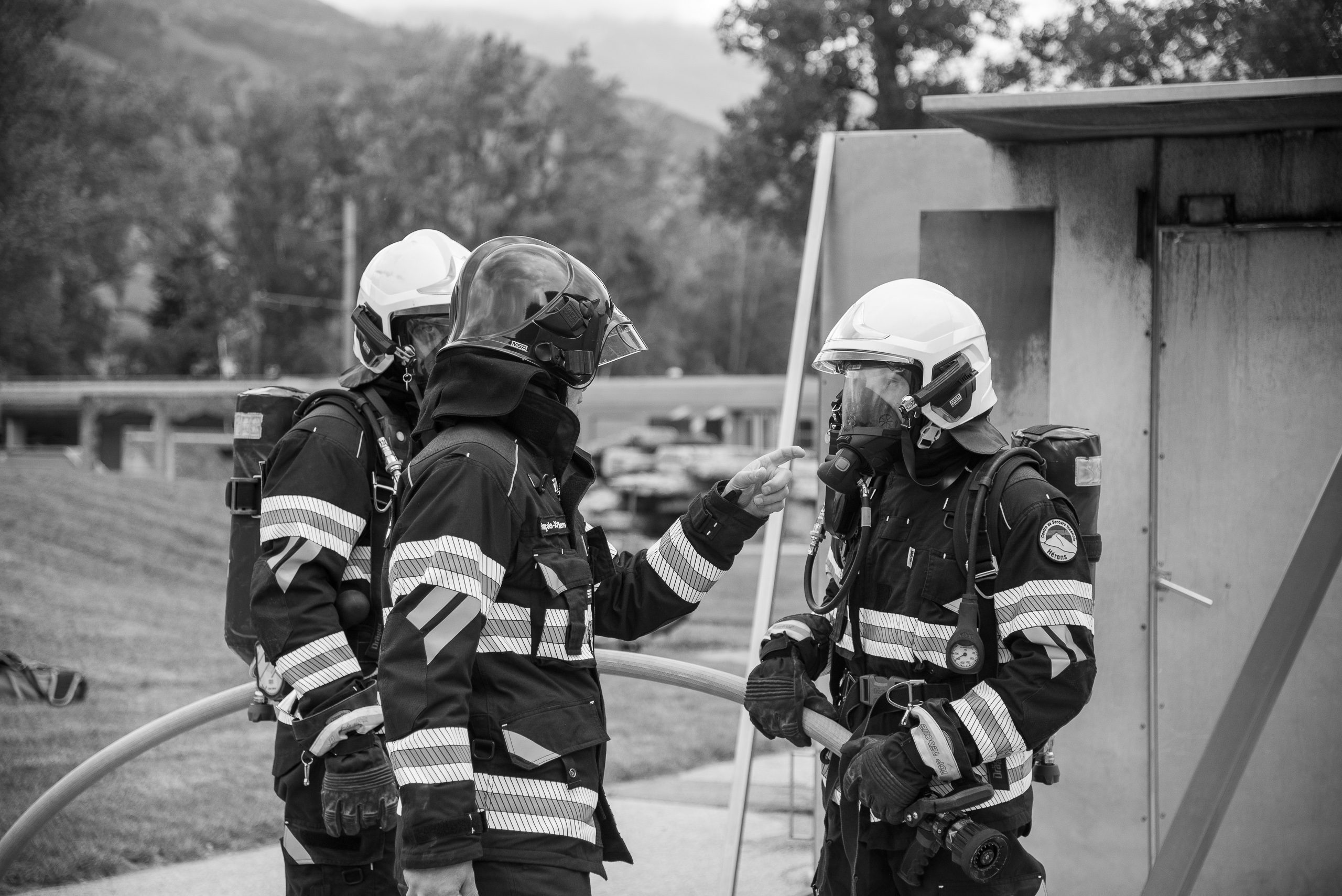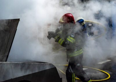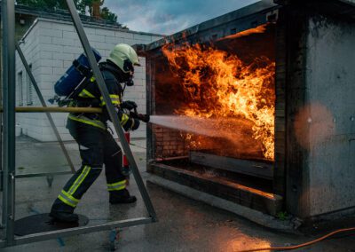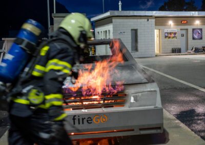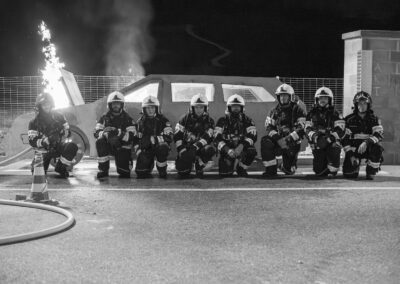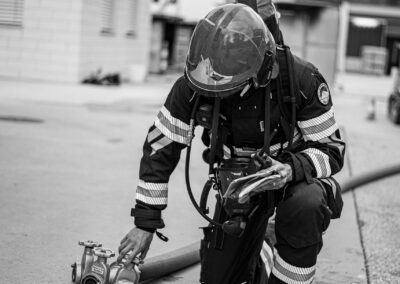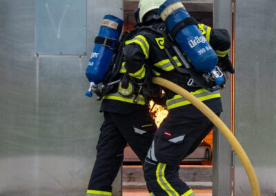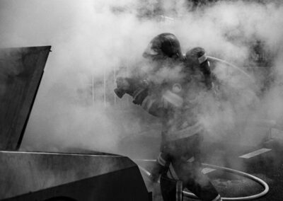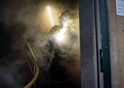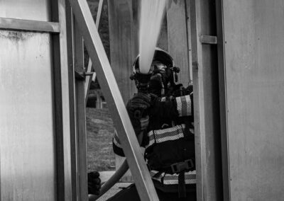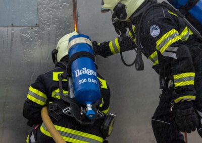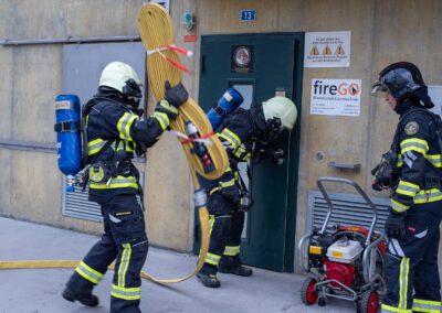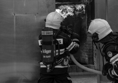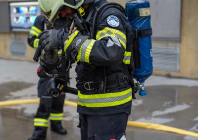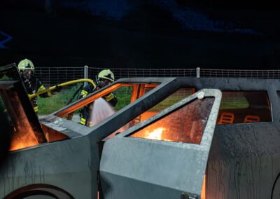 Séance de protection respiratoire réalisée à Grône : exercices centrés sur la coordination entre équipiers lors de l’ouverture de porte avec extinction immédiate, l’extinction de feu de voiture, ainsi que la gestion désenfumage dans cage d’escalier et local. Les participants ont aussi été confrontés à des pénétrations de pièces enfumées avec extinction ciblée. Ces mises en situation ont permis de renforcer les automatismes, la communication et les procédures de sécurité en environnement hostile.