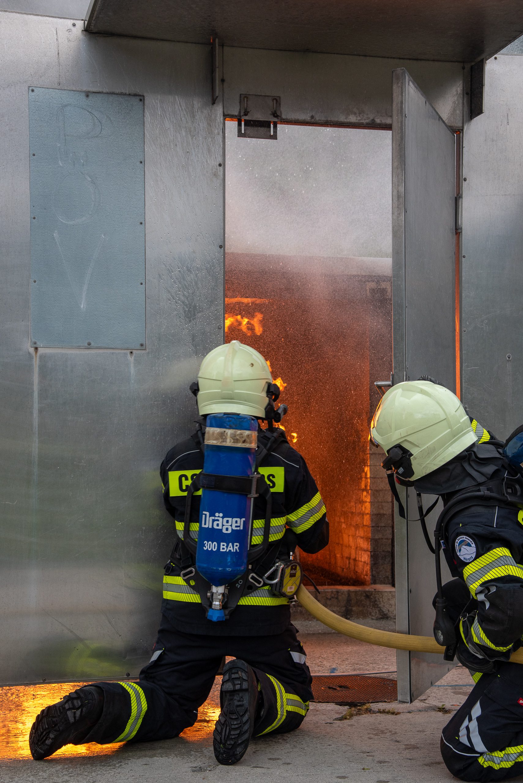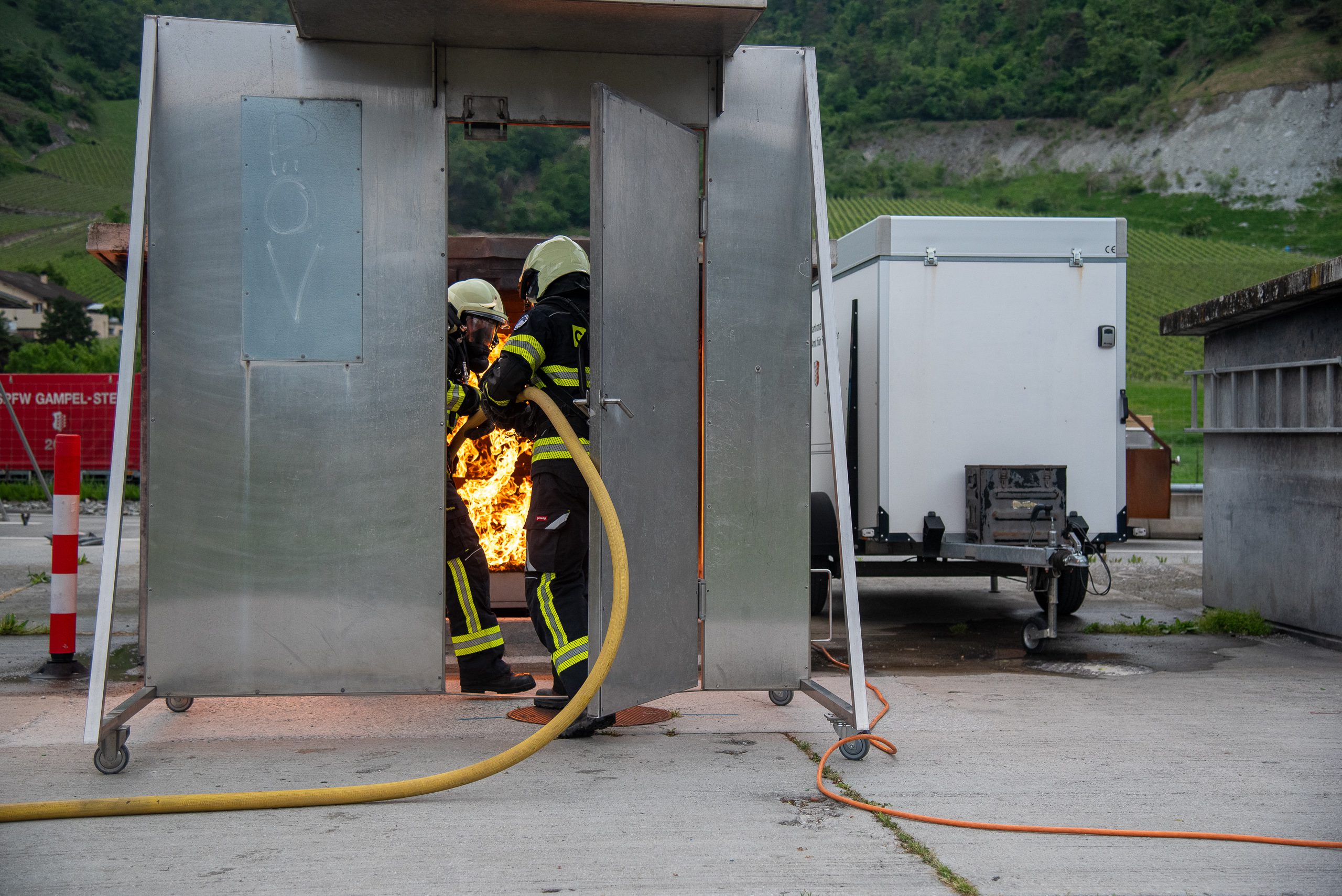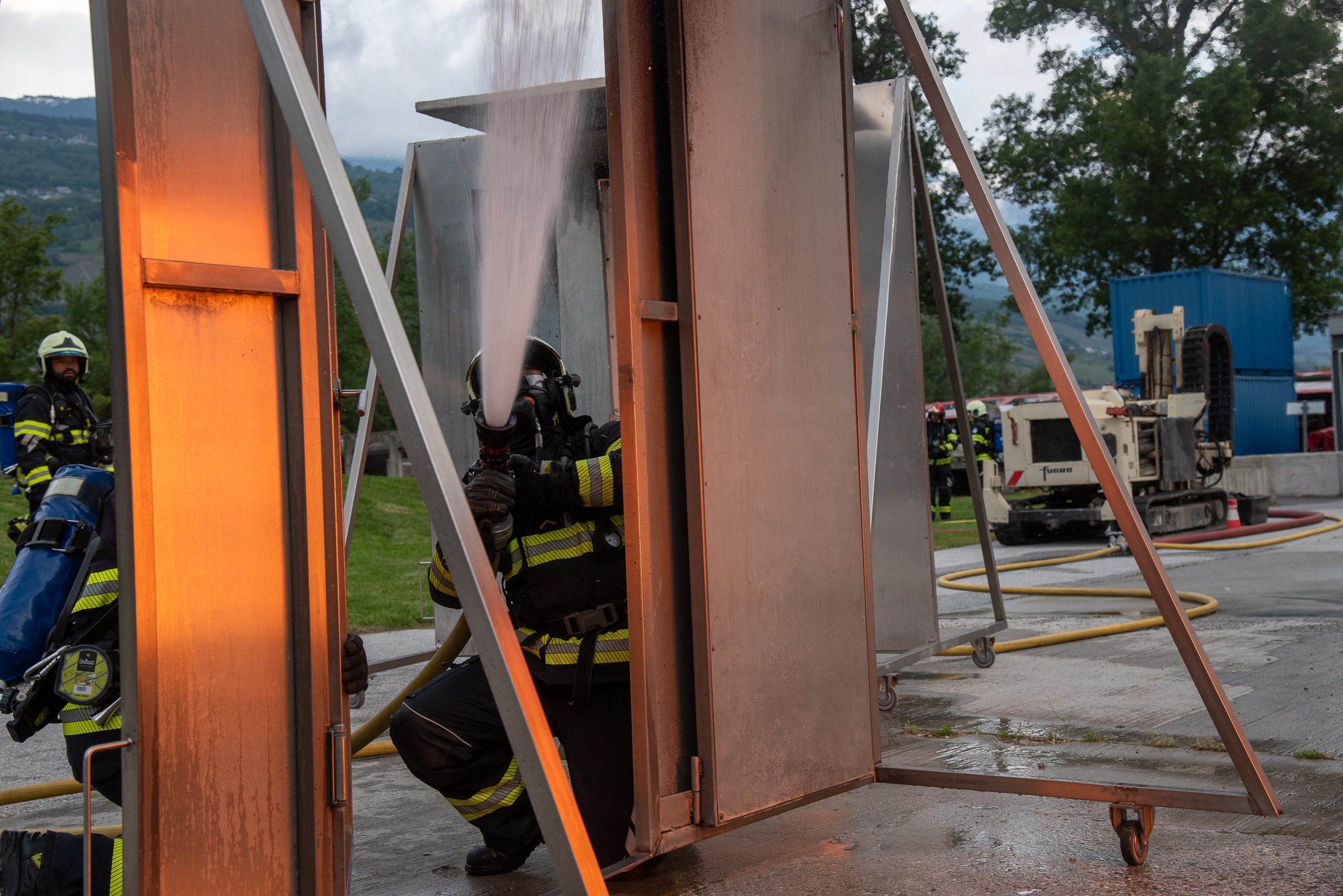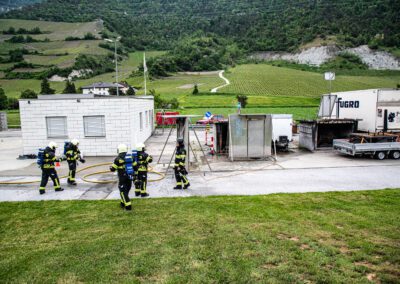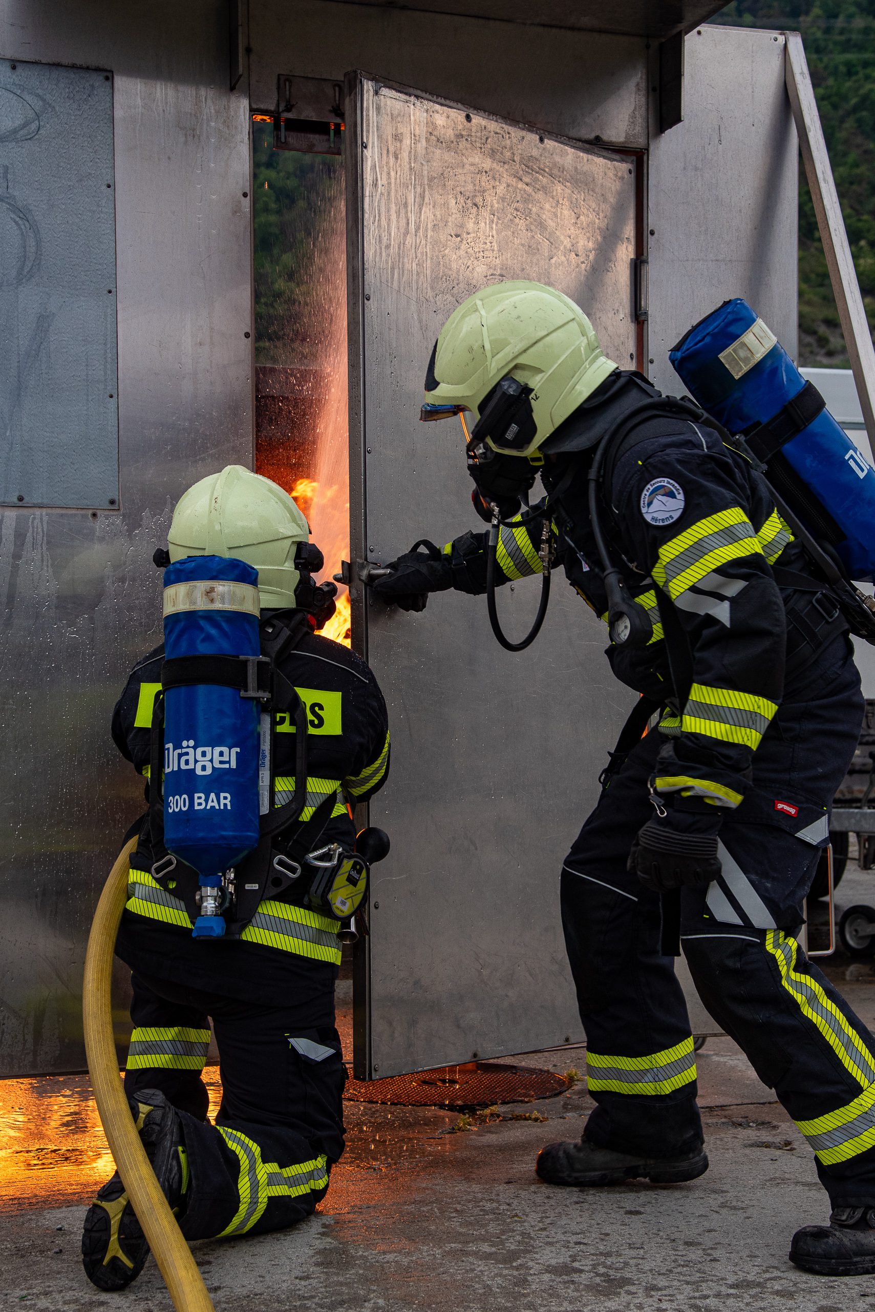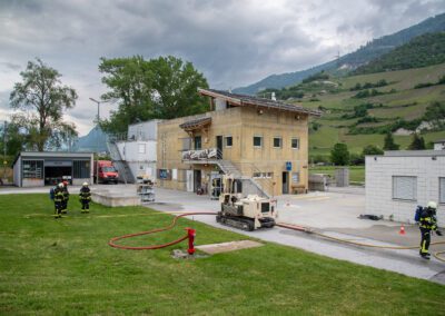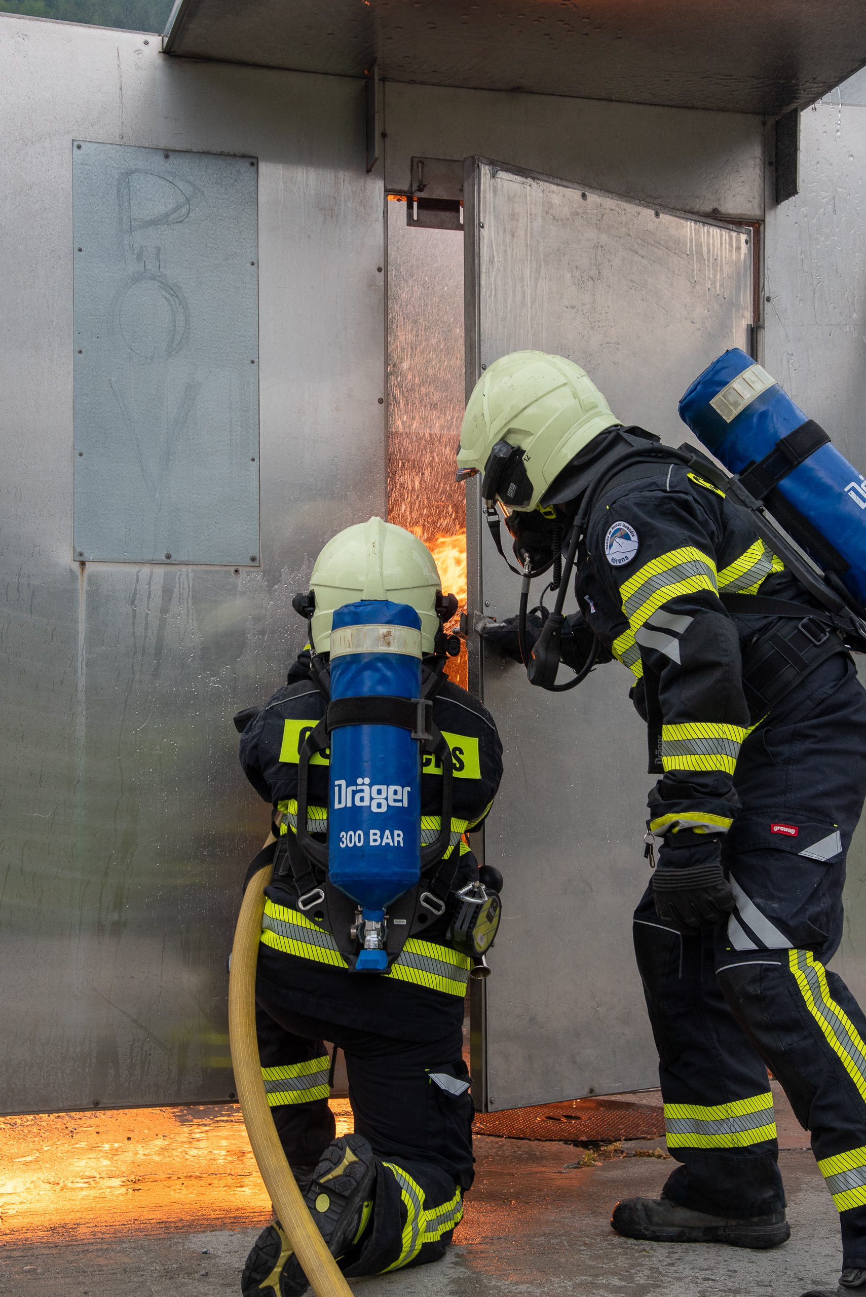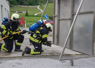 Lieu : Grône • Thèmes : coordination d'équipe, ouverture de porte avec extinction, feu de voiture, désenfumage cage/local, pénétration et extinction