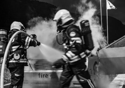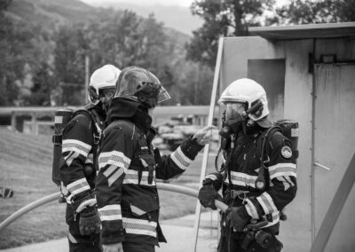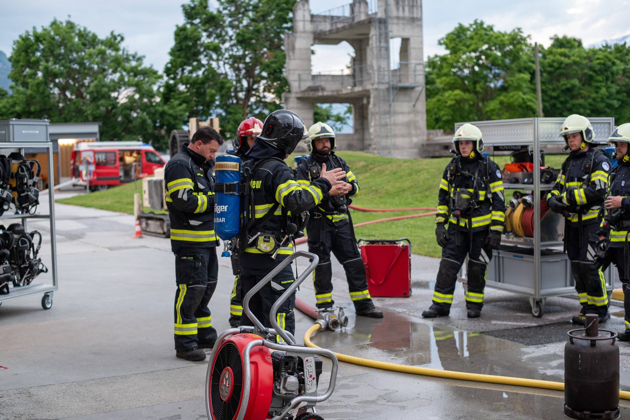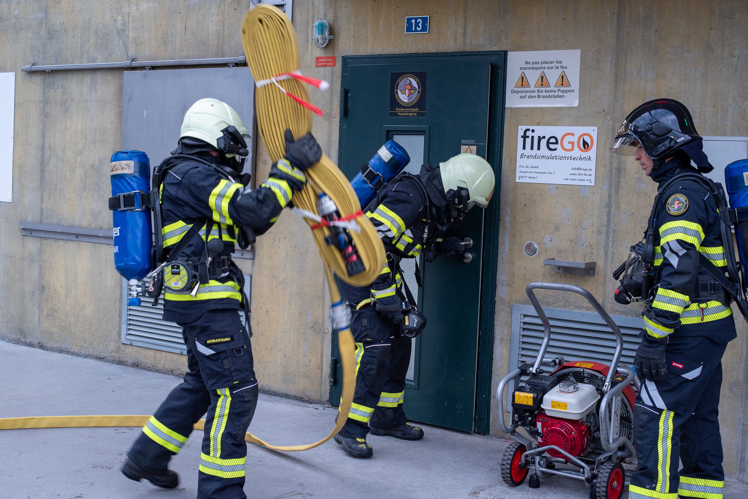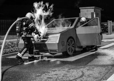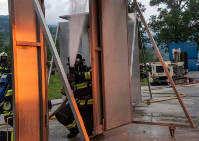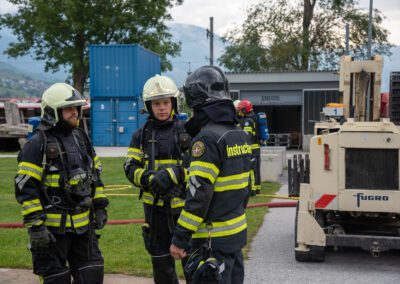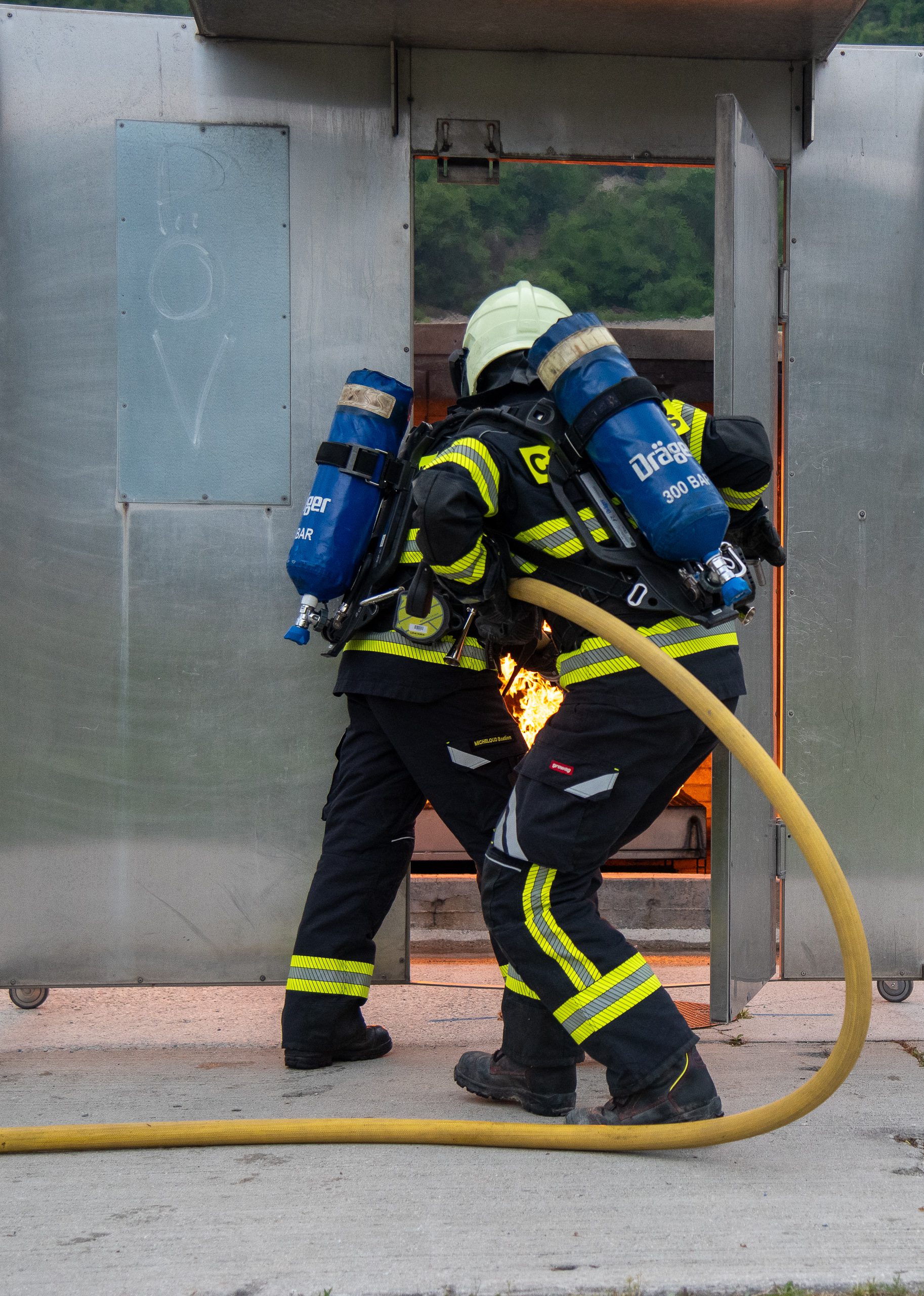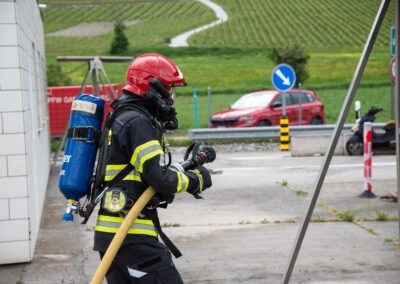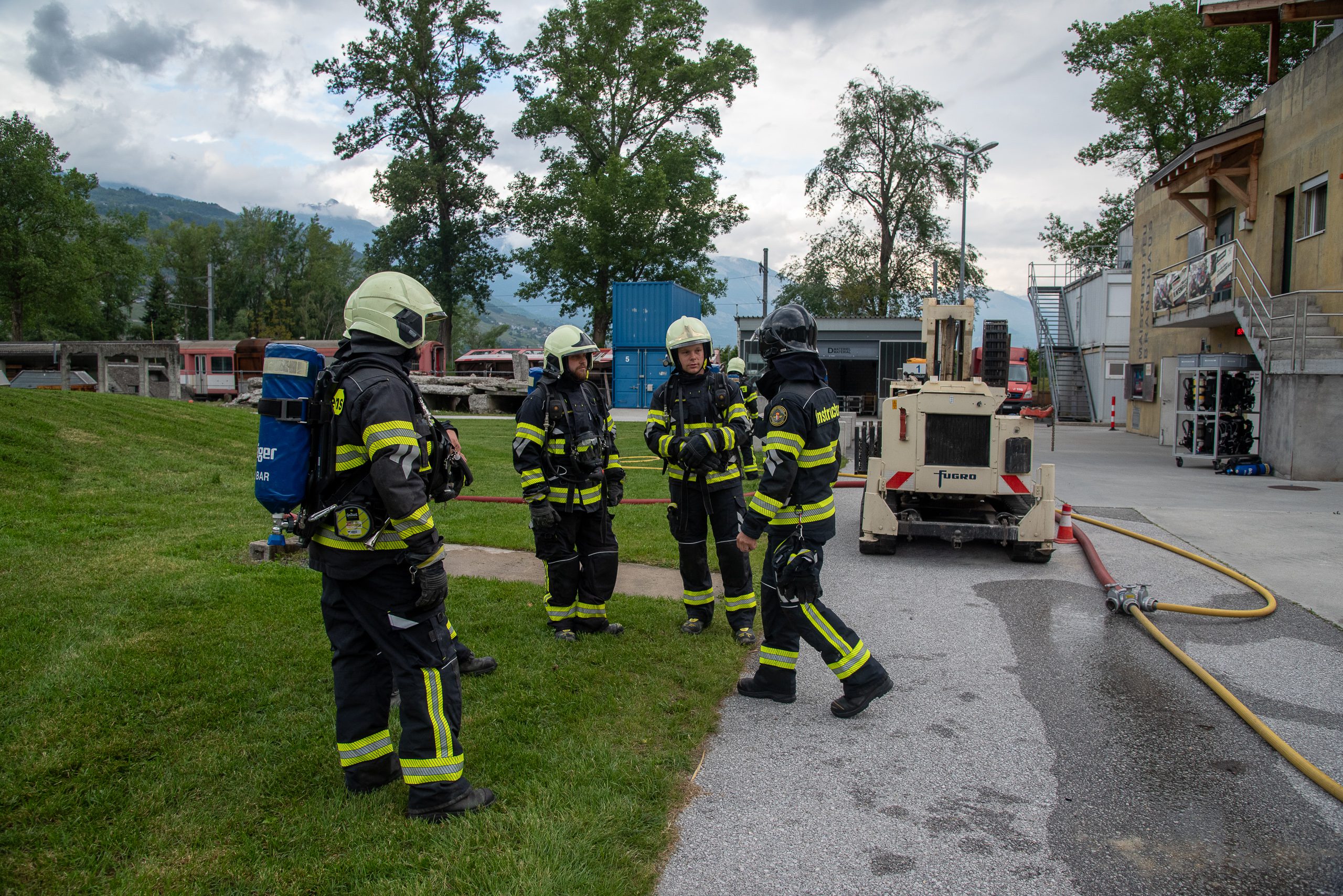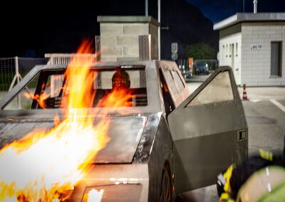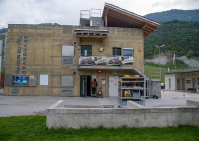 Lieu : Grône • Thèmes : coordination d'équipe, ouverture de porte avec extinction, feu de voiture, désenfumage cage/local, pénétration et extinction