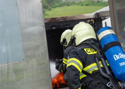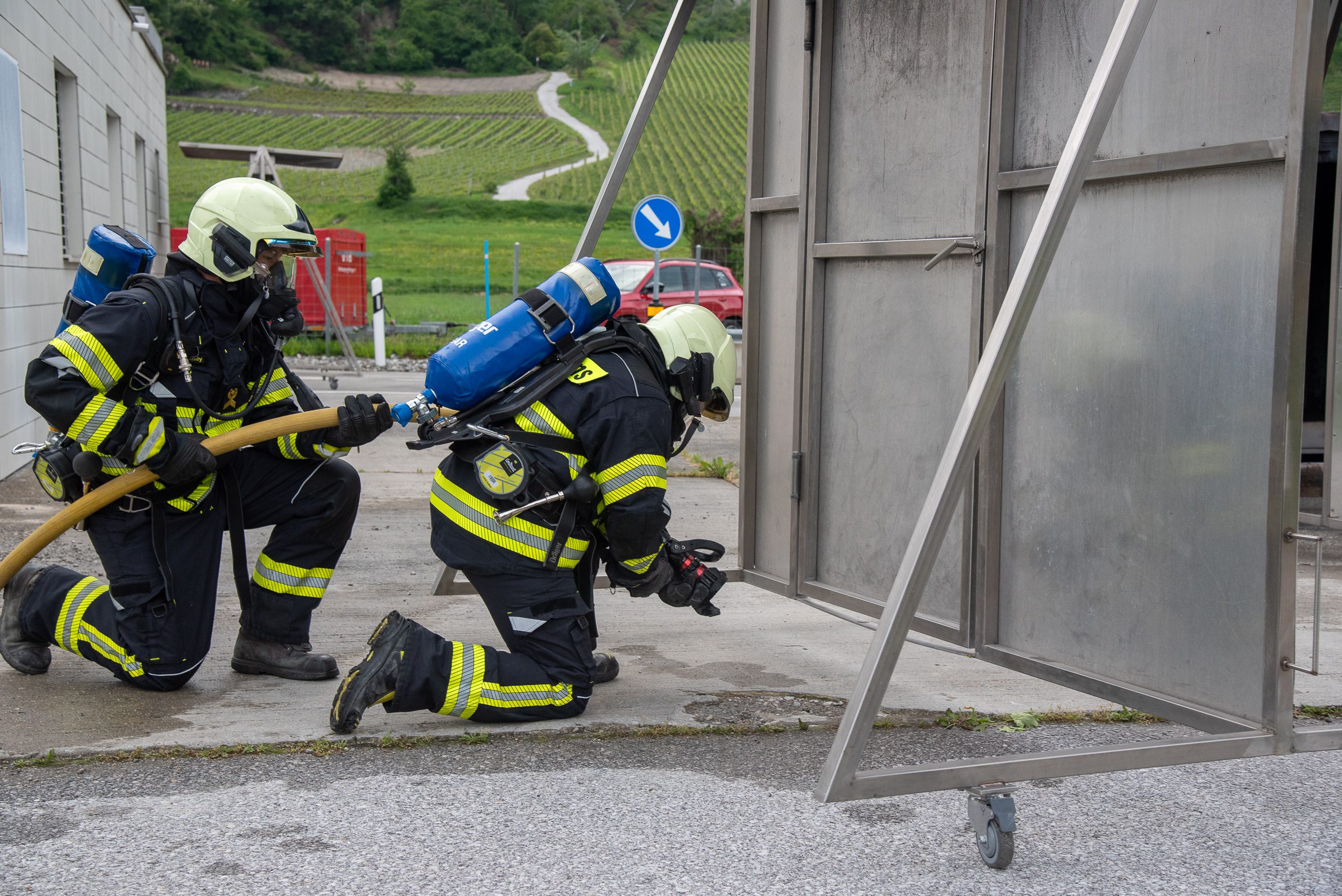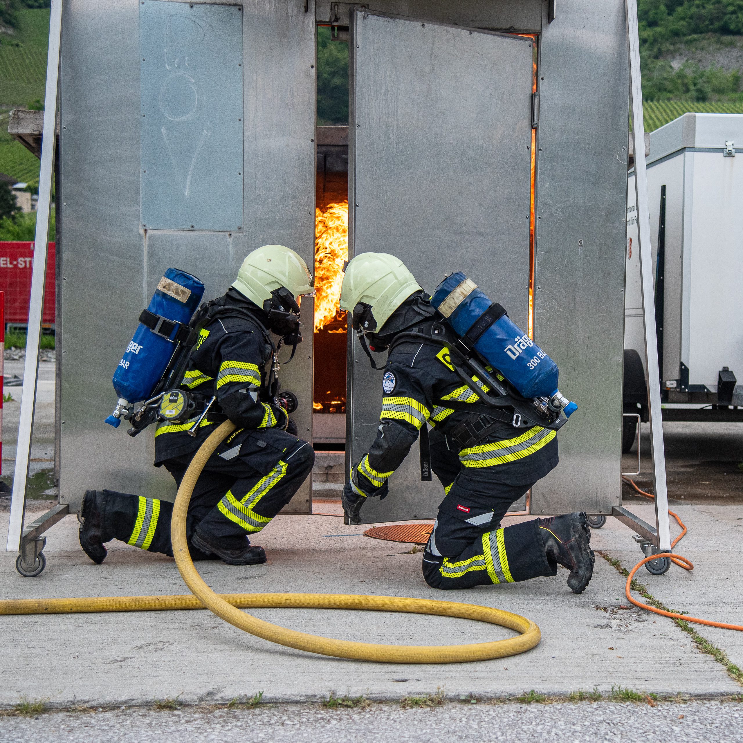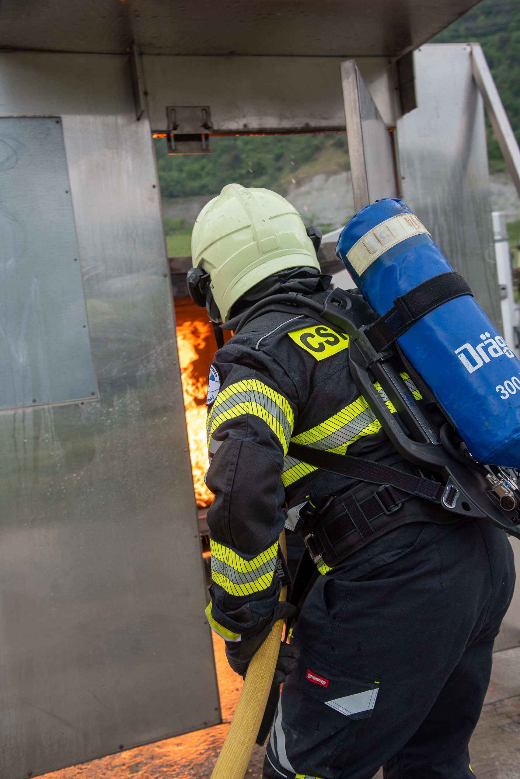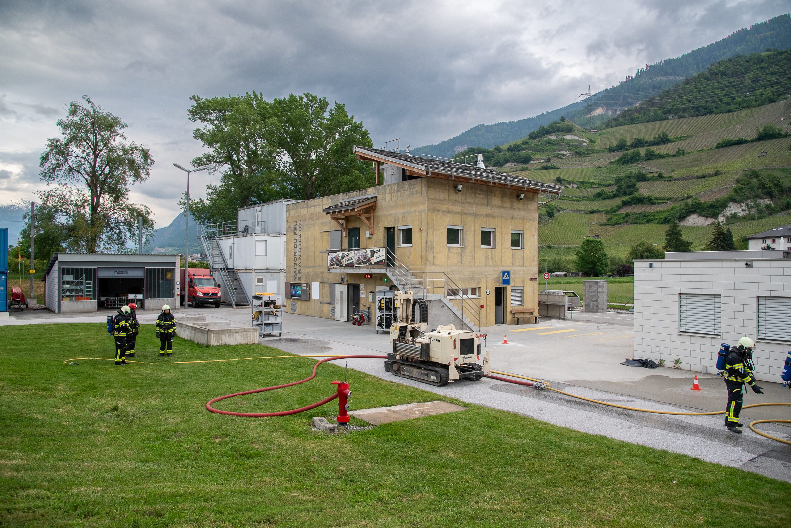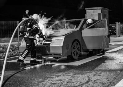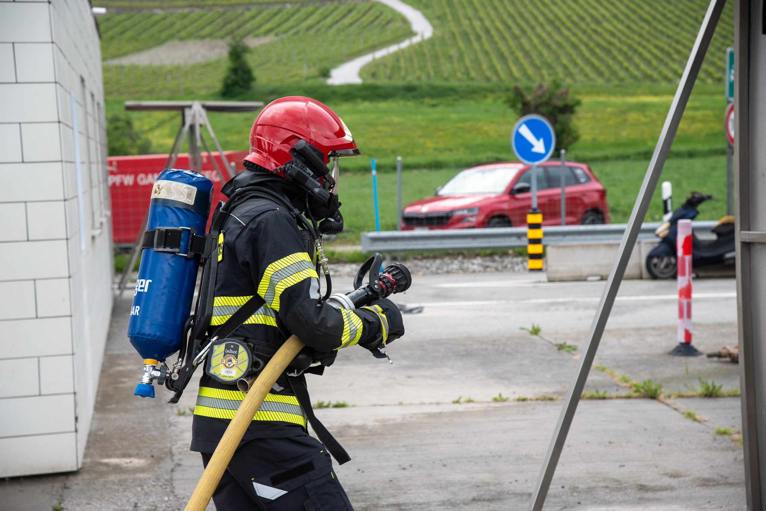 Lieu : Grône • Thèmes : coordination d'équipe, ouverture de porte avec extinction, feu de voiture, désenfumage cage/local, pénétration et extinction