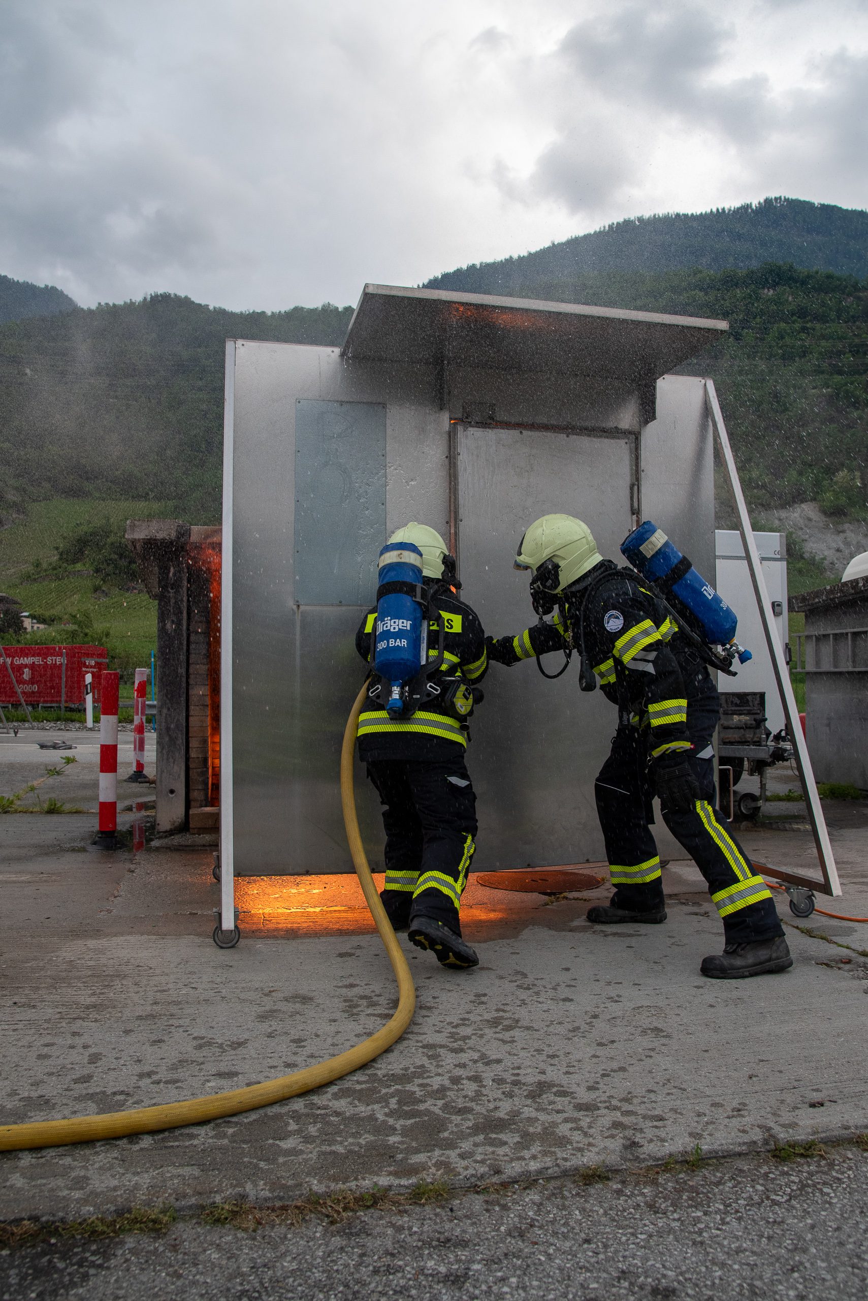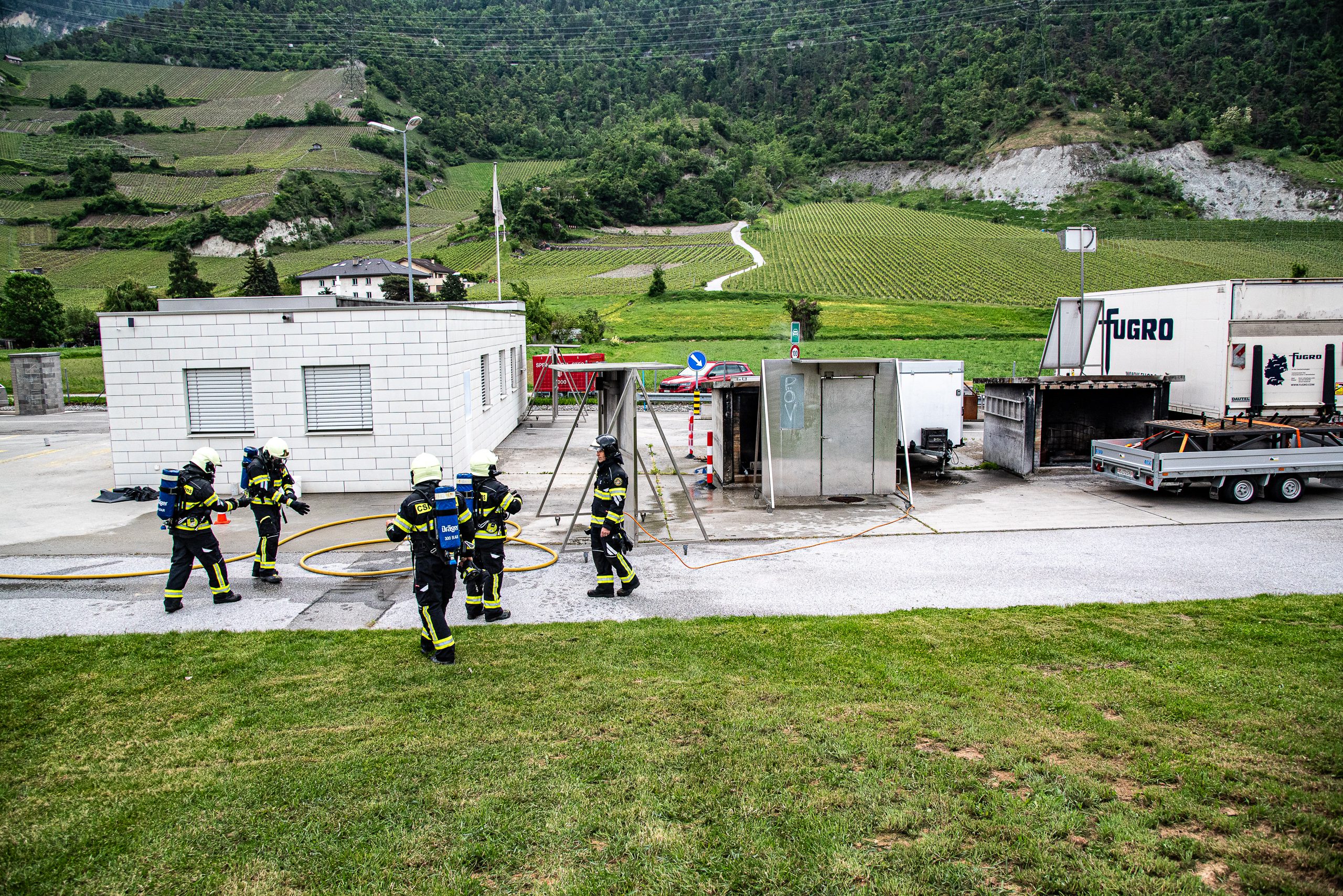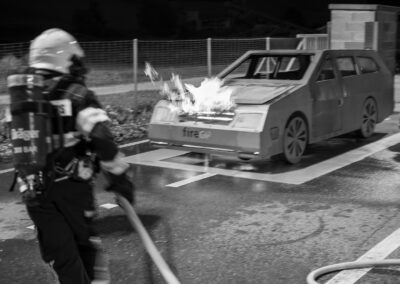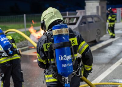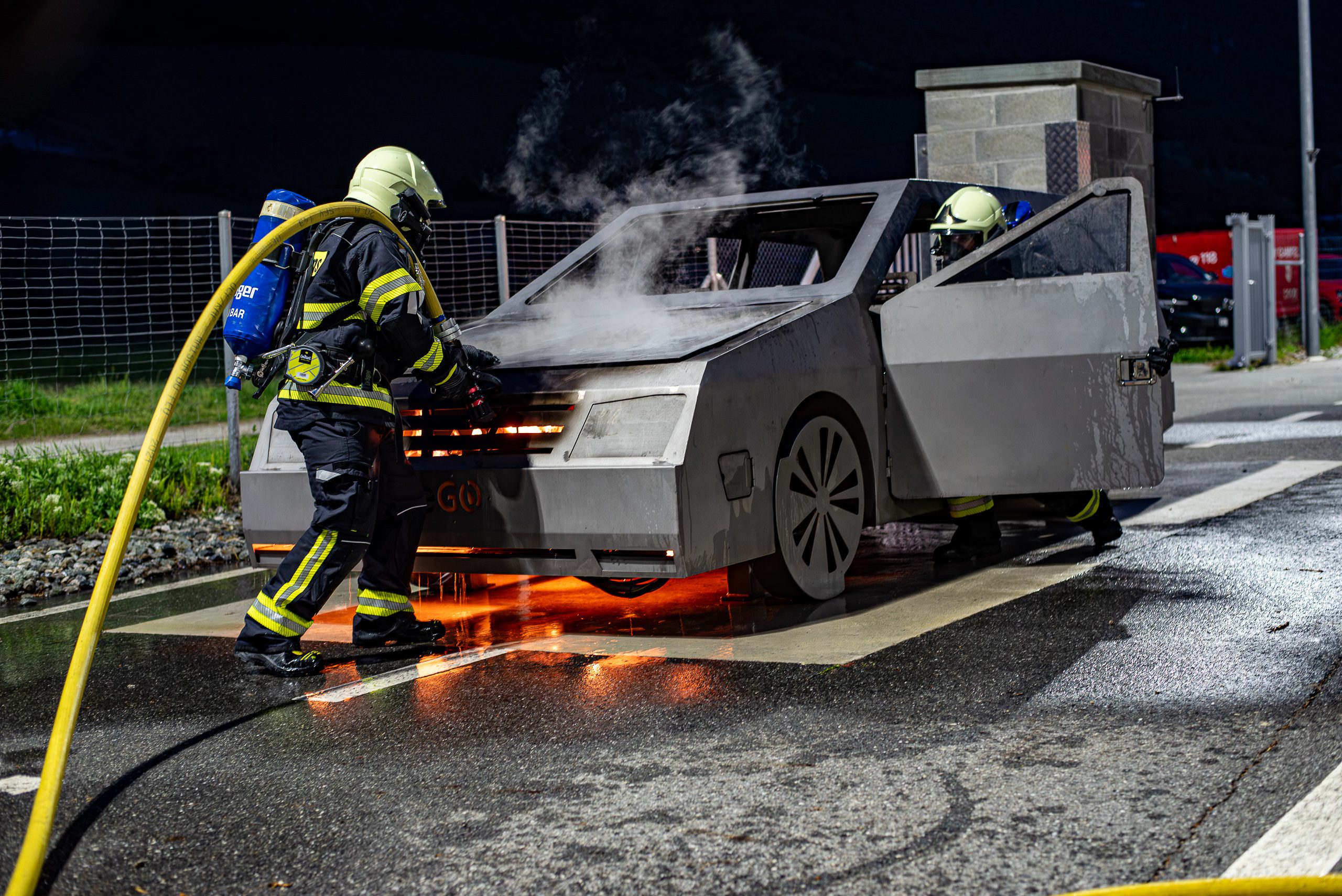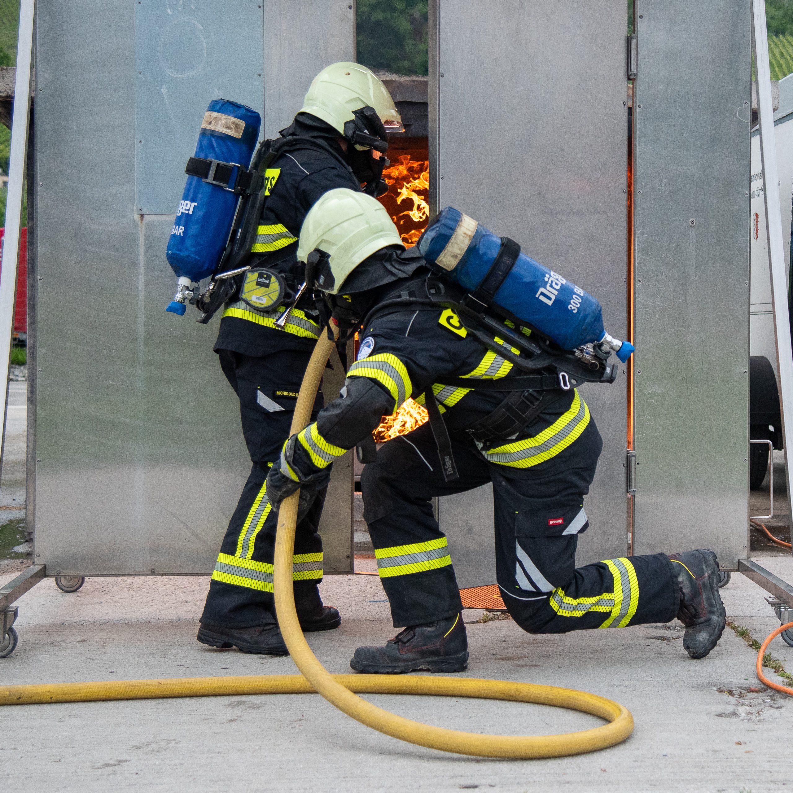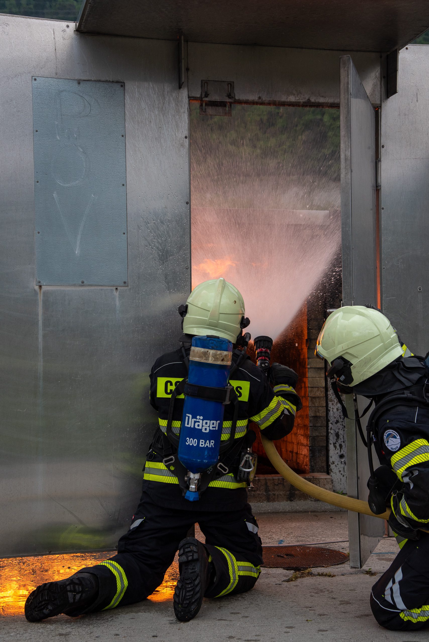 Lieu : Grône • Thèmes : coordination d'équipe, ouverture de porte avec extinction, feu de voiture, désenfumage cage/local, pénétration et extinction