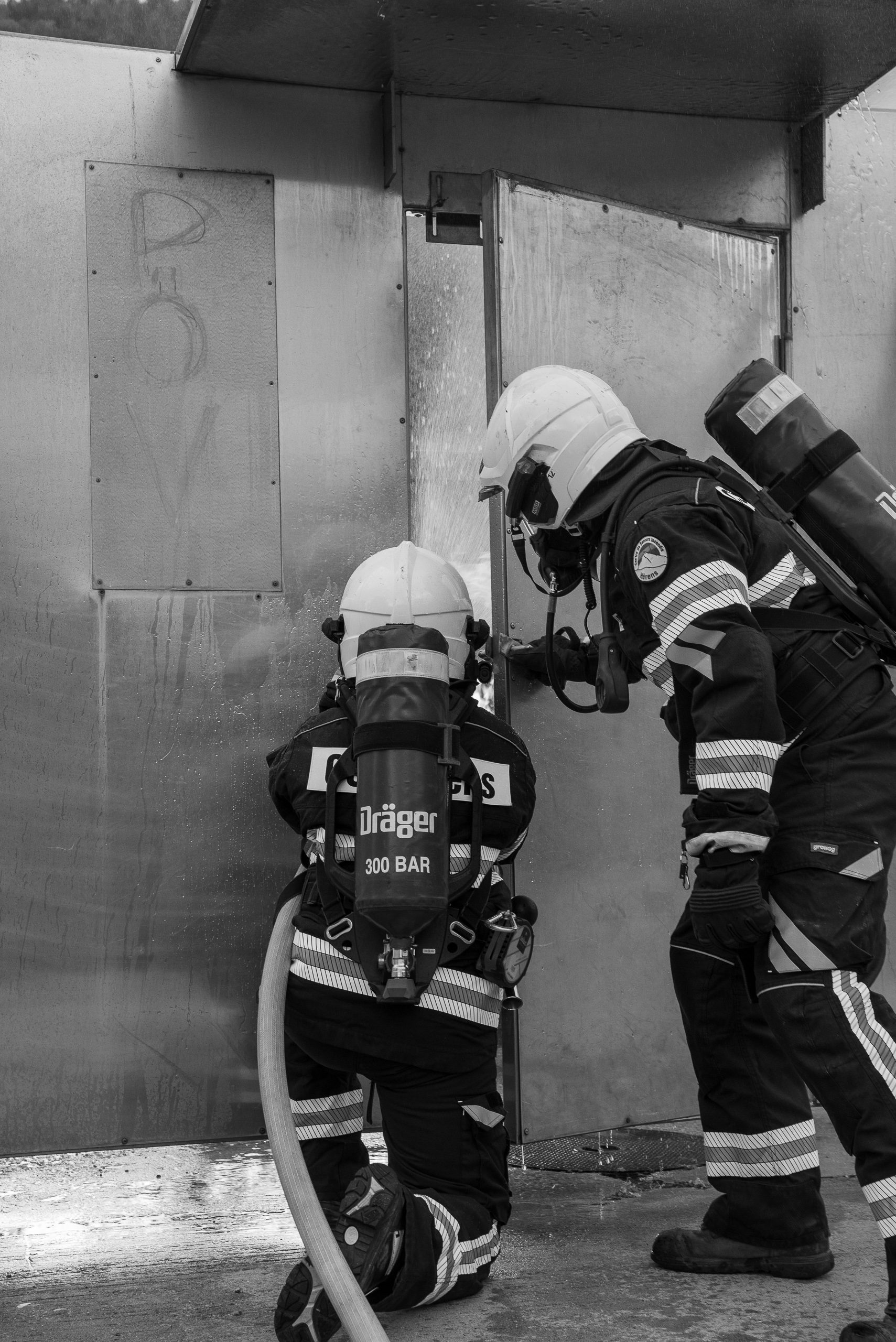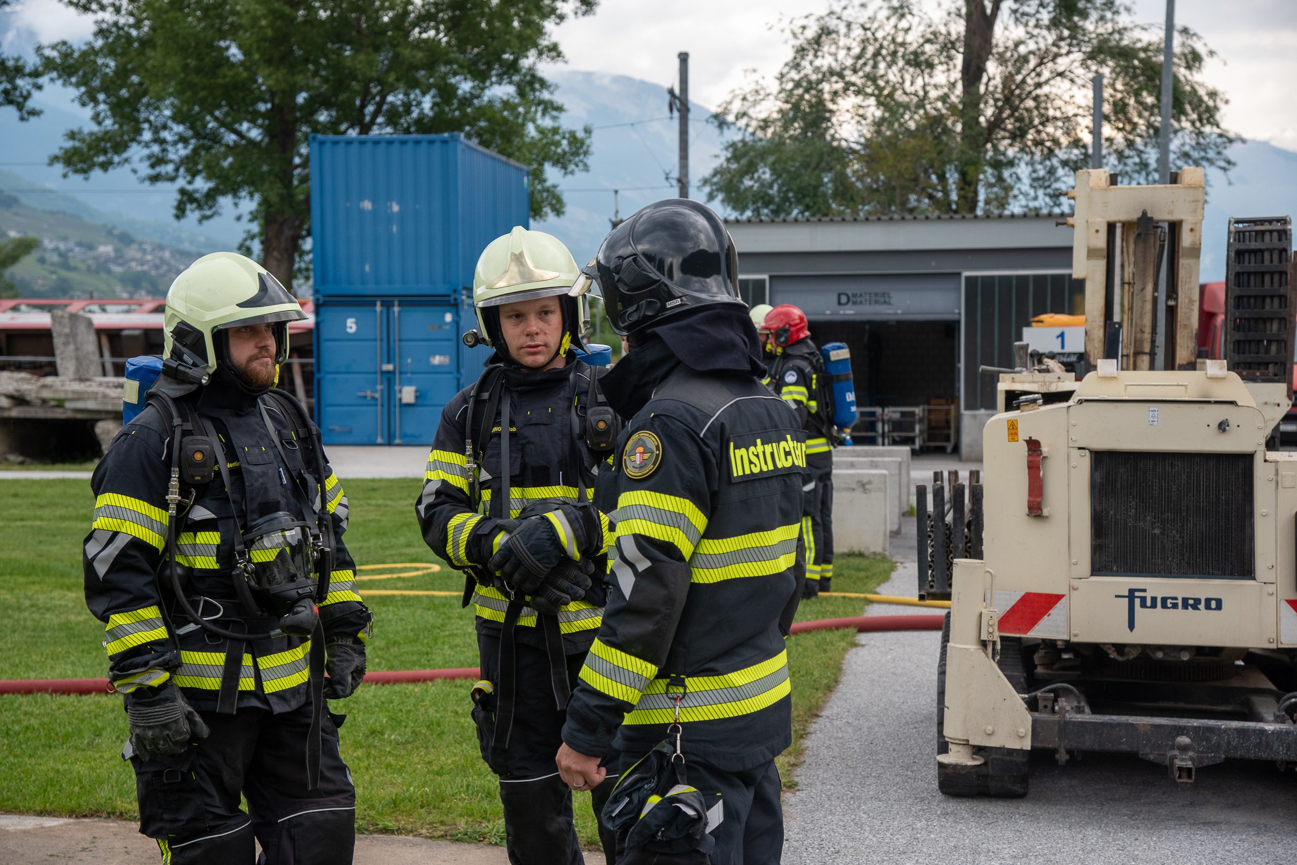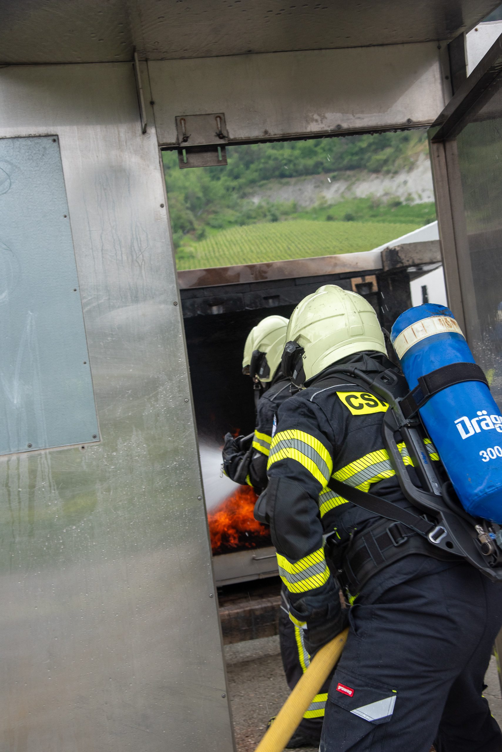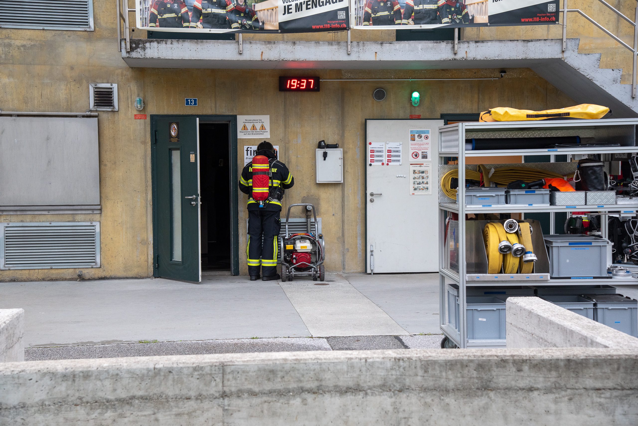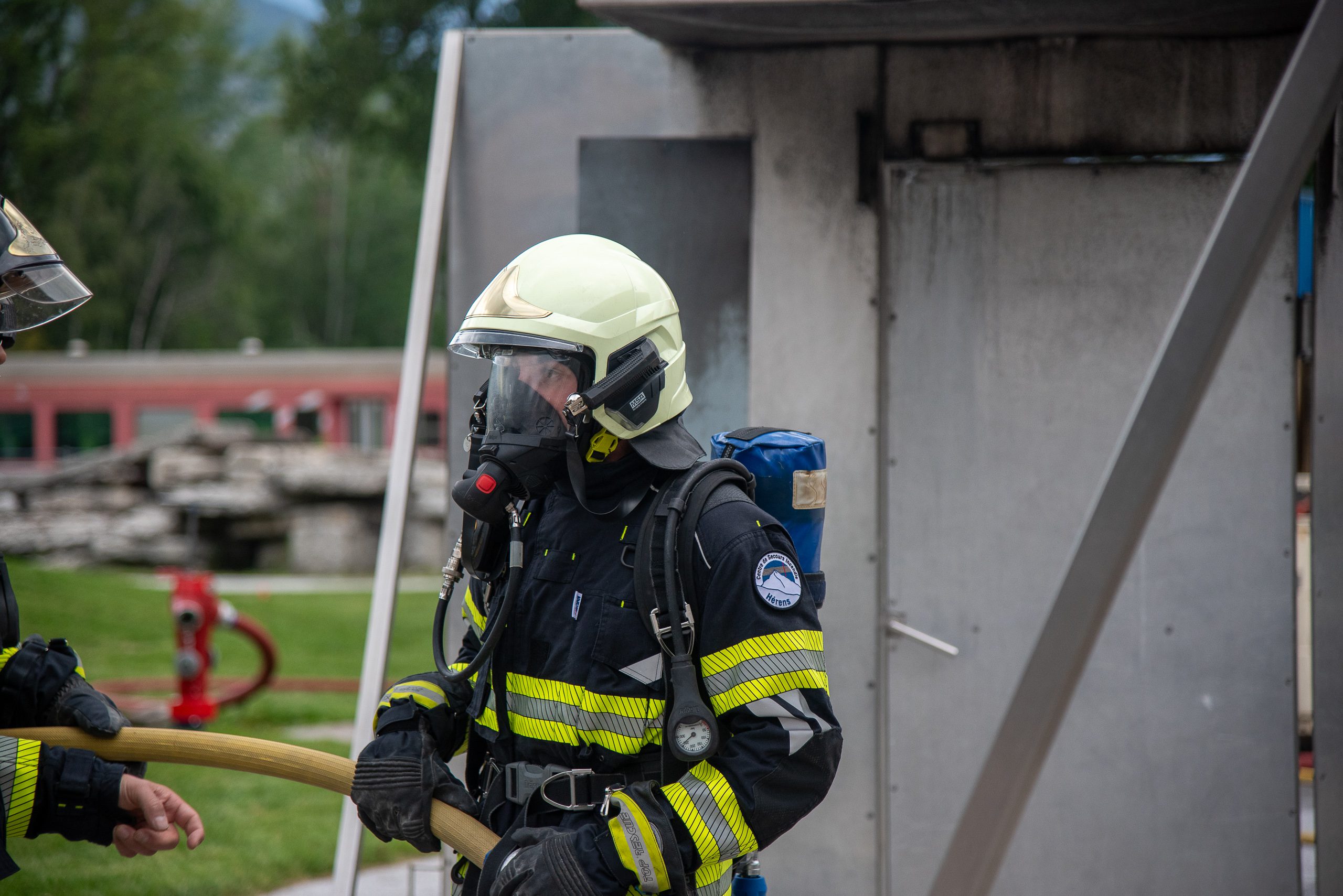 Lieu : Grône • Thèmes : coordination d'équipe, ouverture de porte avec extinction, feu de voiture, désenfumage cage/local, pénétration et extinction