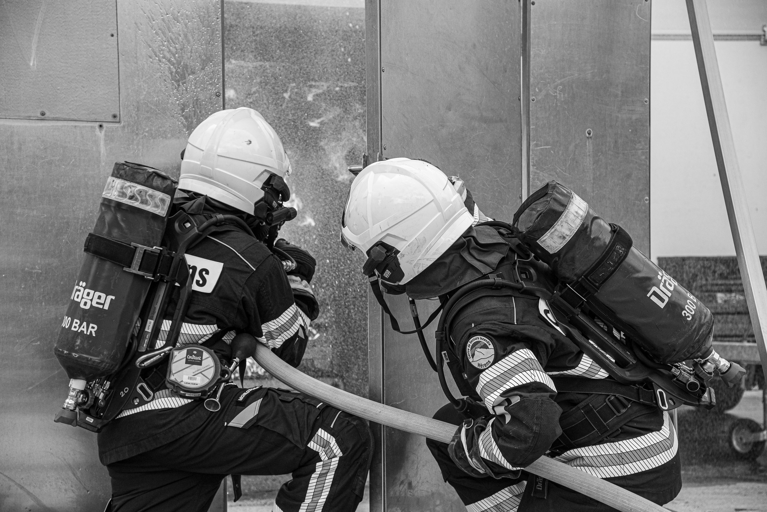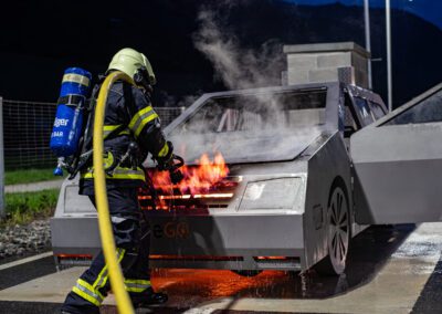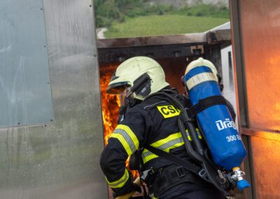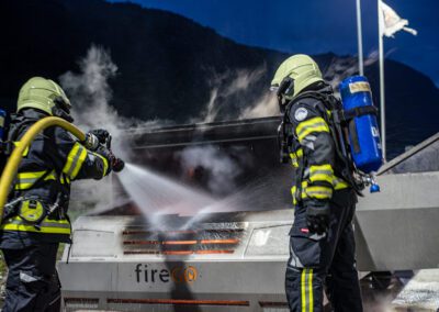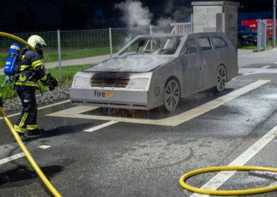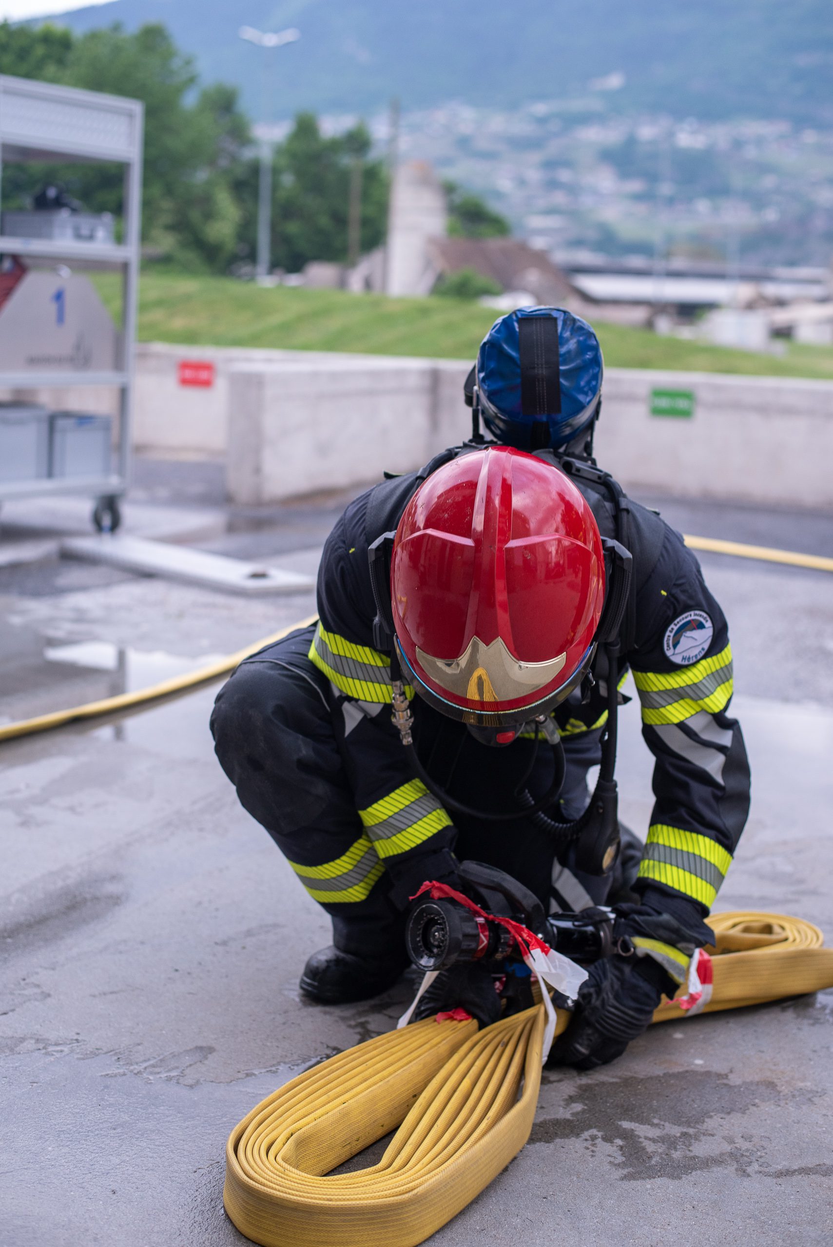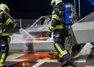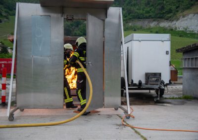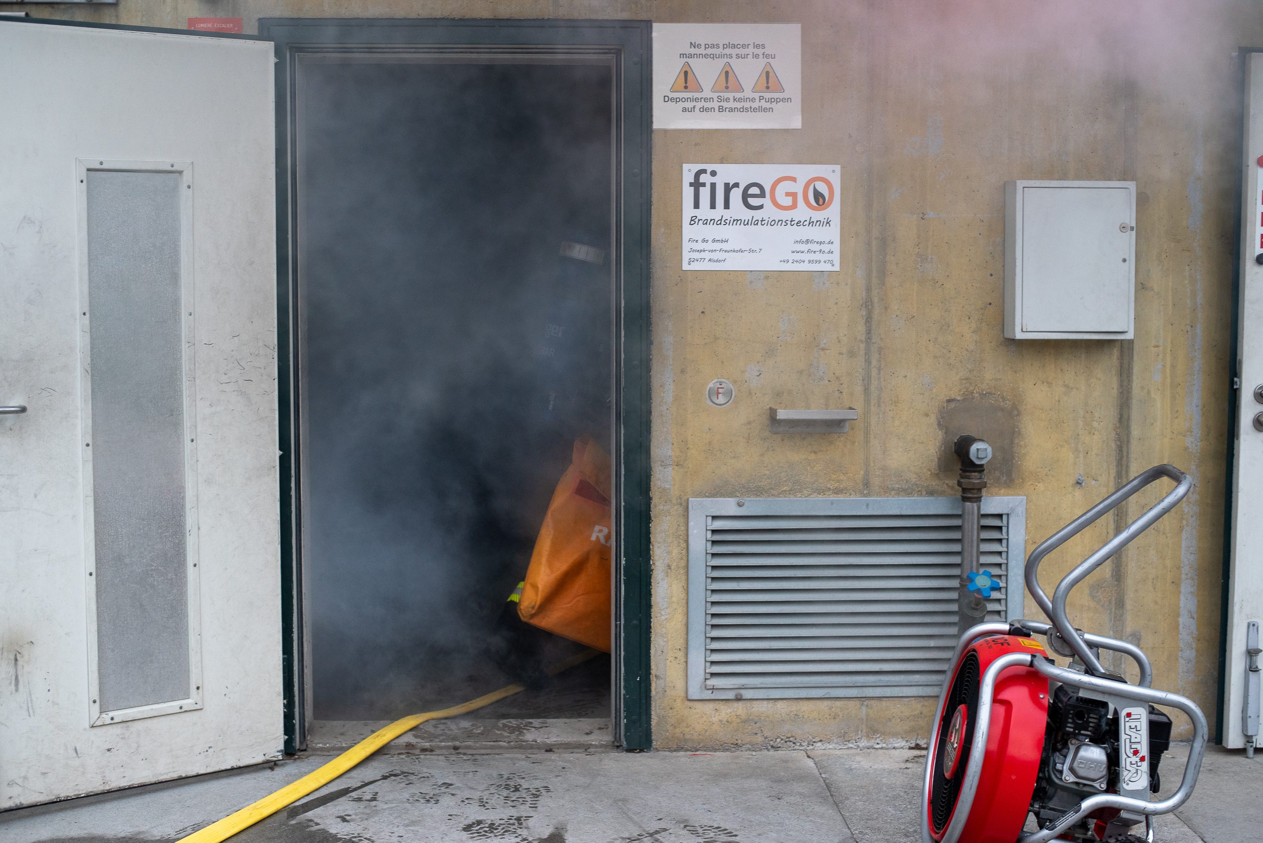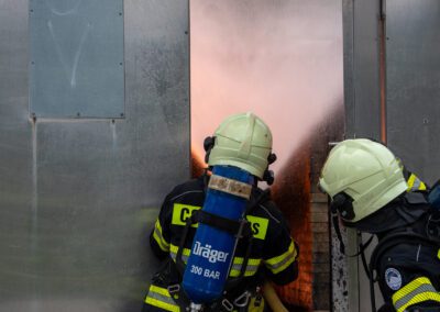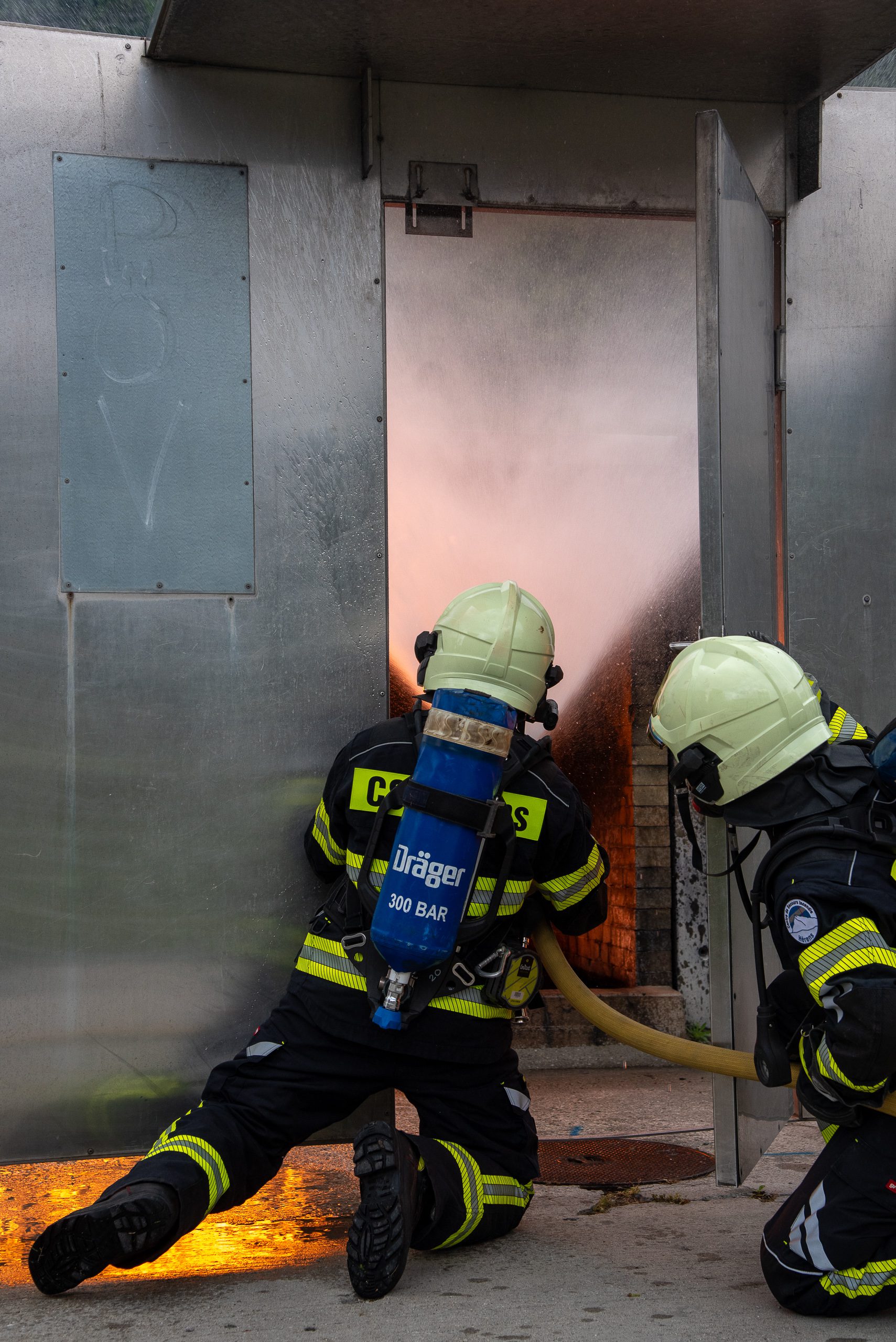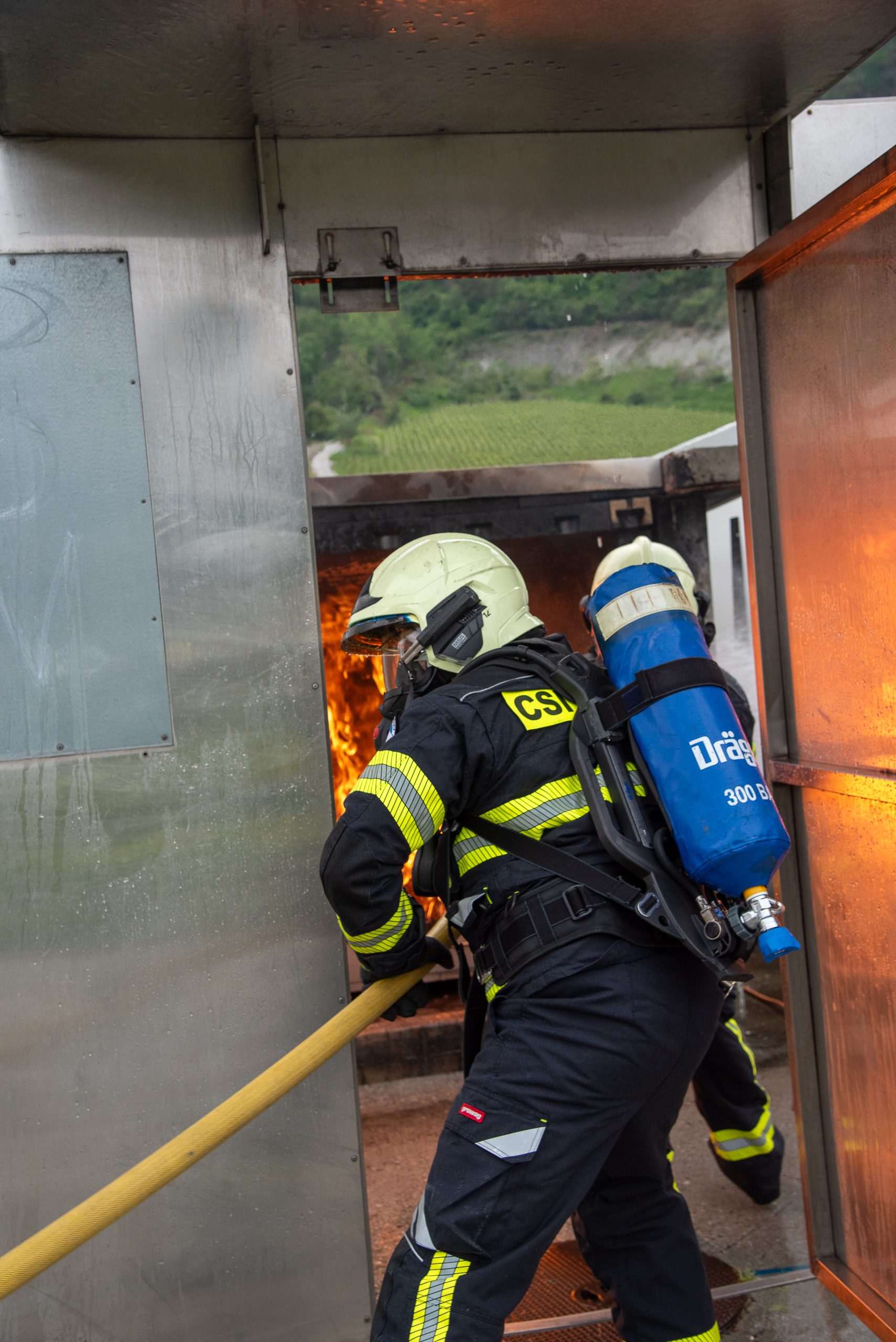 Lieu : Grône • Thèmes : coordination d'équipe, ouverture de porte avec extinction, feu de voiture, désenfumage cage/local, pénétration et extinction