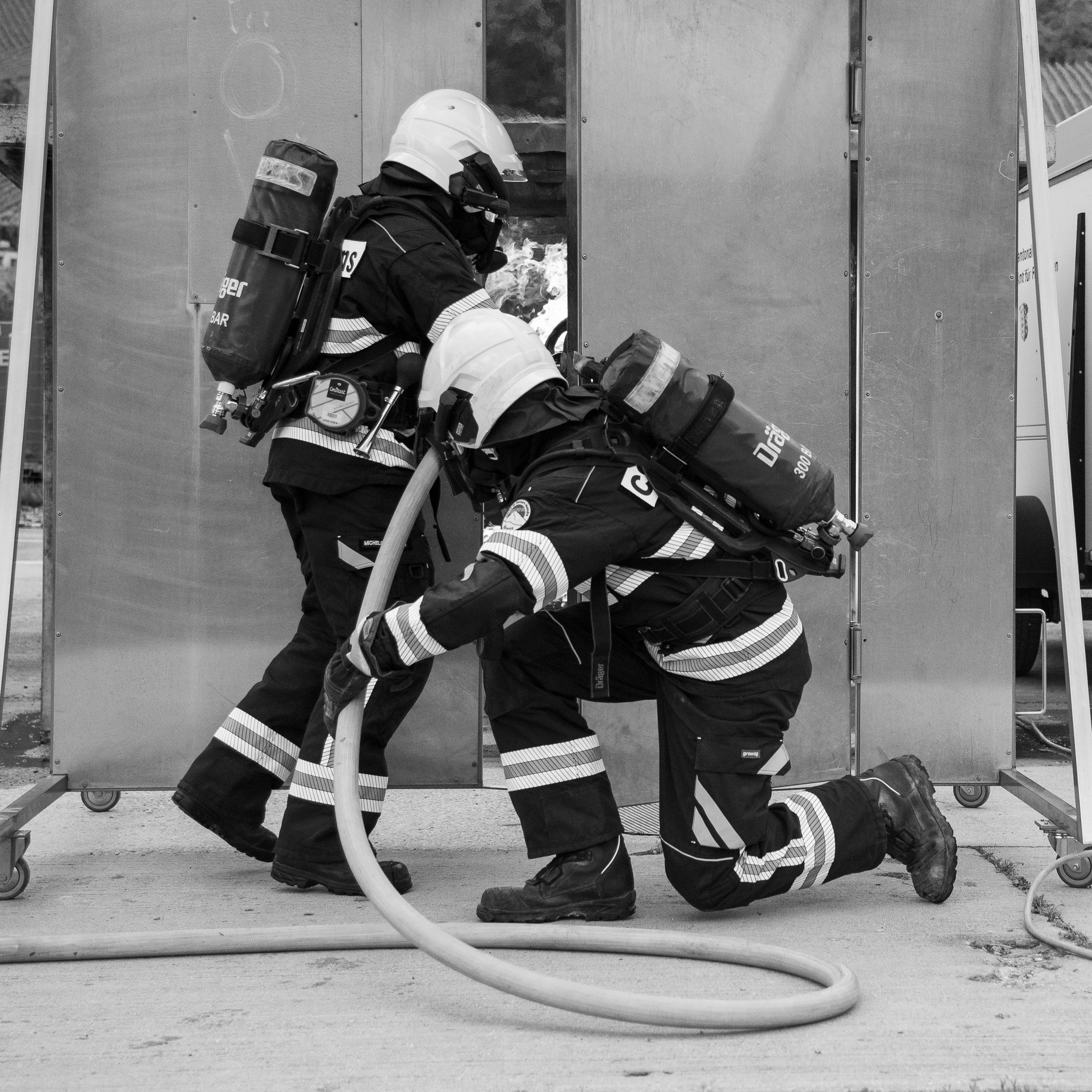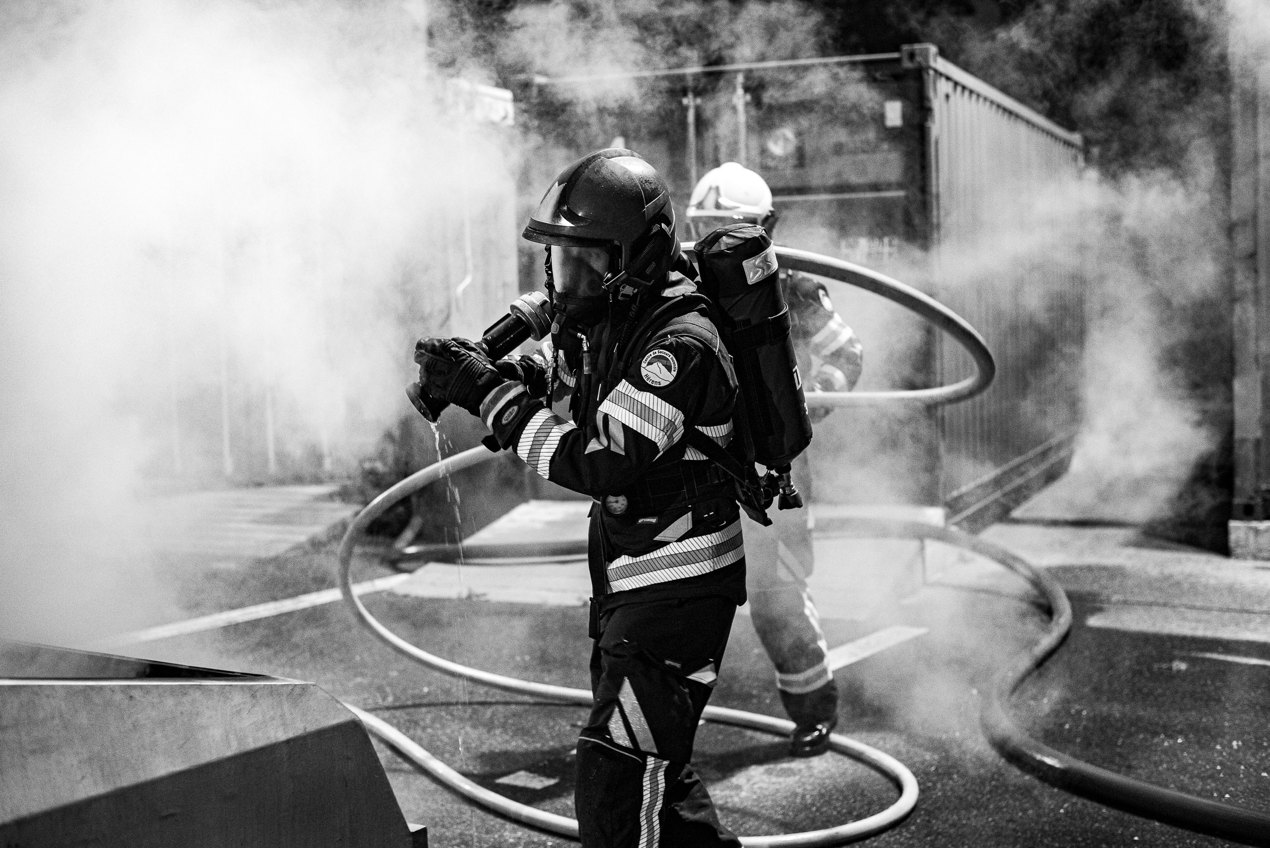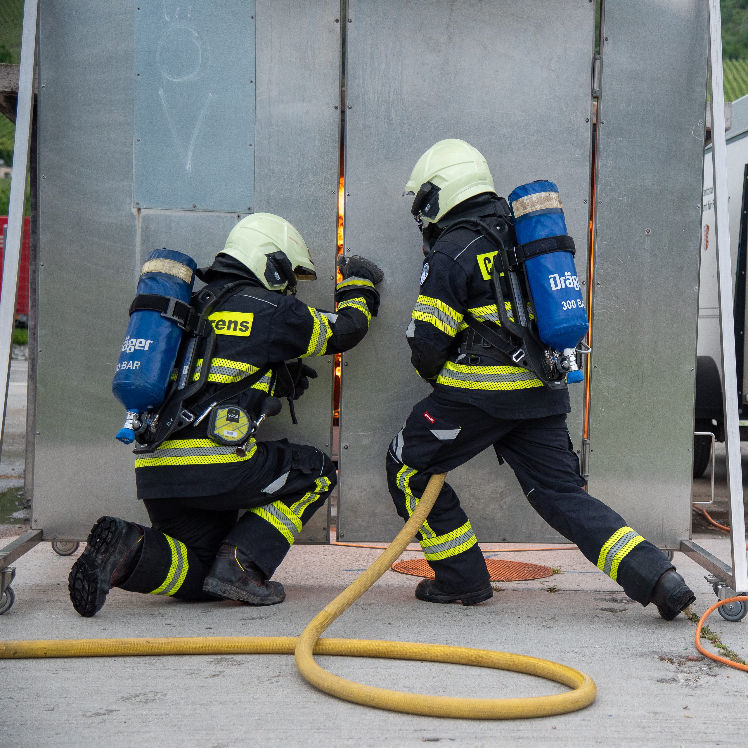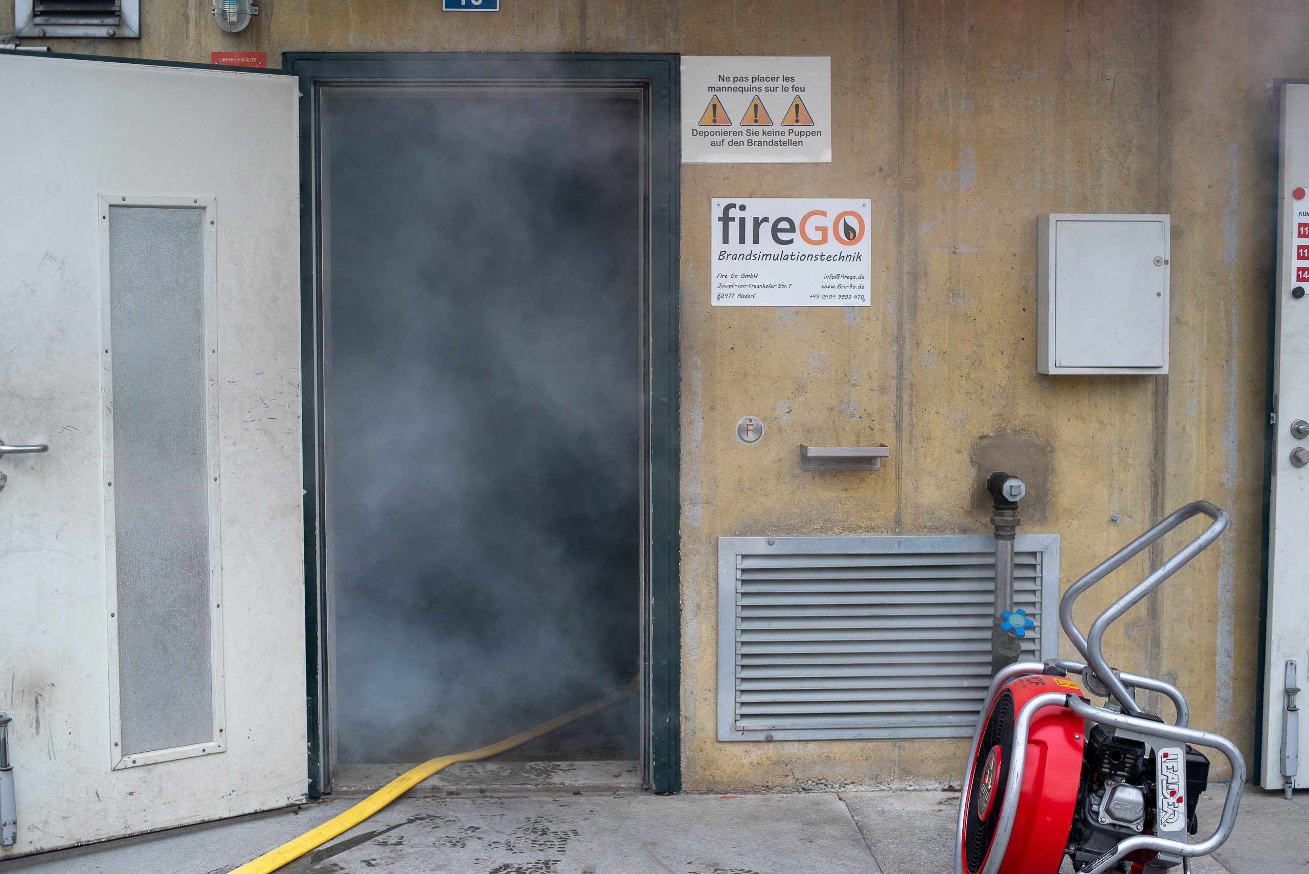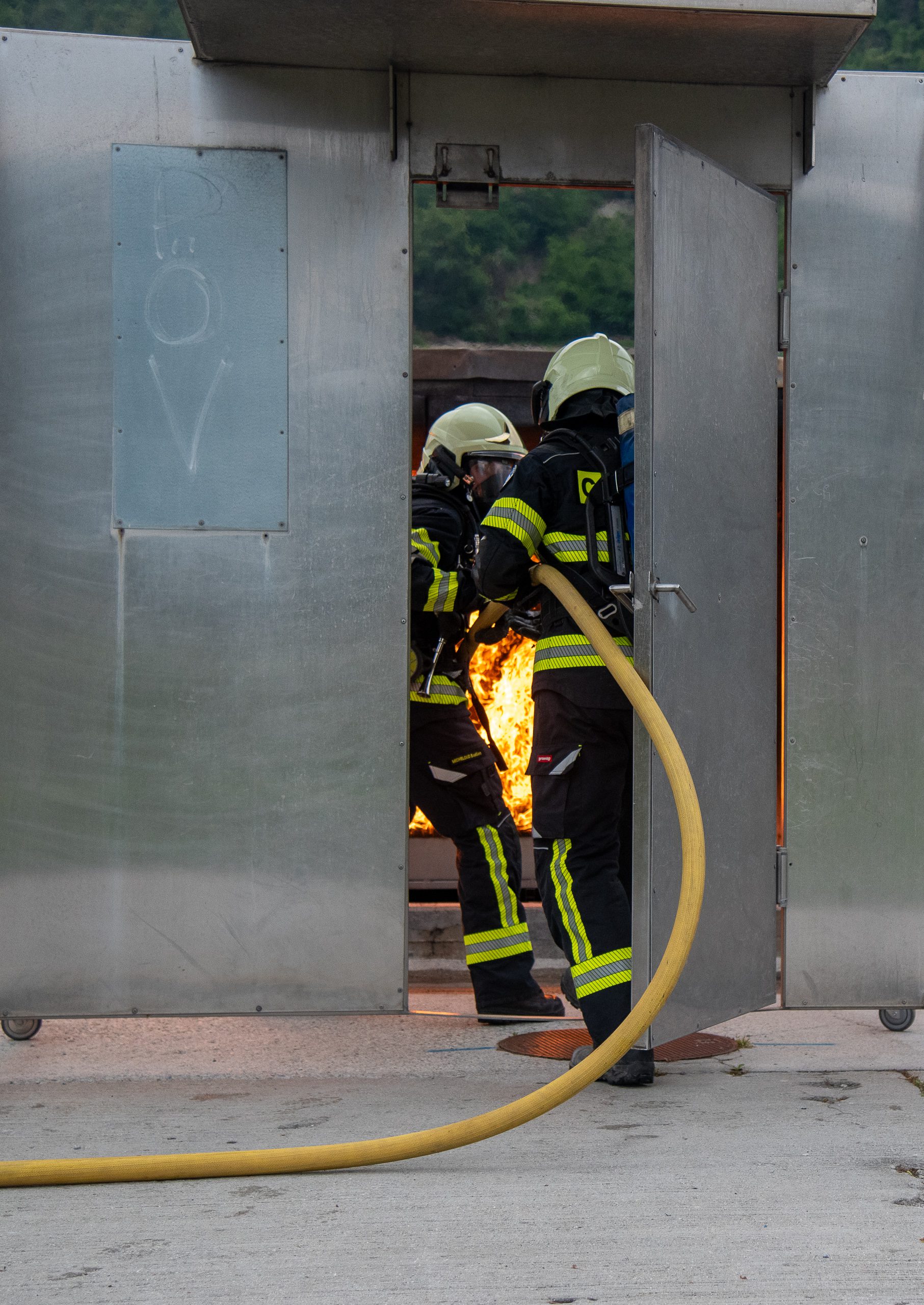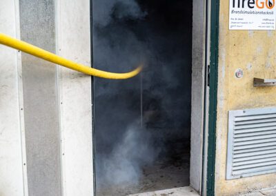 Lieu : Grône • Thèmes : coordination d'équipe, ouverture de porte avec extinction, feu de voiture, désenfumage cage/local, pénétration et extinction