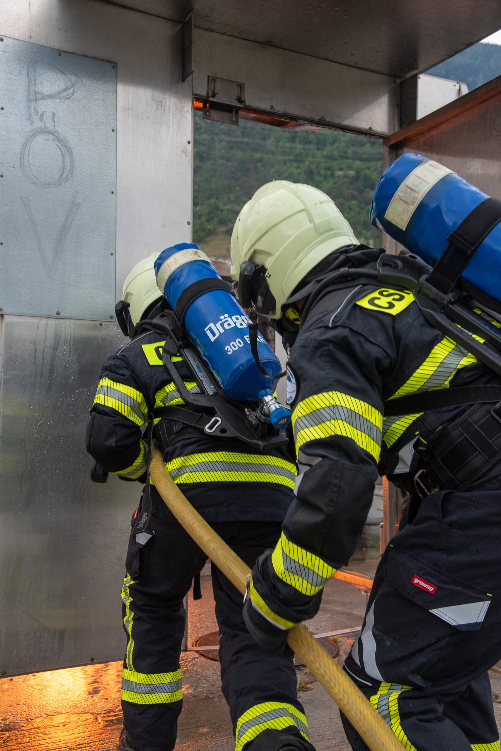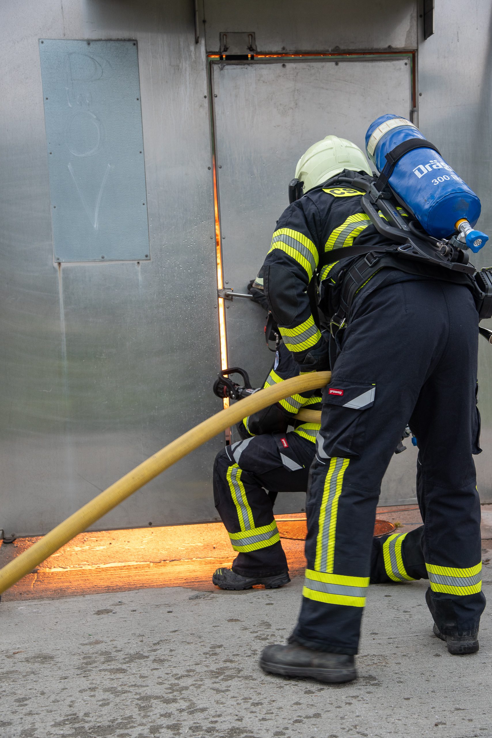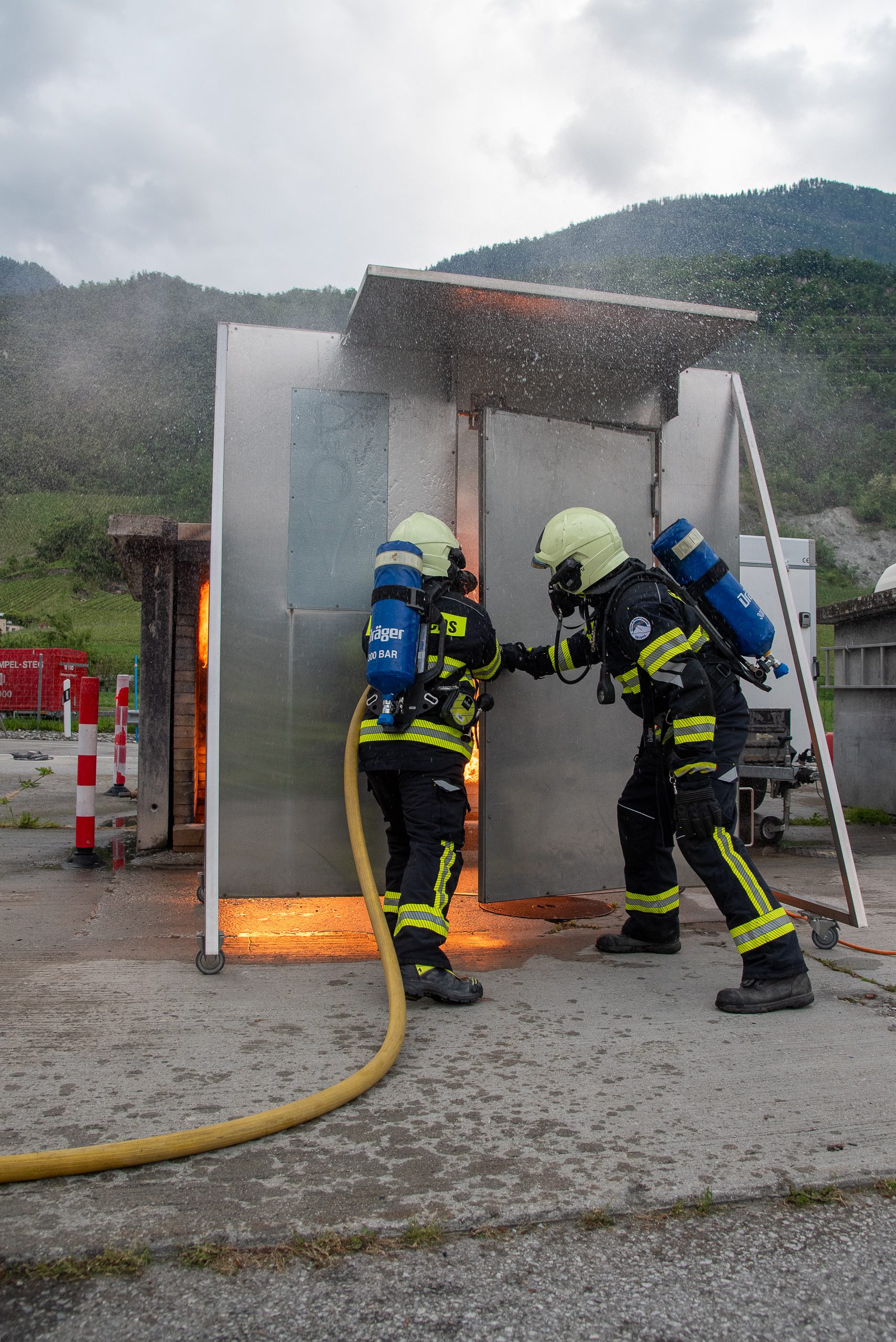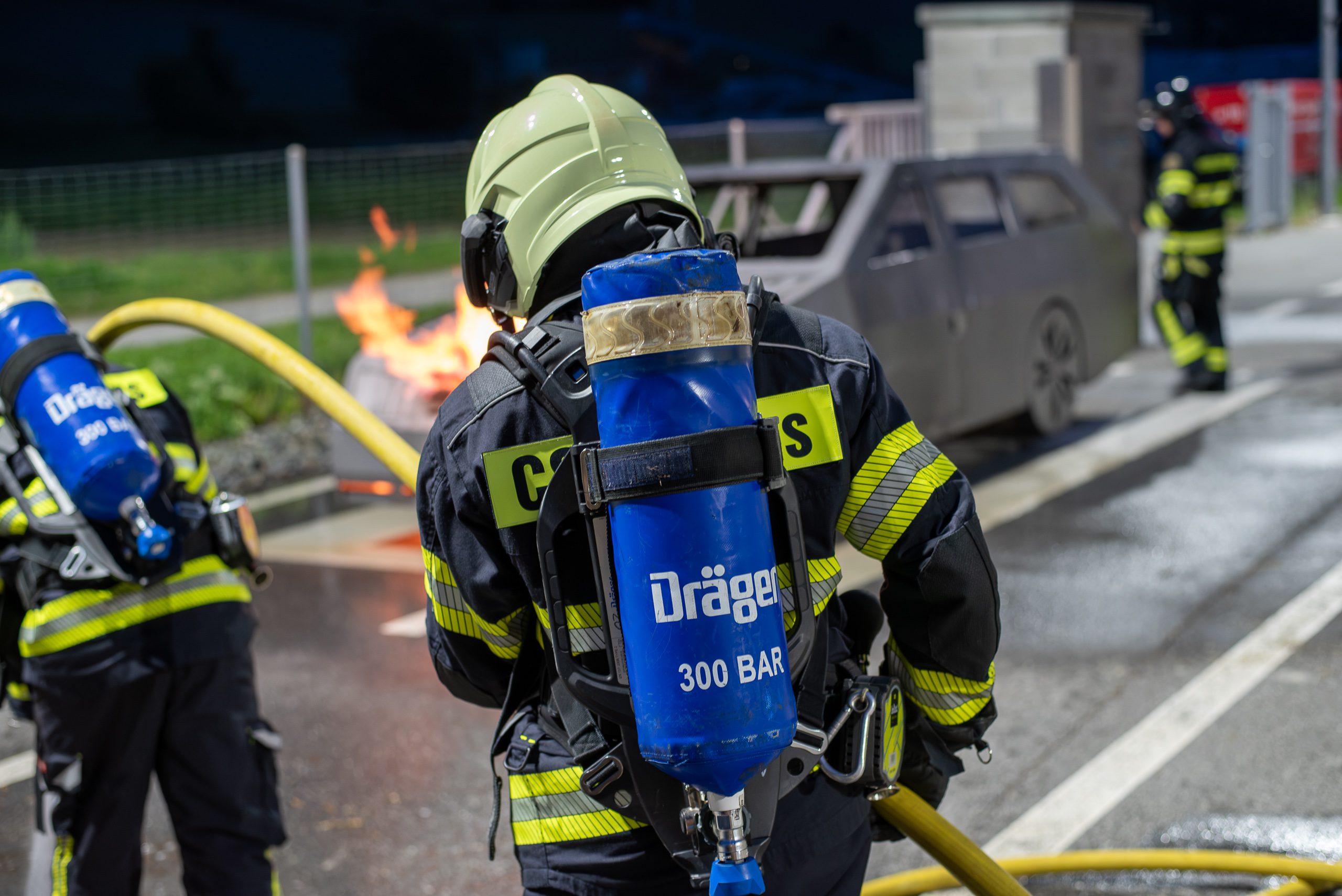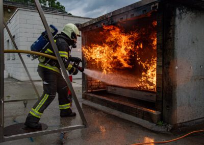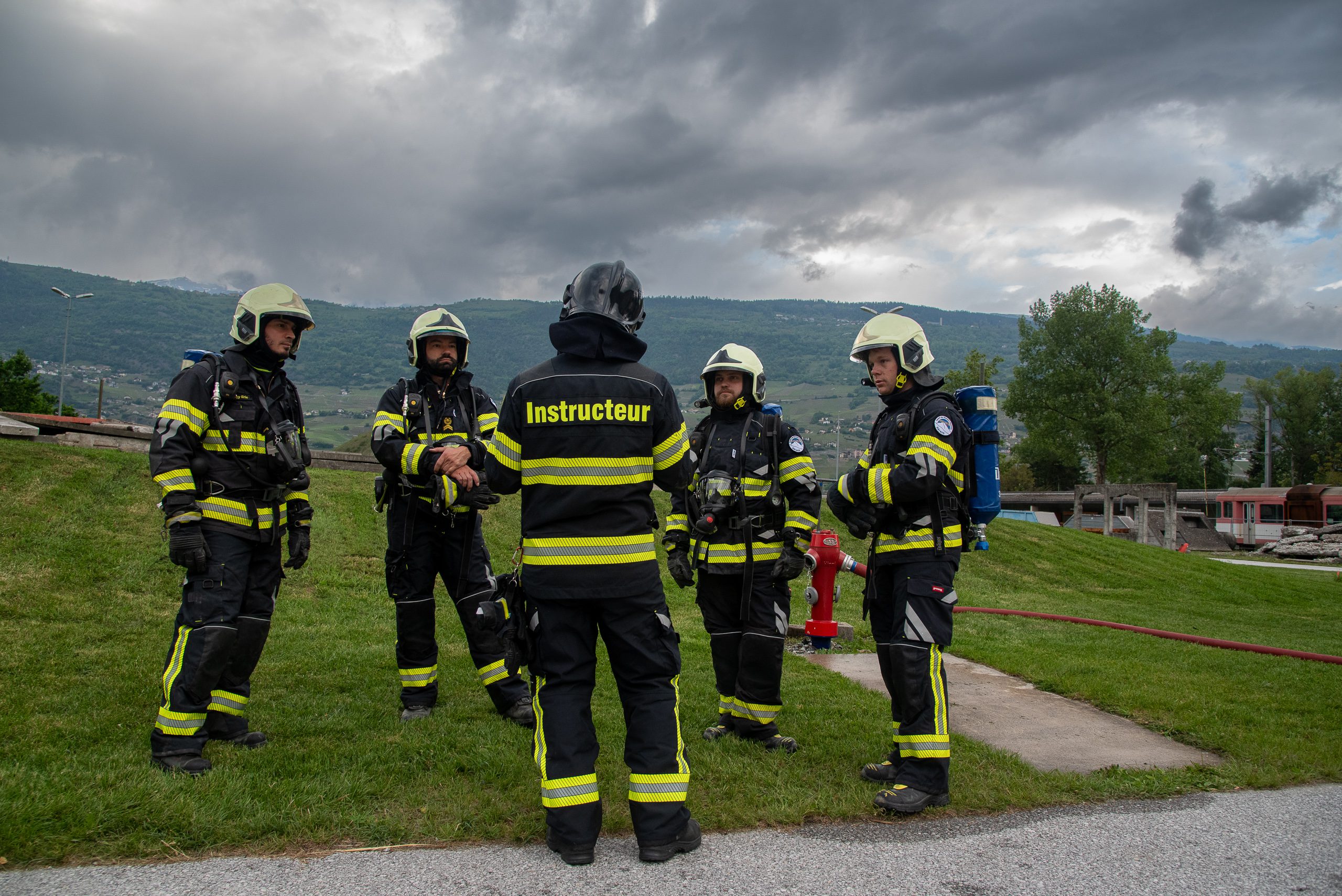 Lieu : Grône • Thèmes : coordination d'équipe, ouverture de porte avec extinction, feu de voiture, désenfumage cage/local, pénétration et extinction