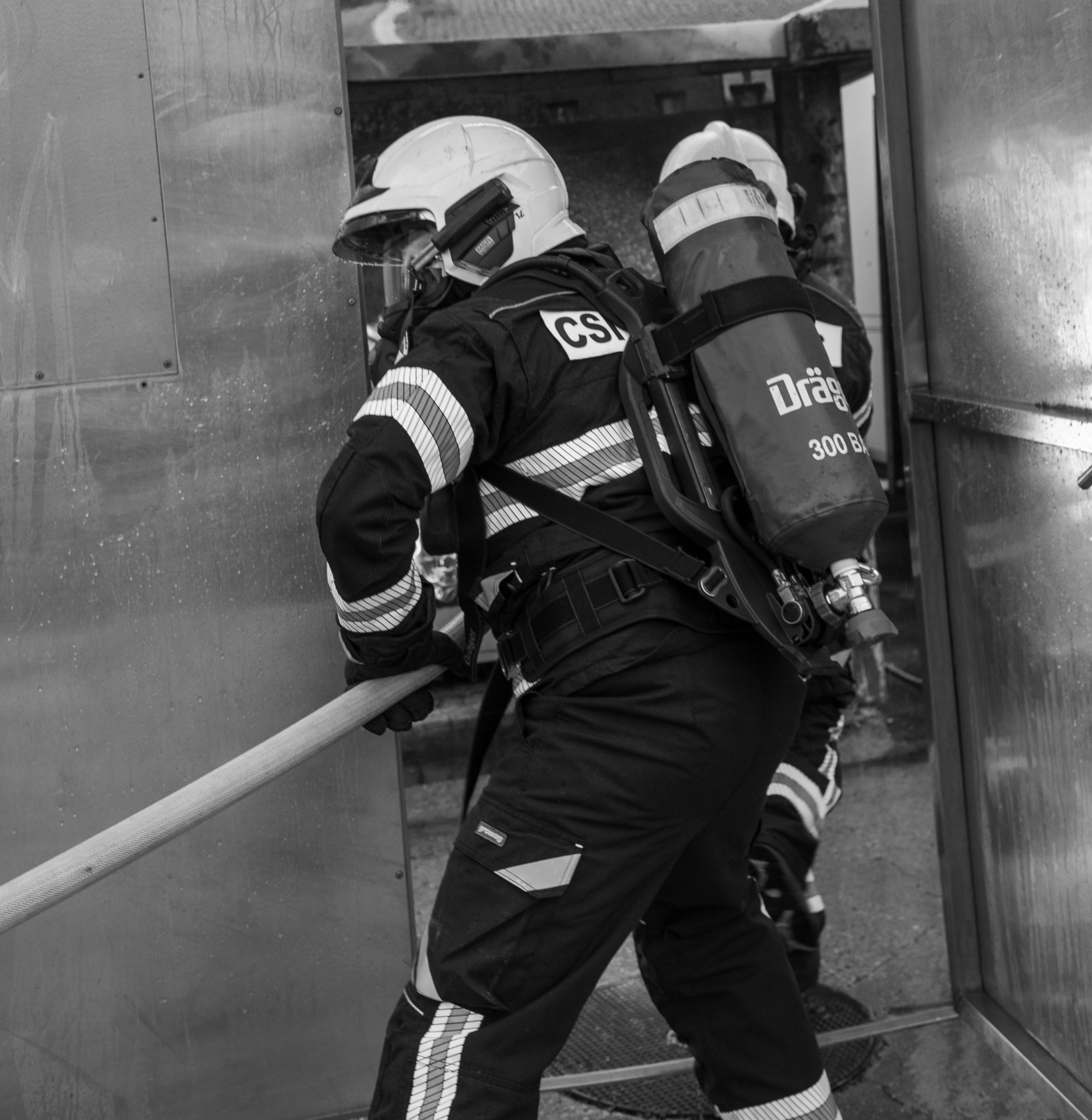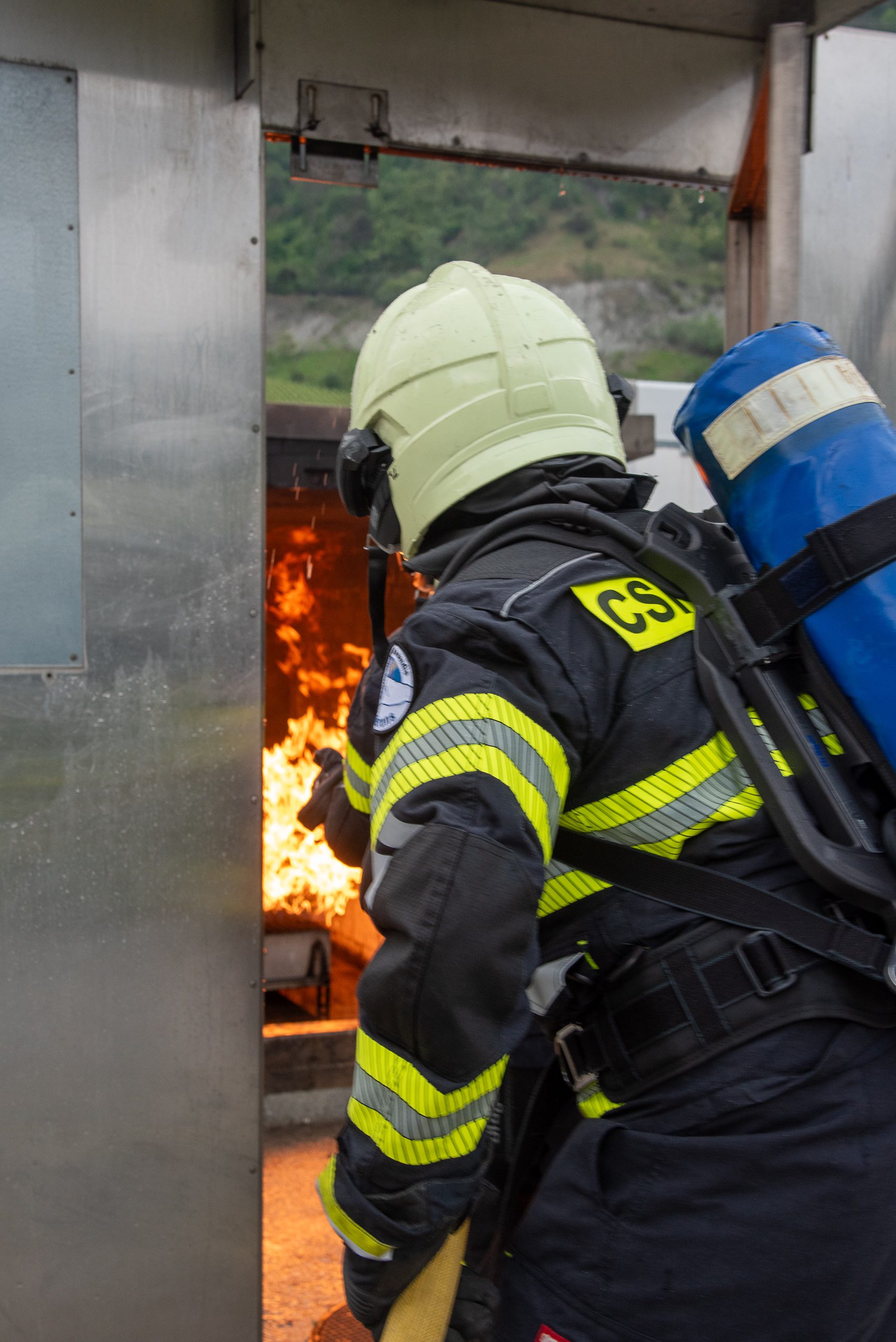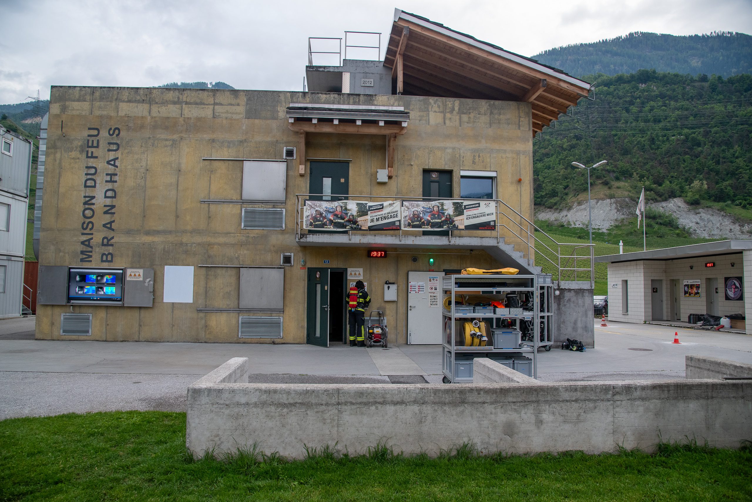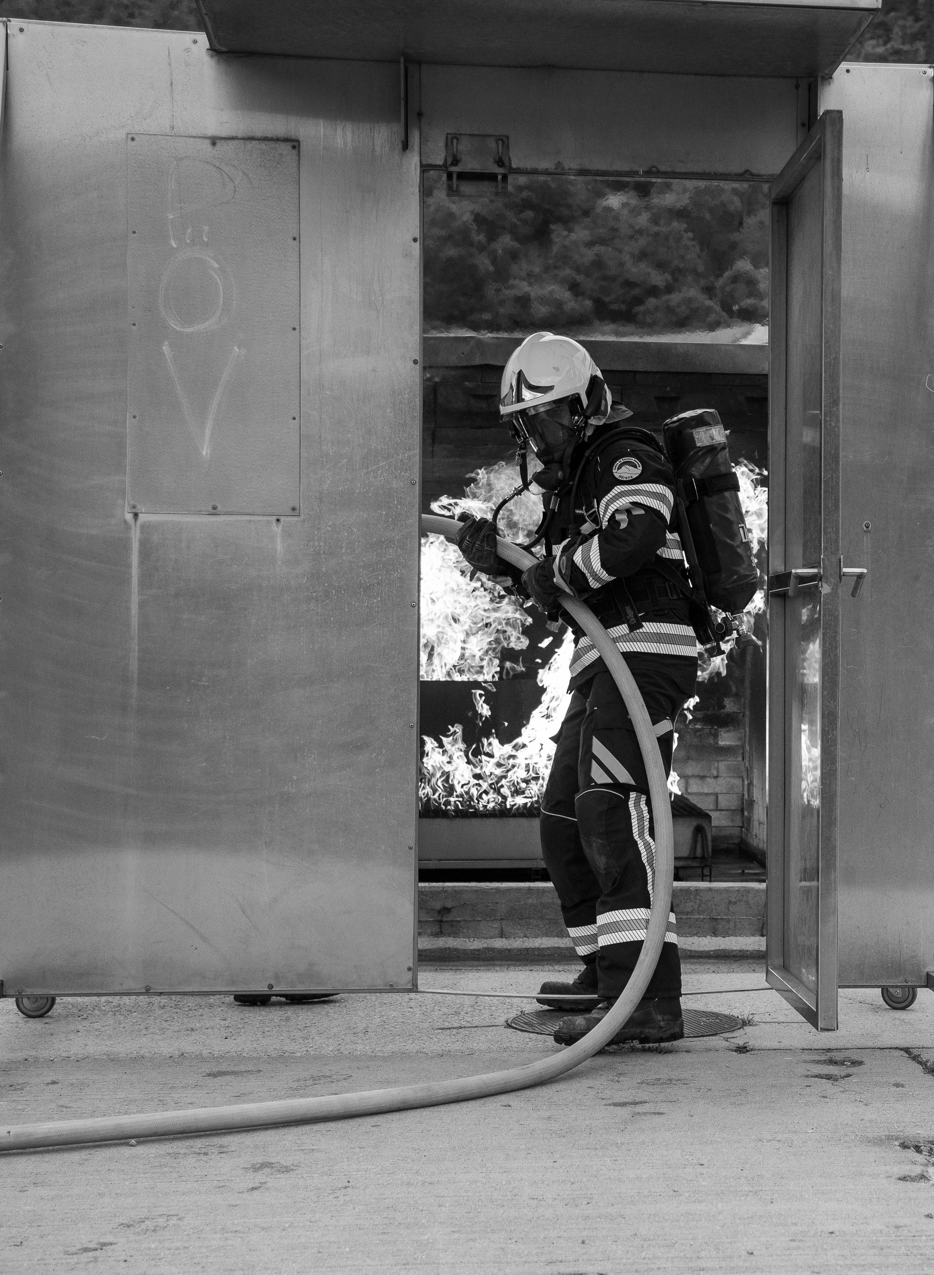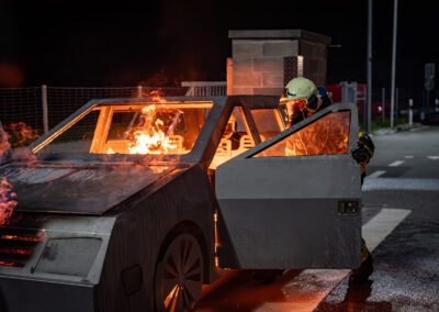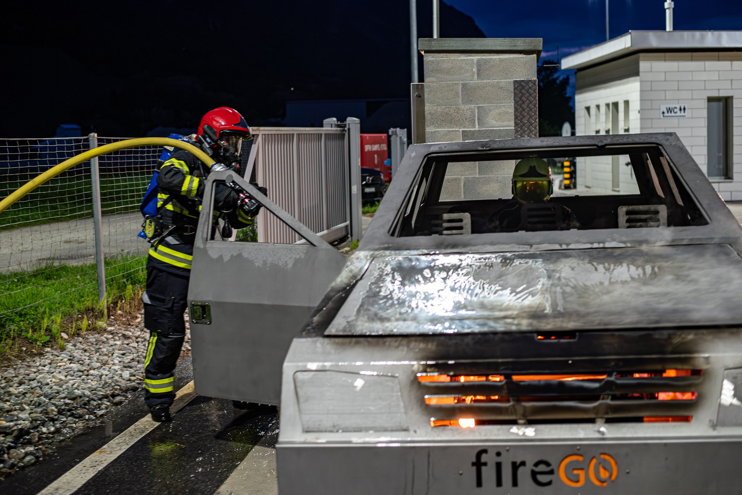 Lieu : Grône • Thèmes : coordination d'équipe, ouverture de porte avec extinction, feu de voiture, désenfumage cage/local, pénétration et extinction