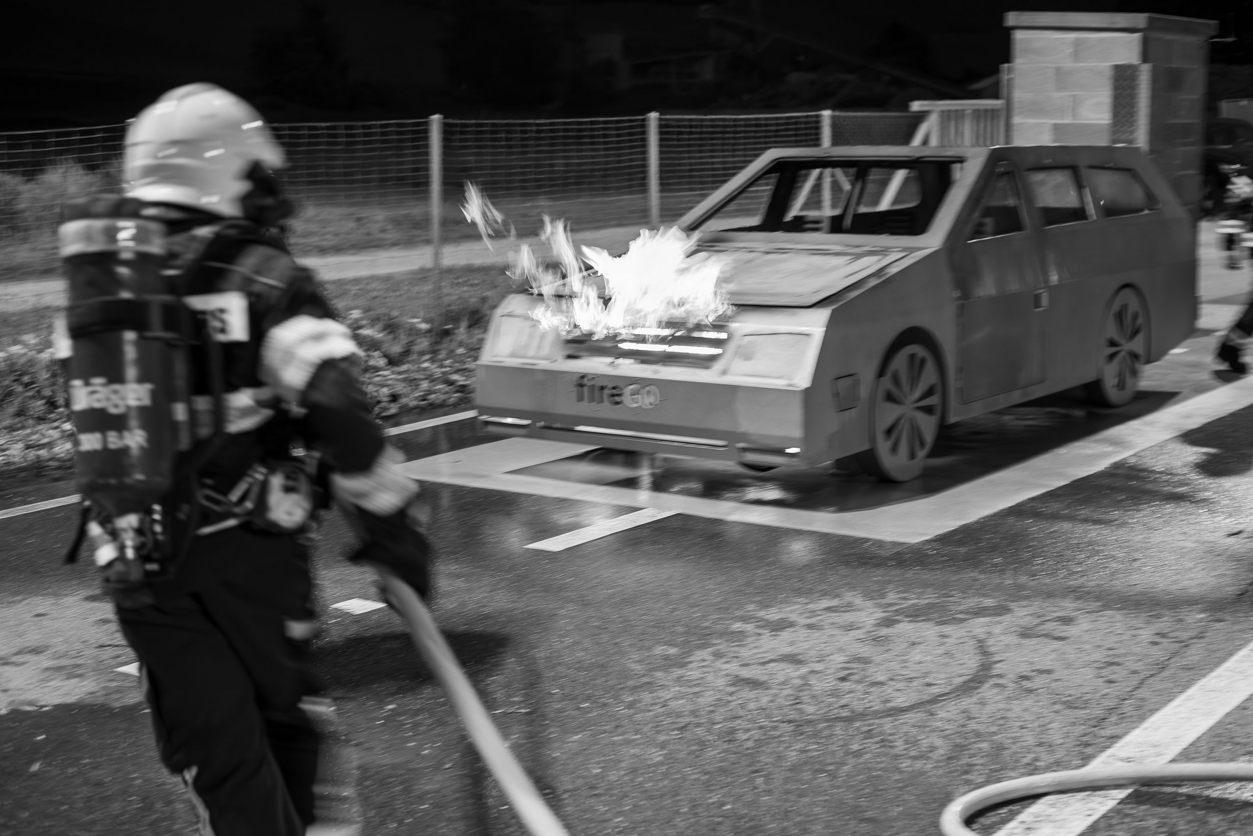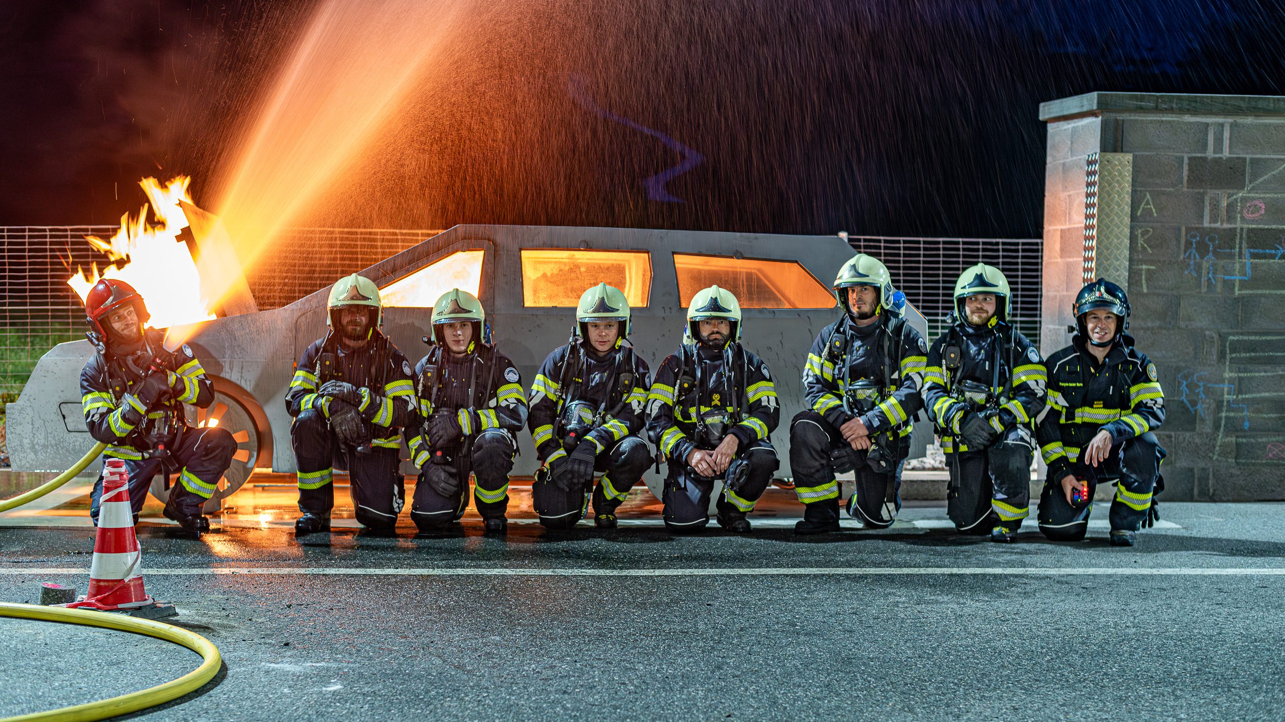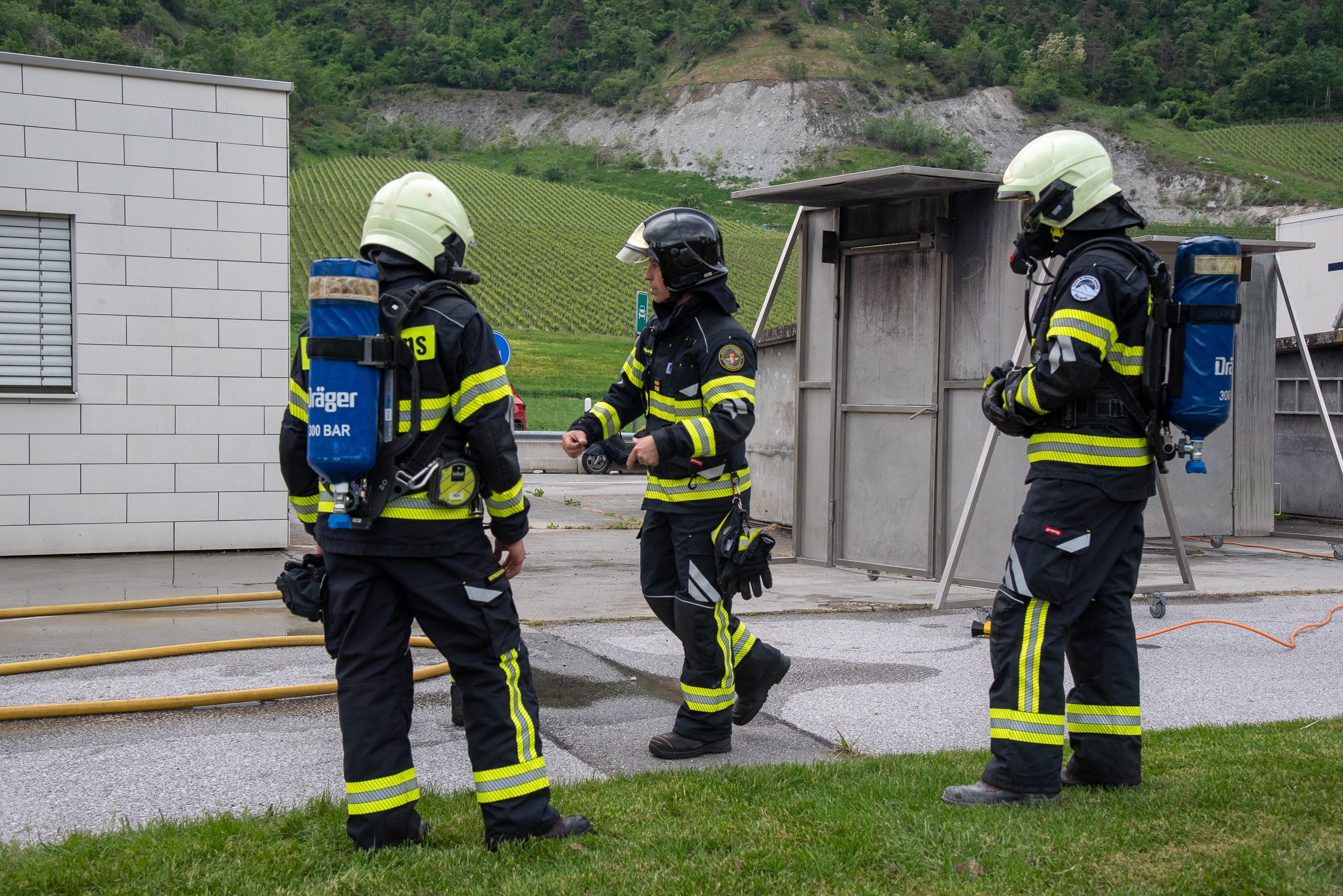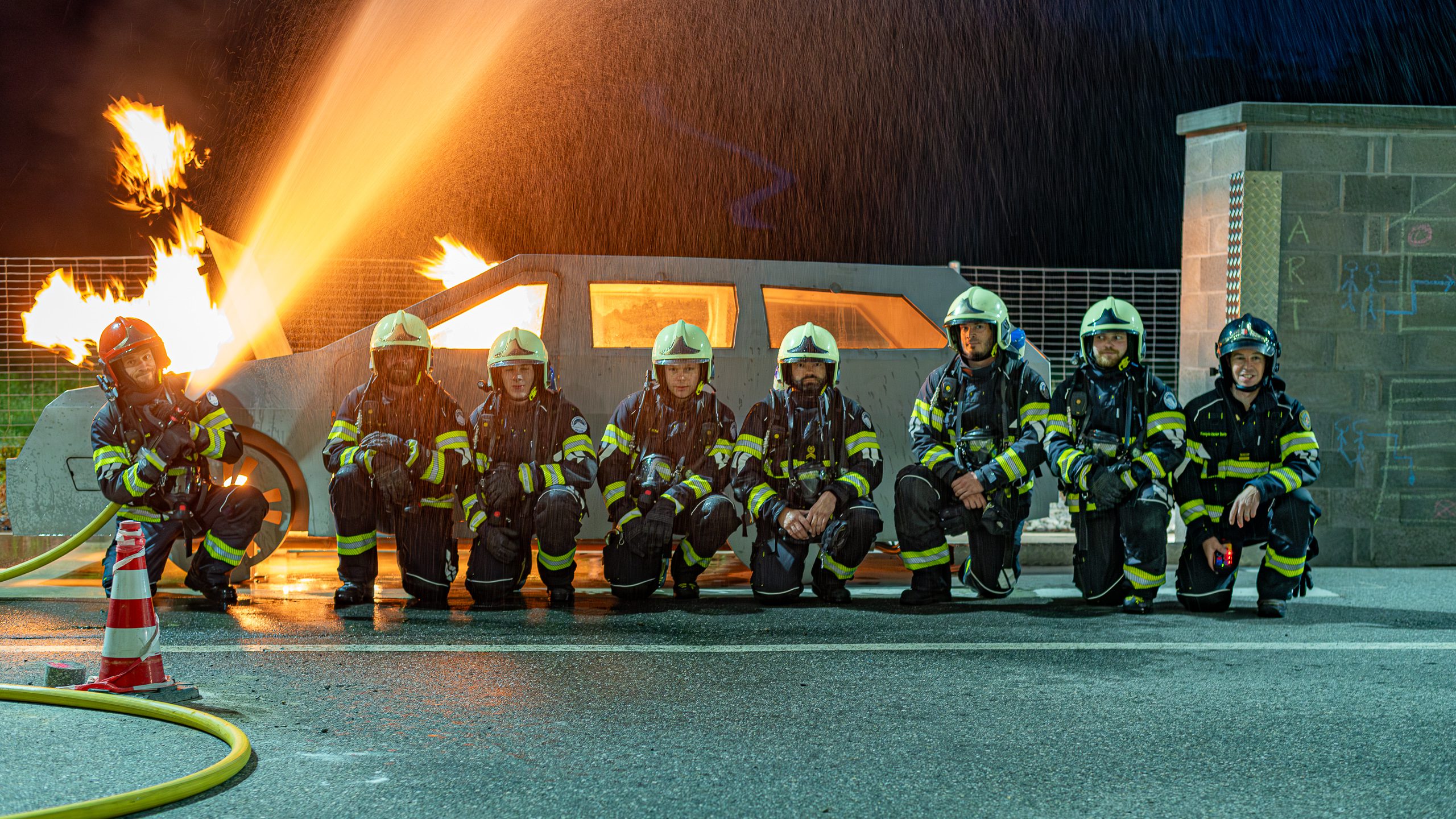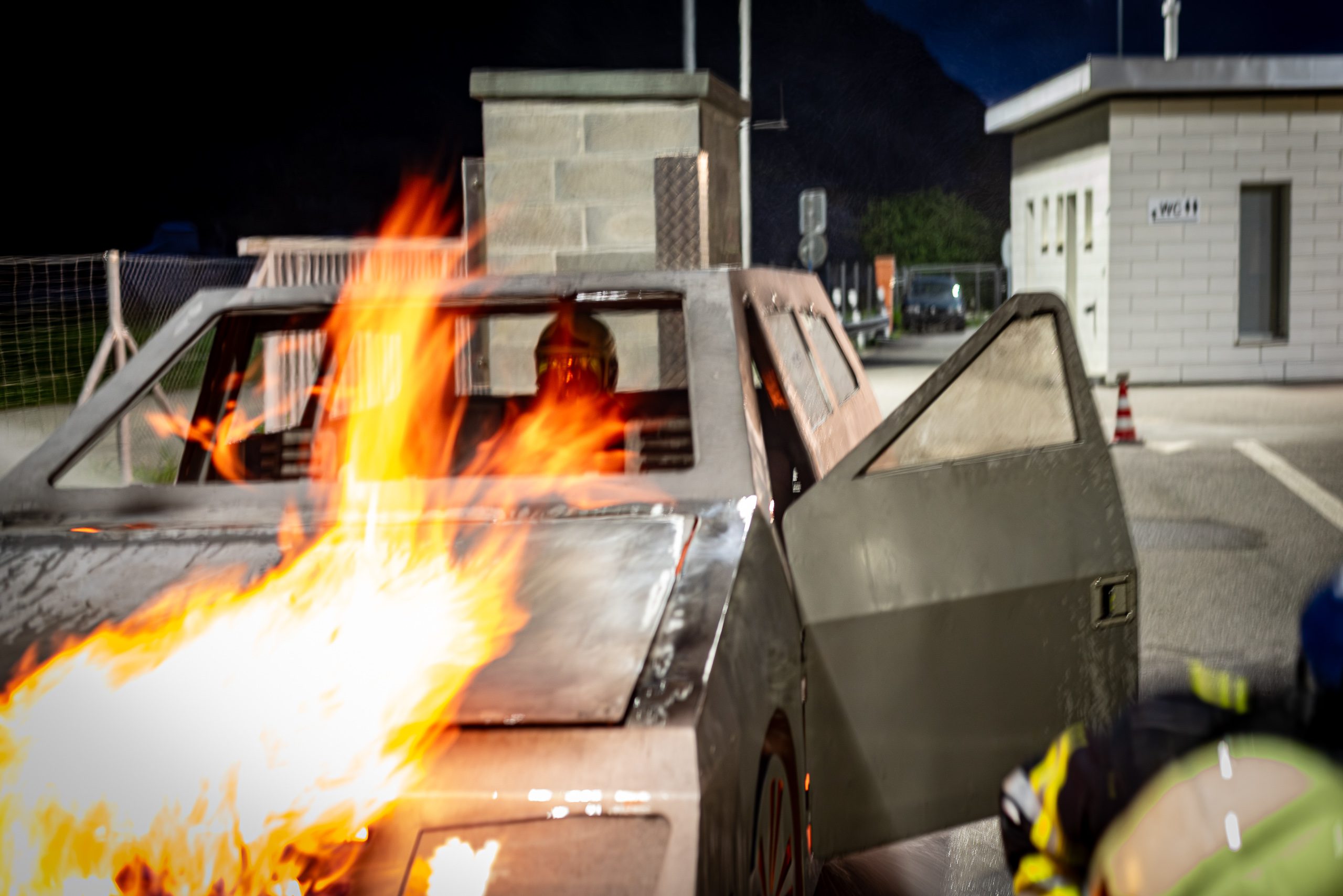 Lieu : Grône • Thèmes : coordination d'équipe, ouverture de porte avec extinction, feu de voiture, désenfumage cage/local, pénétration et extinction