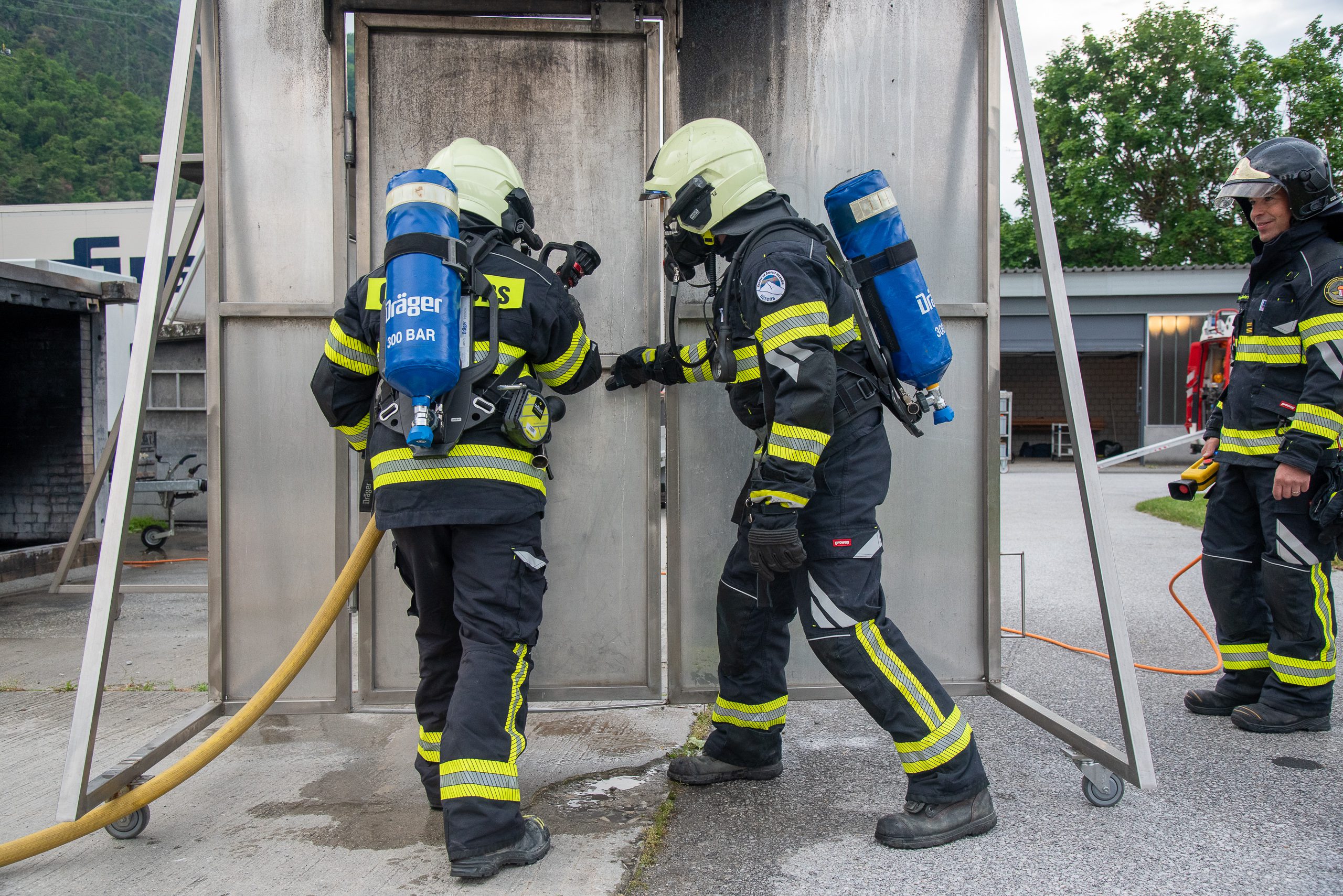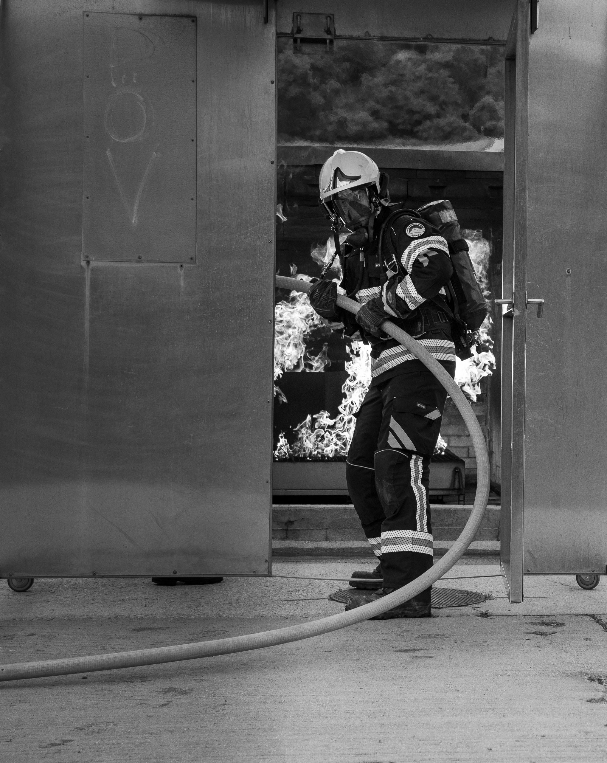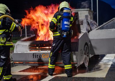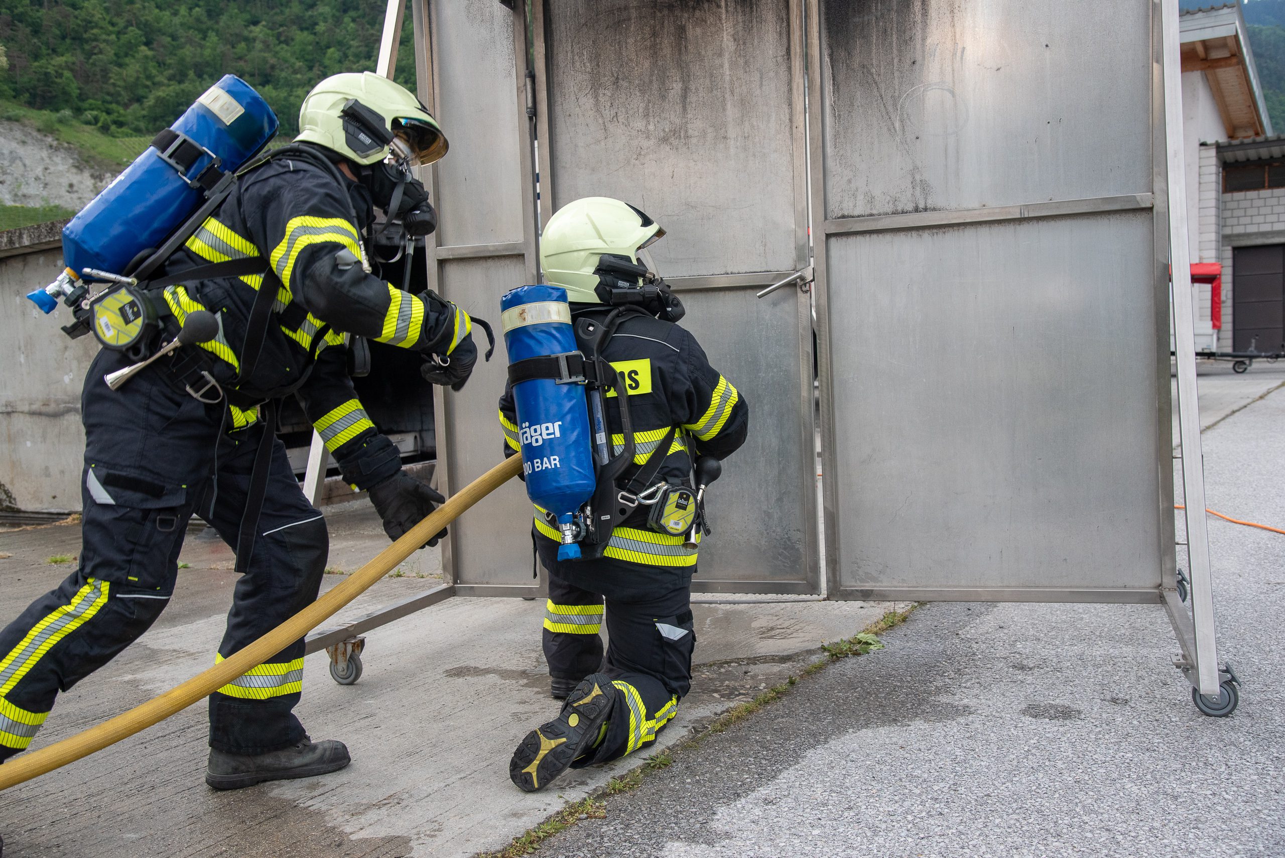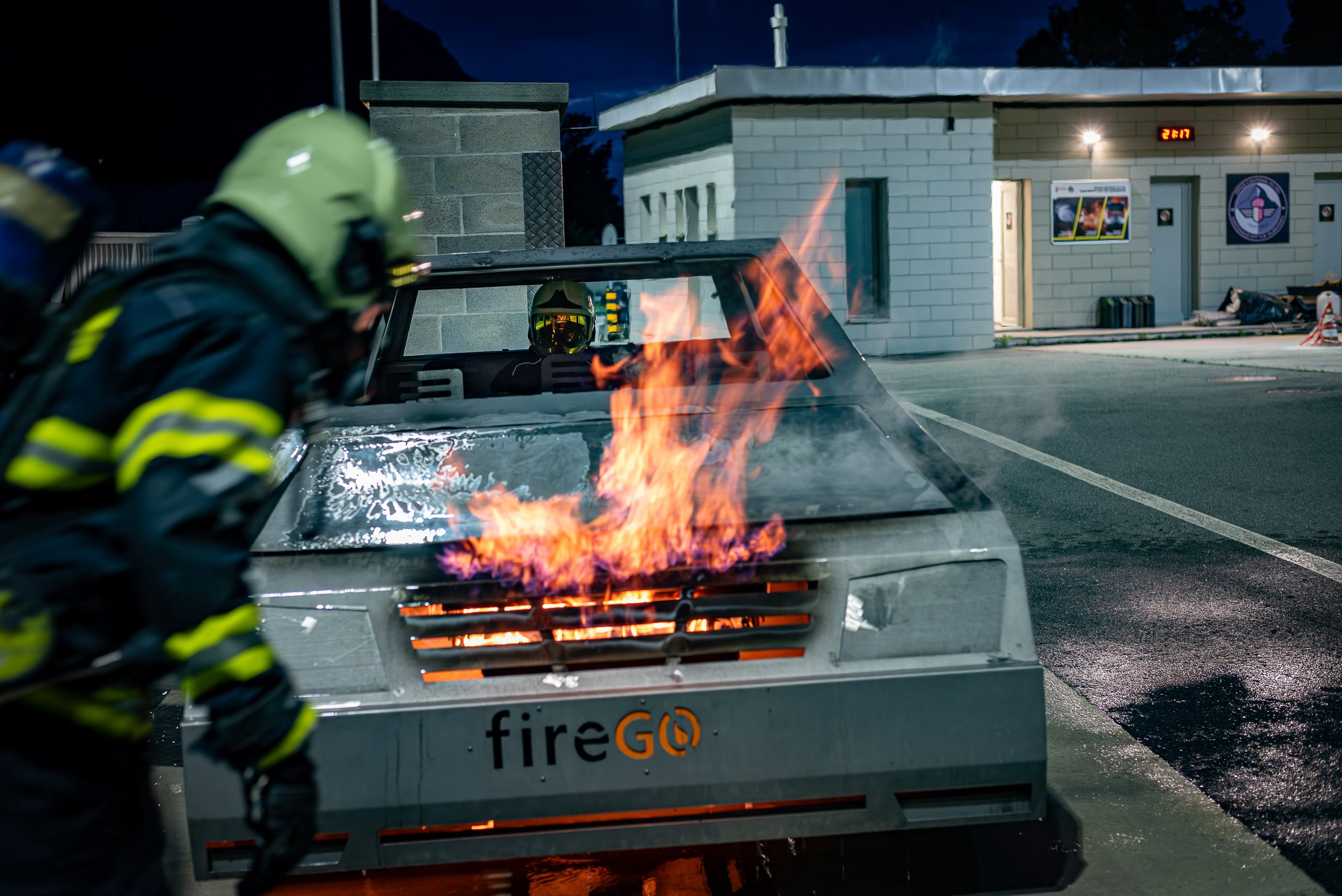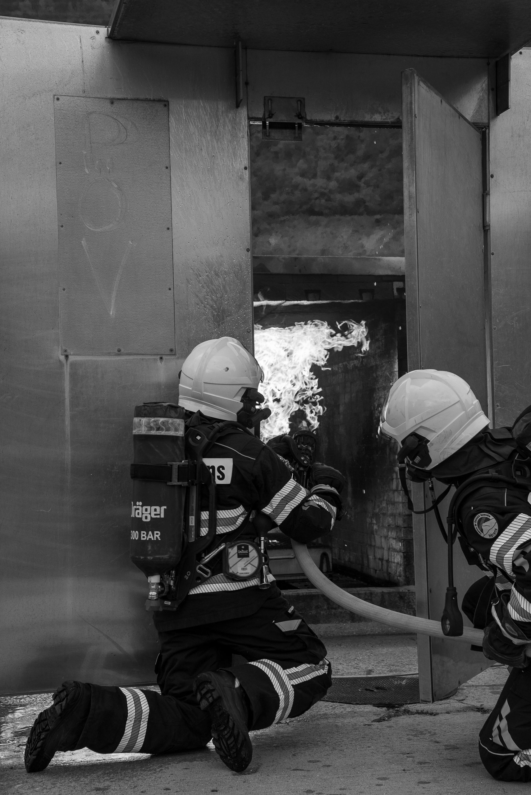 Lieu : Grône • Thèmes : coordination d'équipe, ouverture de porte avec extinction, feu de voiture, désenfumage cage/local, pénétration et extinction