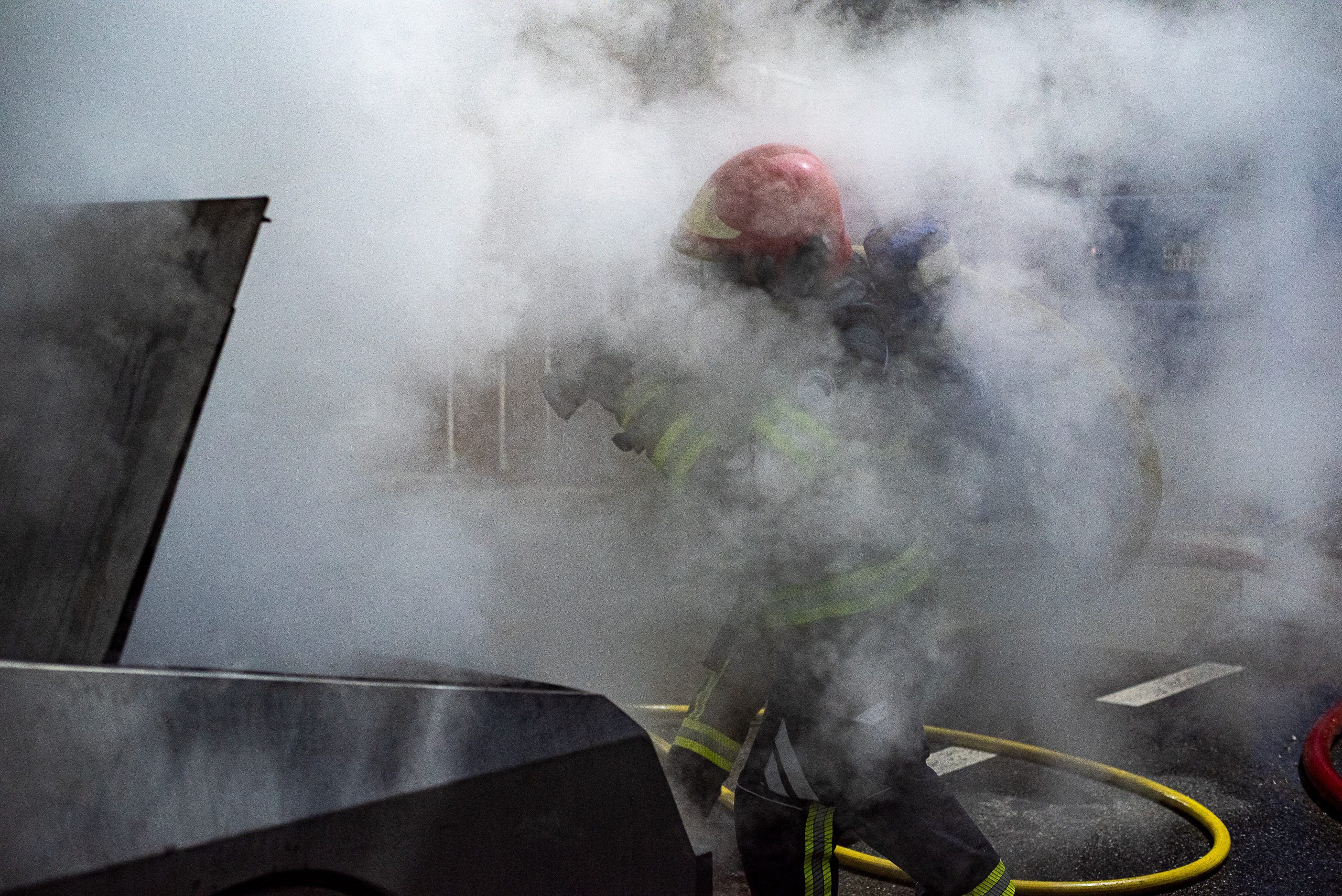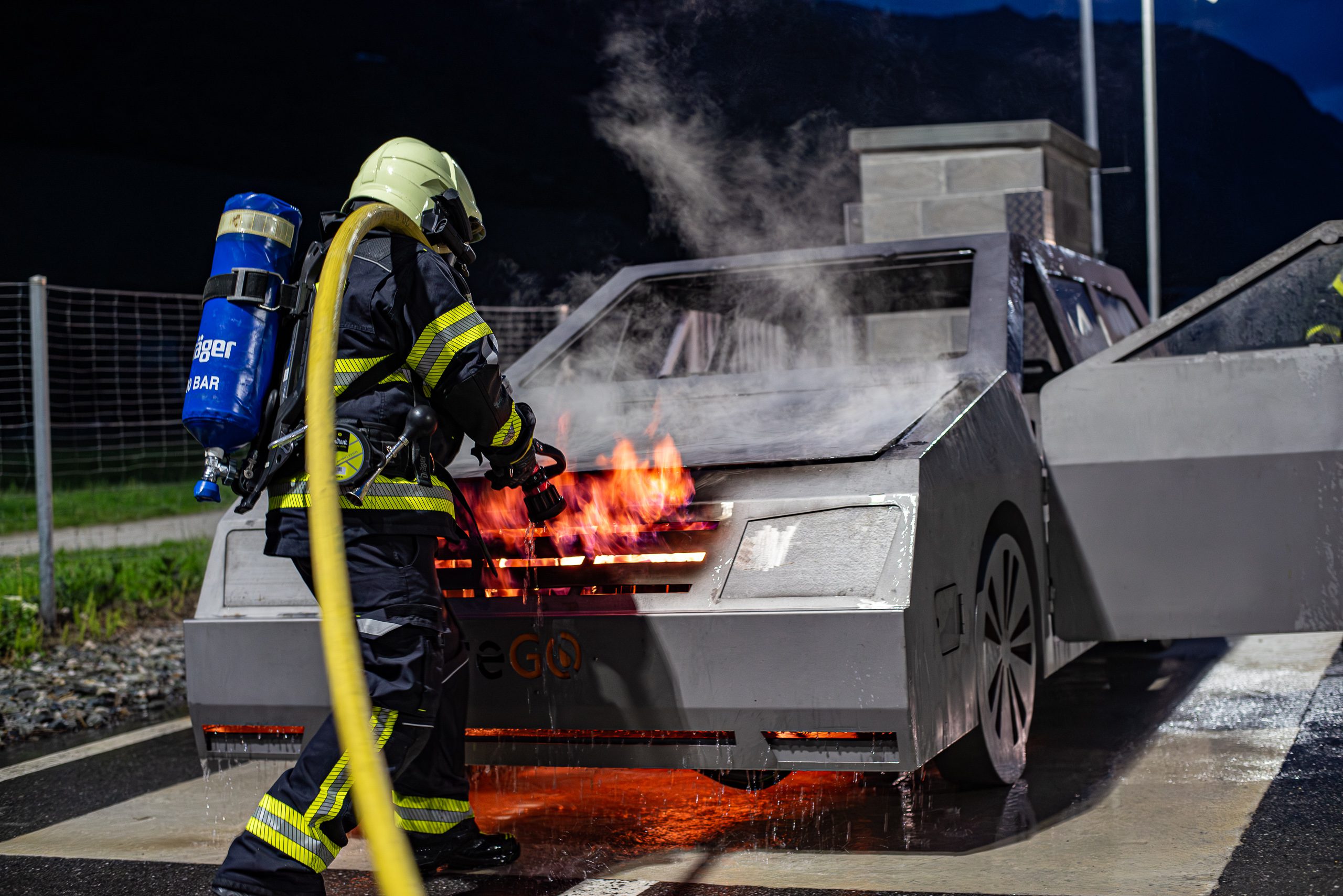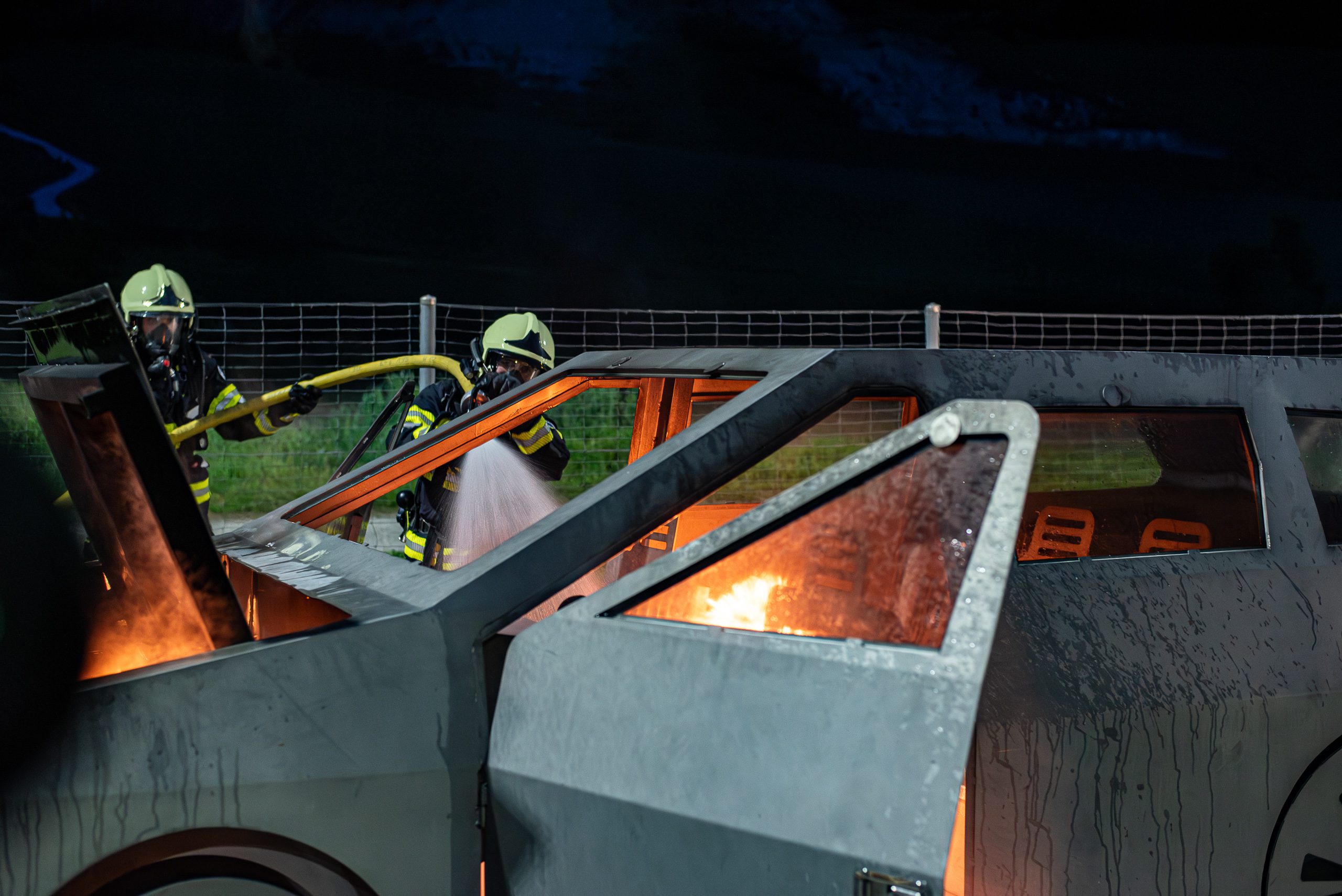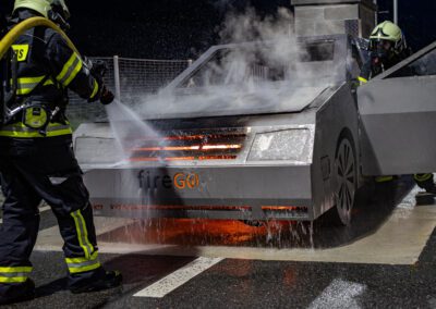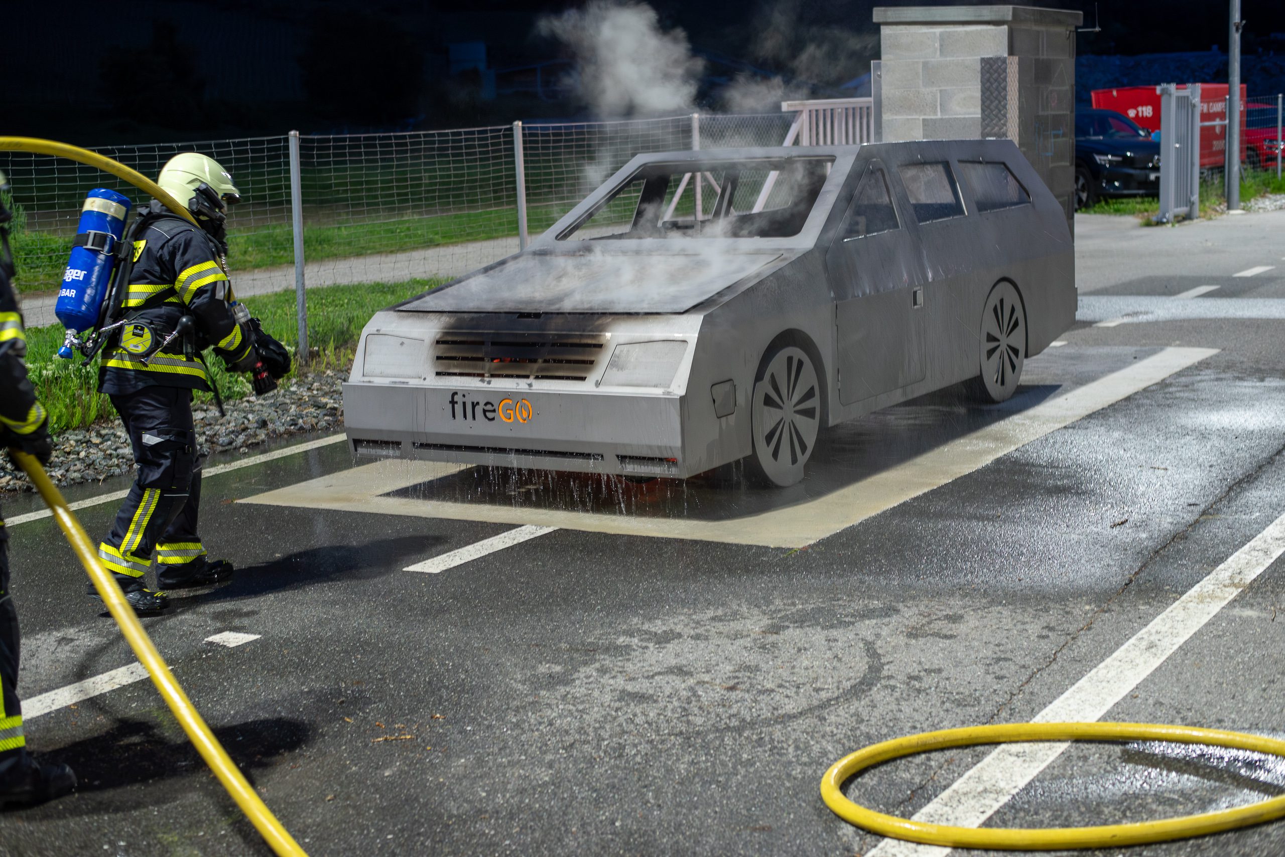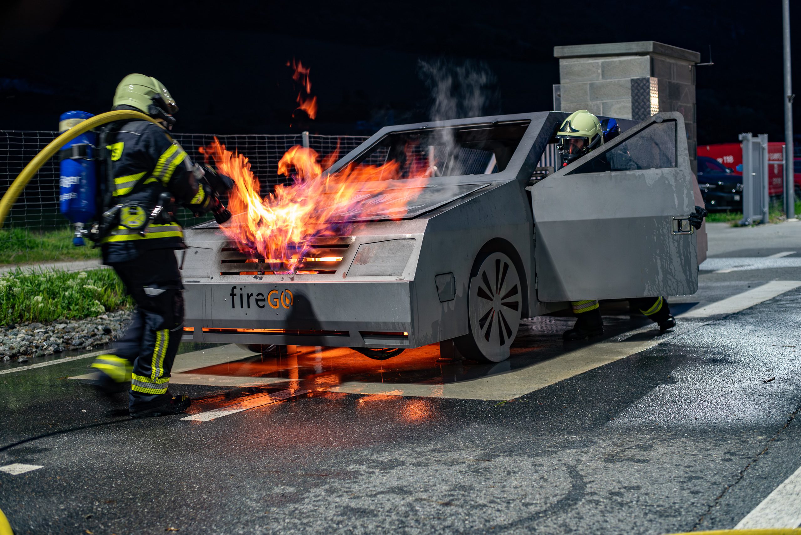 Lieu : Grône • Thèmes : coordination d'équipe, ouverture de porte avec extinction, feu de voiture, désenfumage cage/local, pénétration et extinction