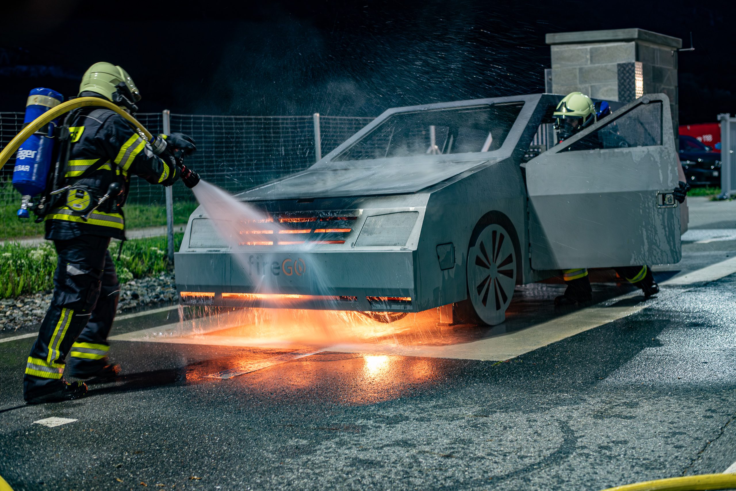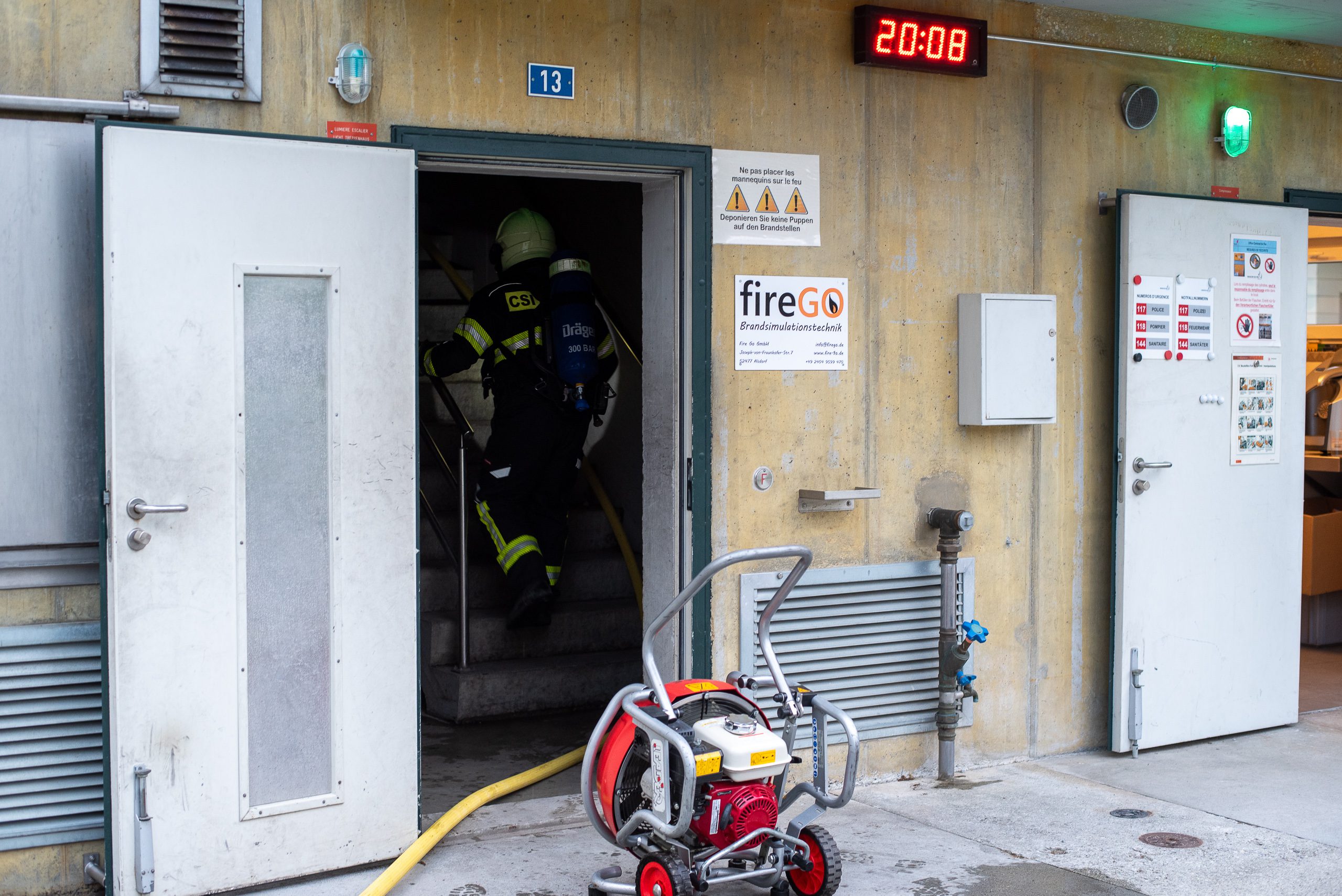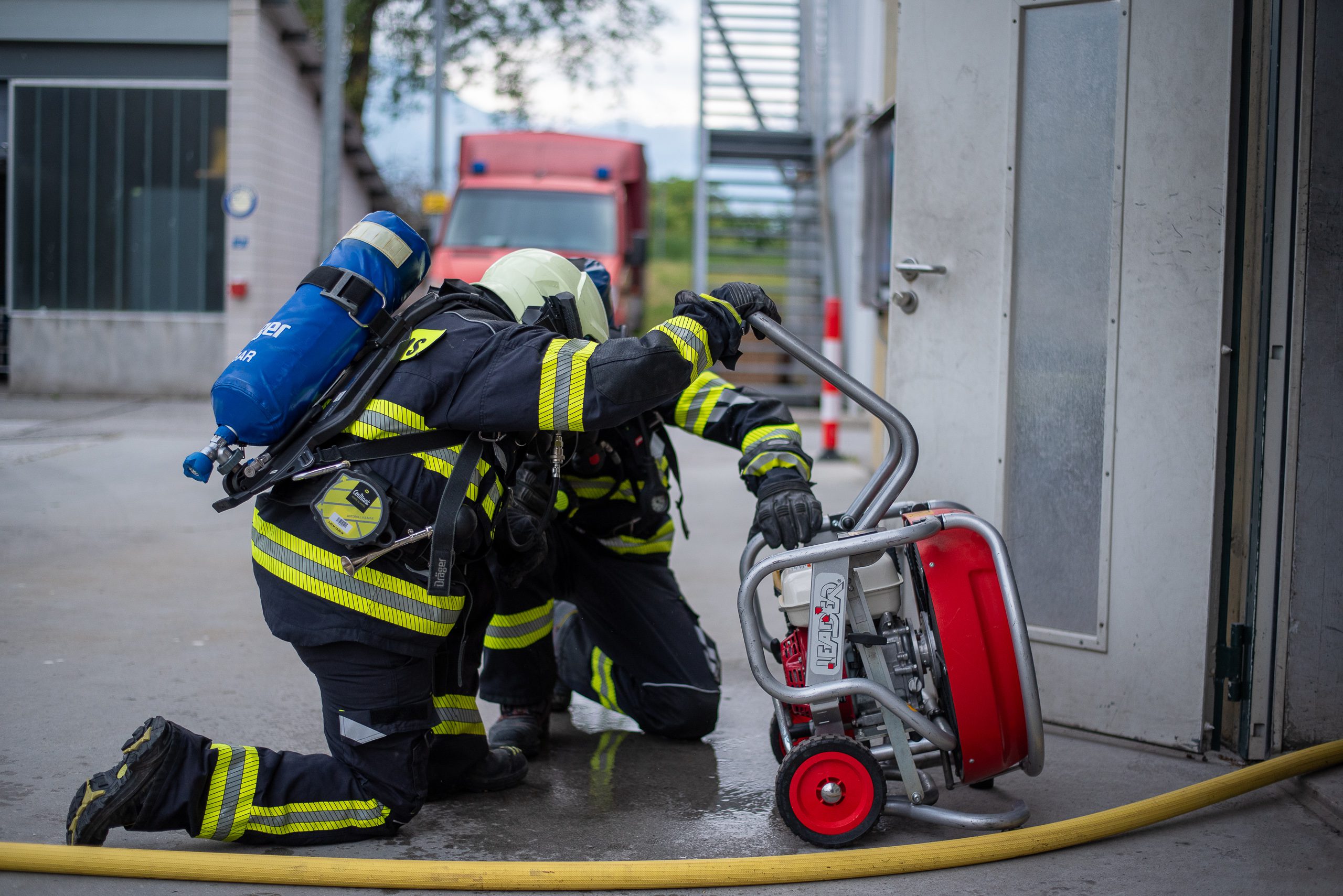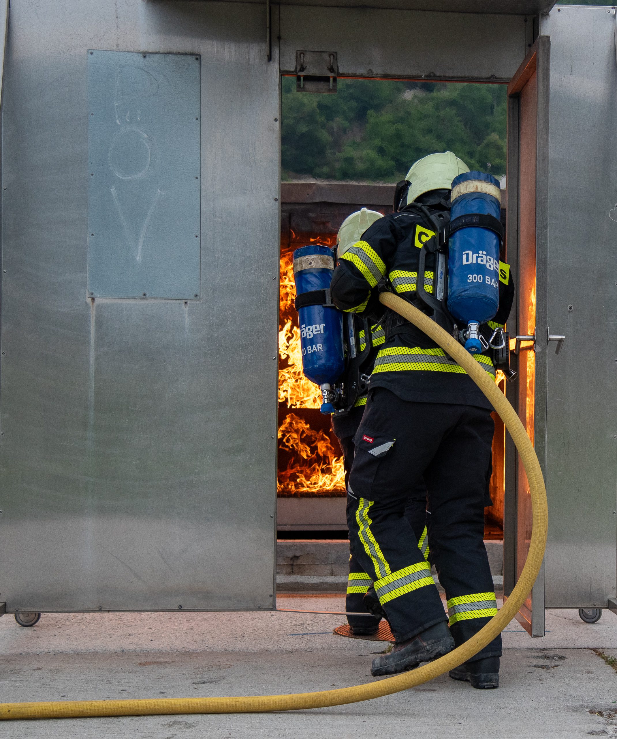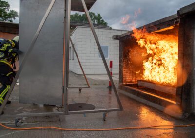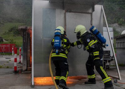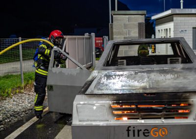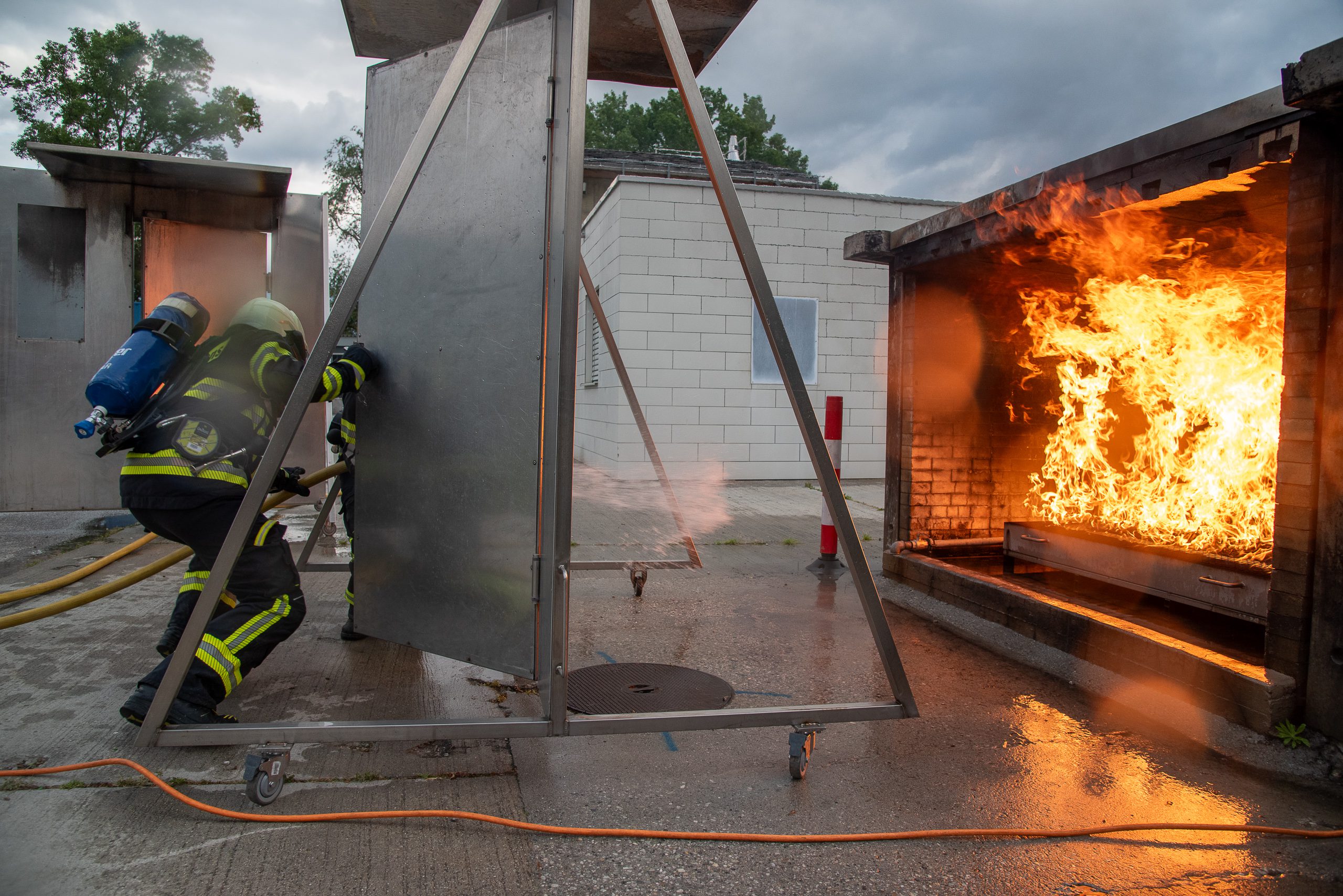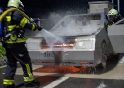 Lieu : Grône • Thèmes : coordination d'équipe, ouverture de porte avec extinction, feu de voiture, désenfumage cage/local, pénétration et extinction