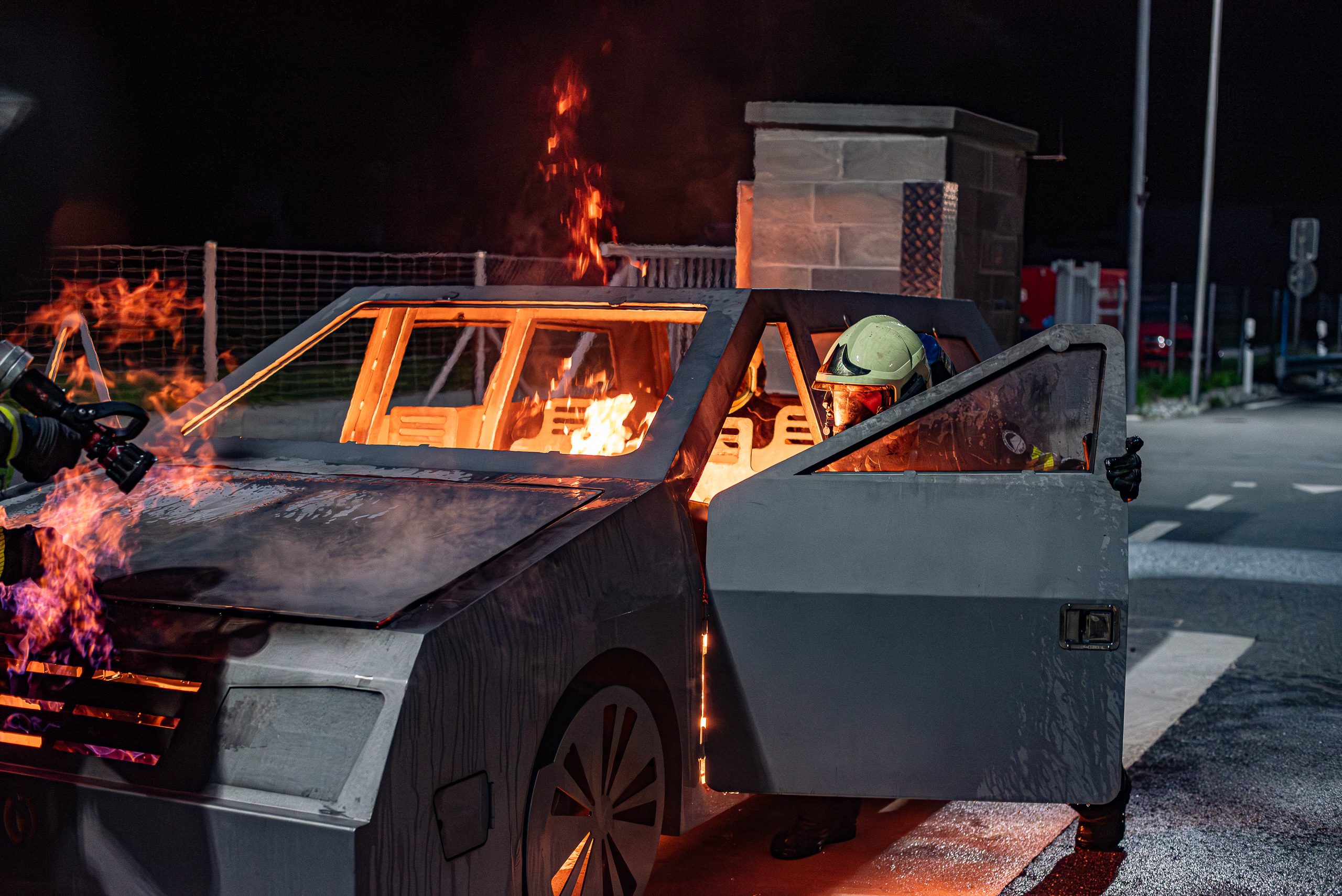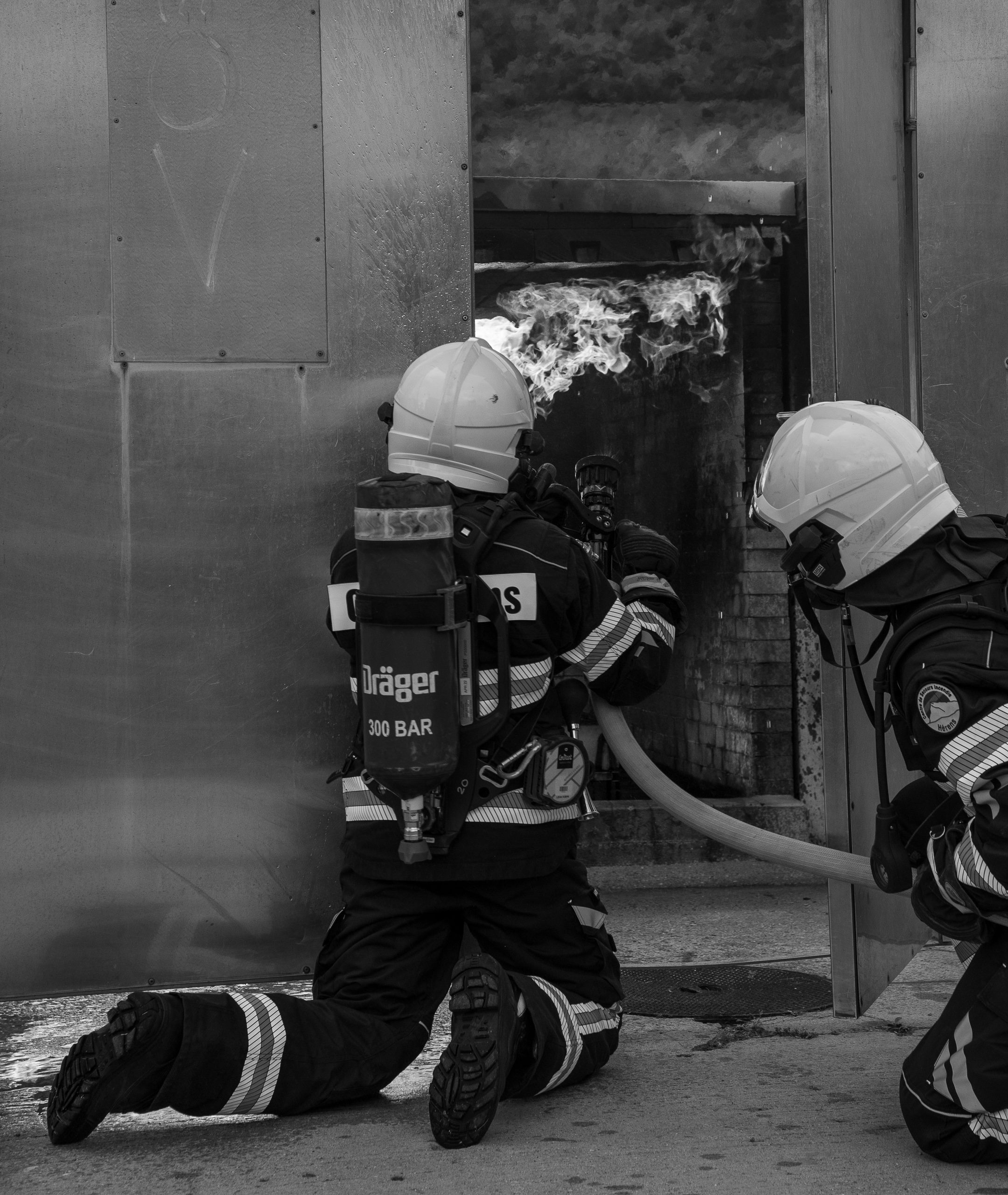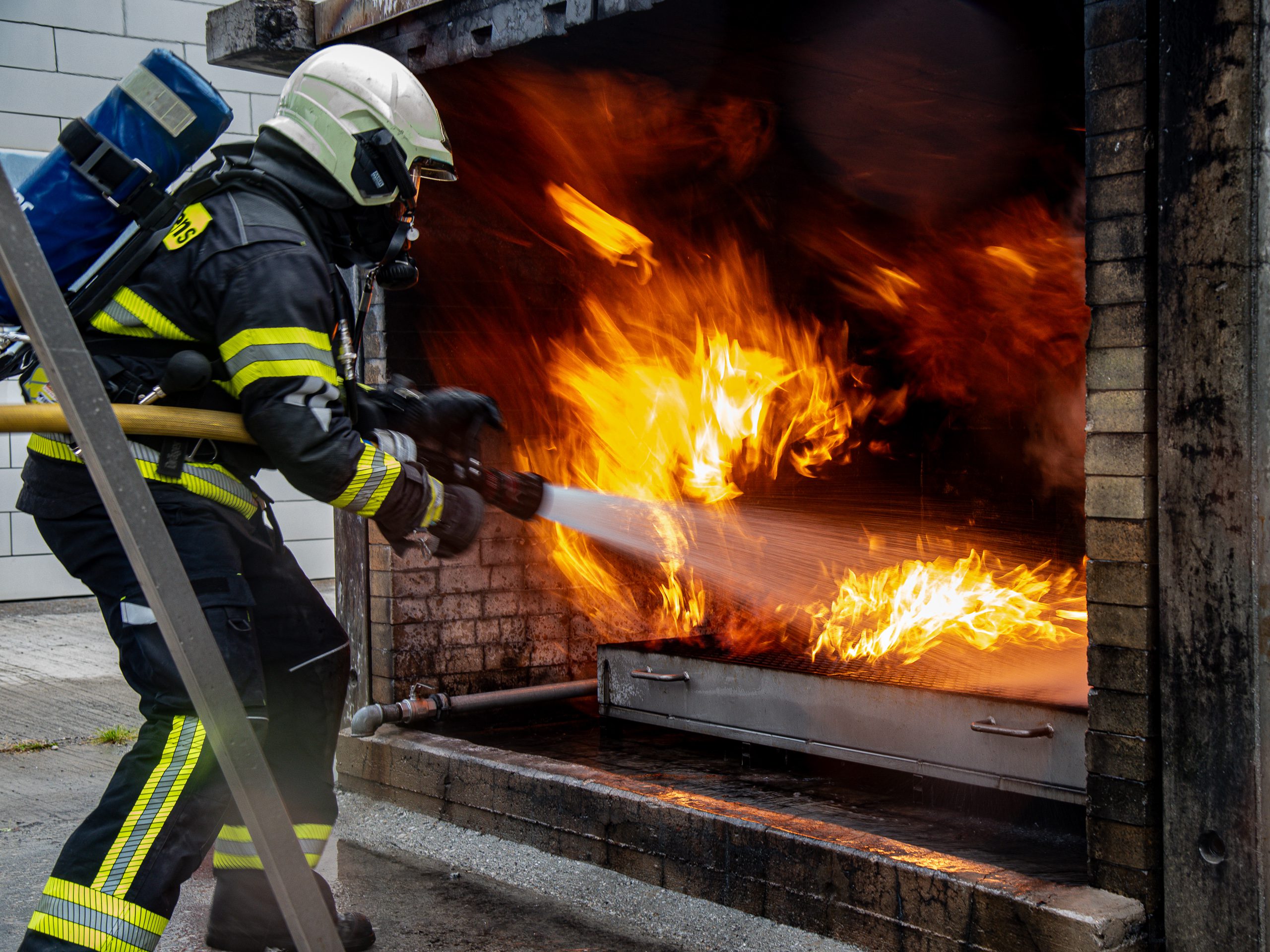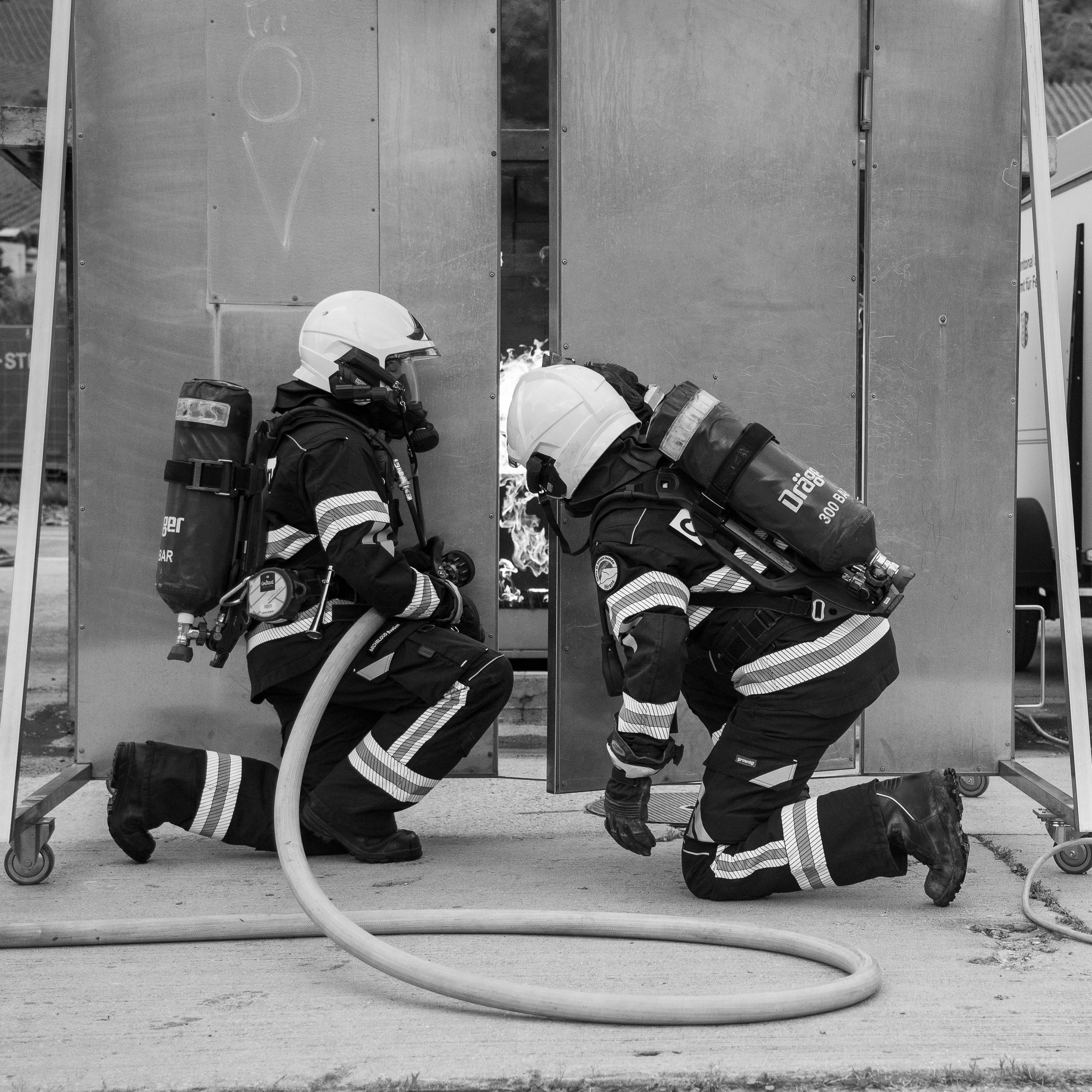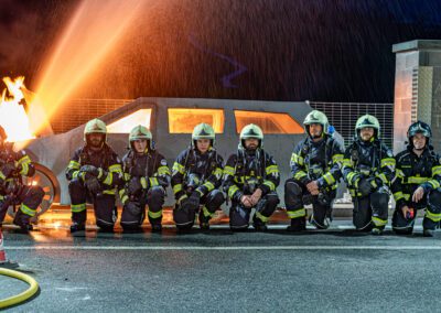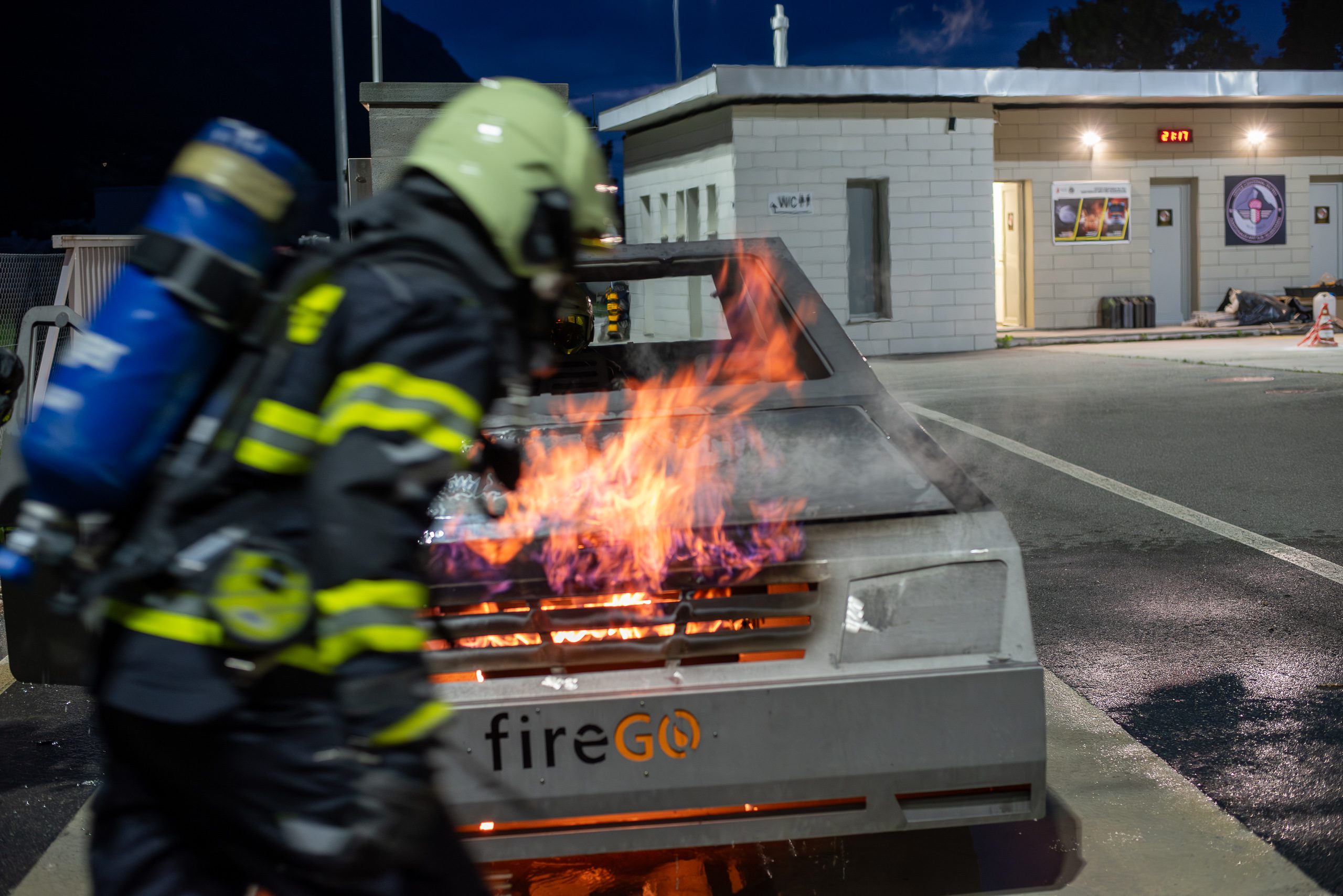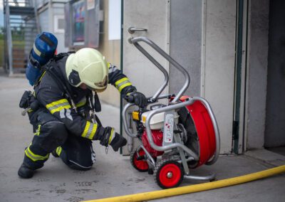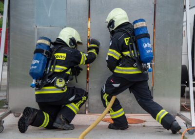 Lieu : Grône • Thèmes : coordination d'équipe, ouverture de porte avec extinction, feu de voiture, désenfumage cage/local, pénétration et extinction