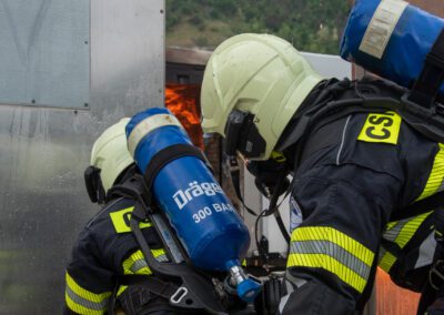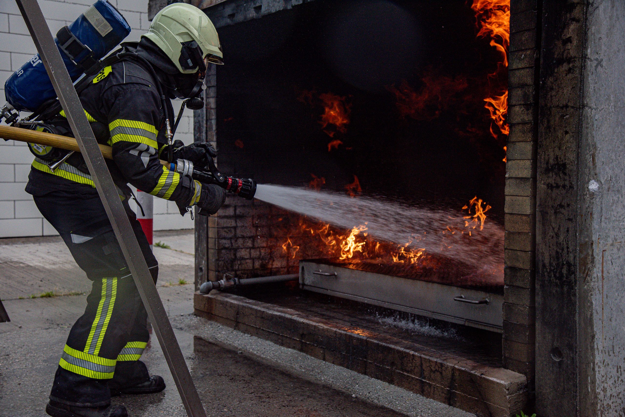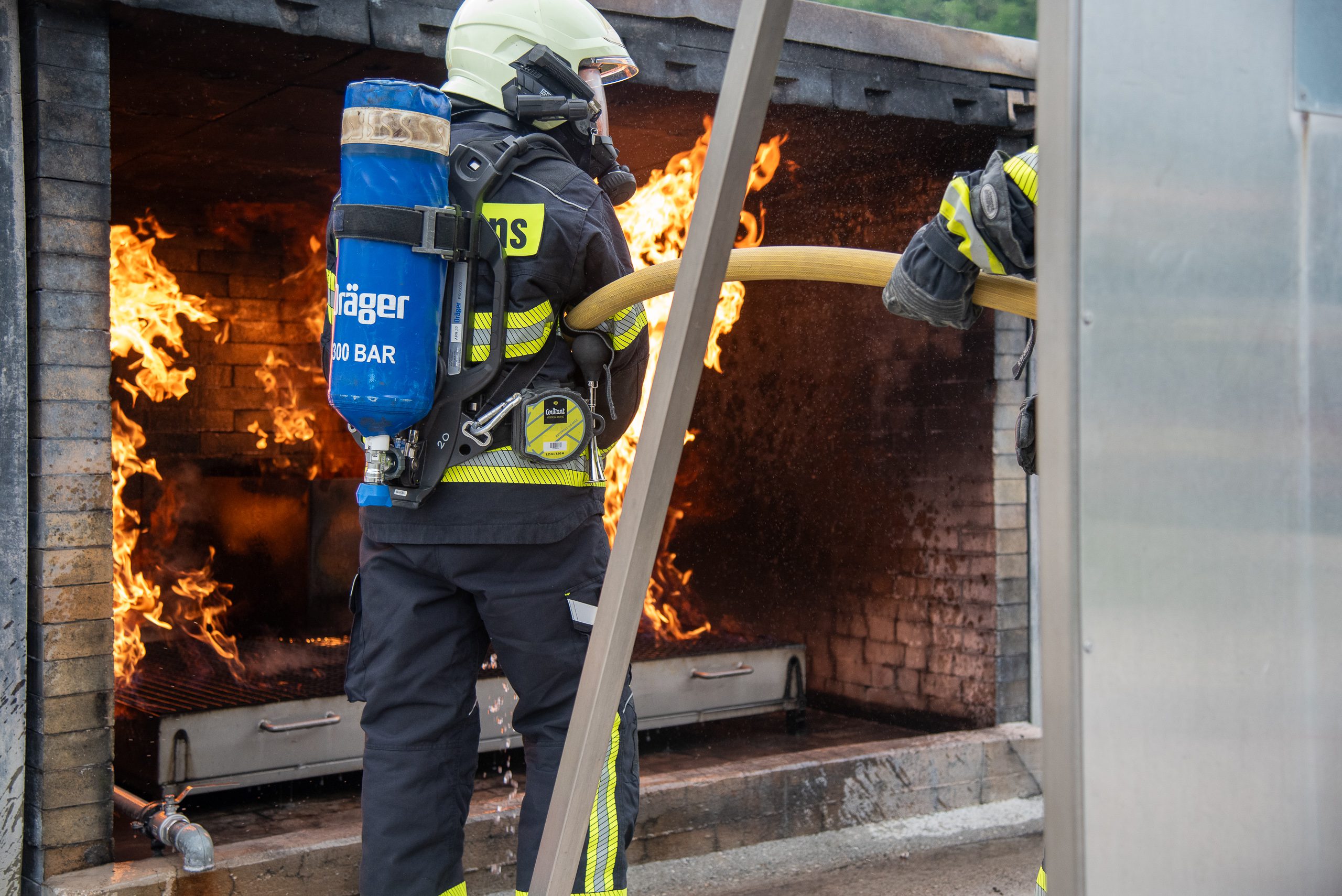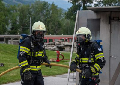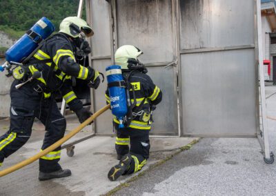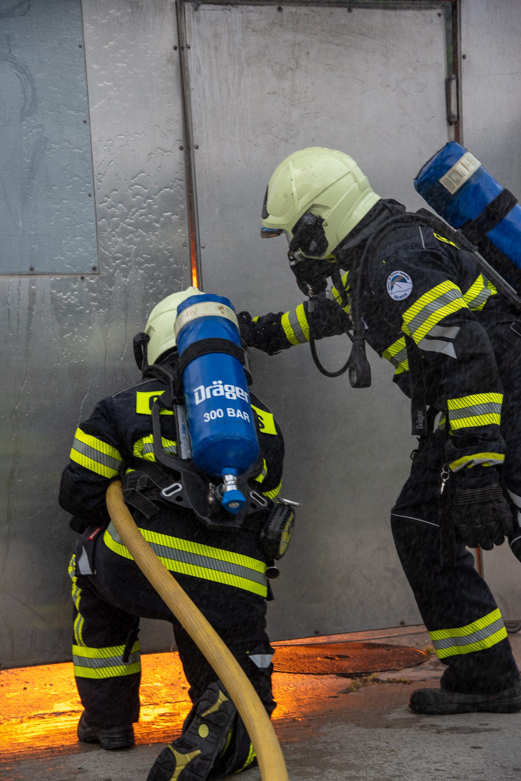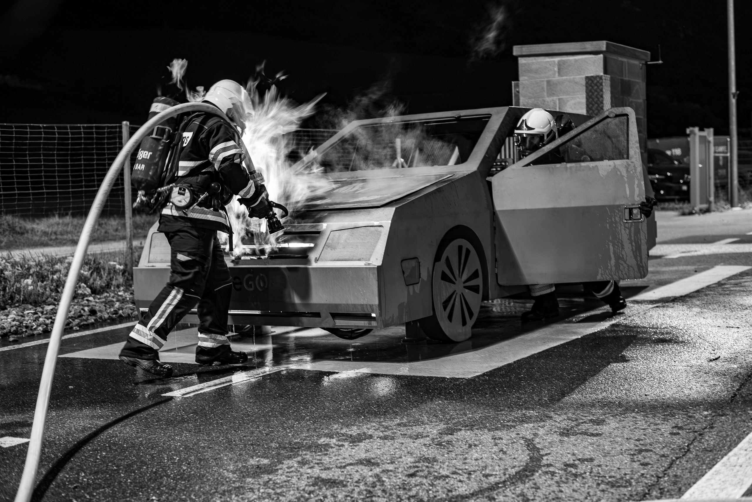 Lieu : Grône • Thèmes : coordination d'équipe, ouverture de porte avec extinction, feu de voiture, désenfumage cage/local, pénétration et extinction