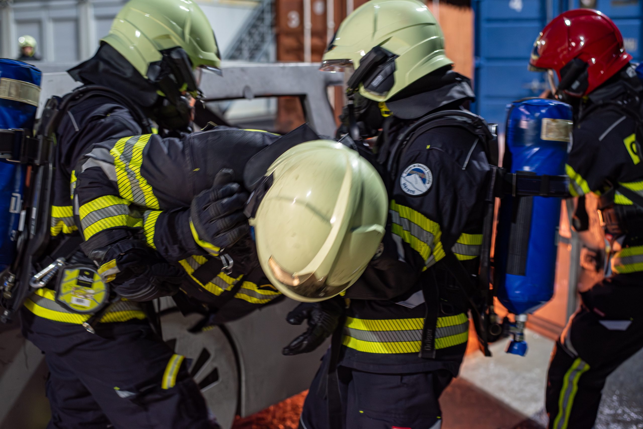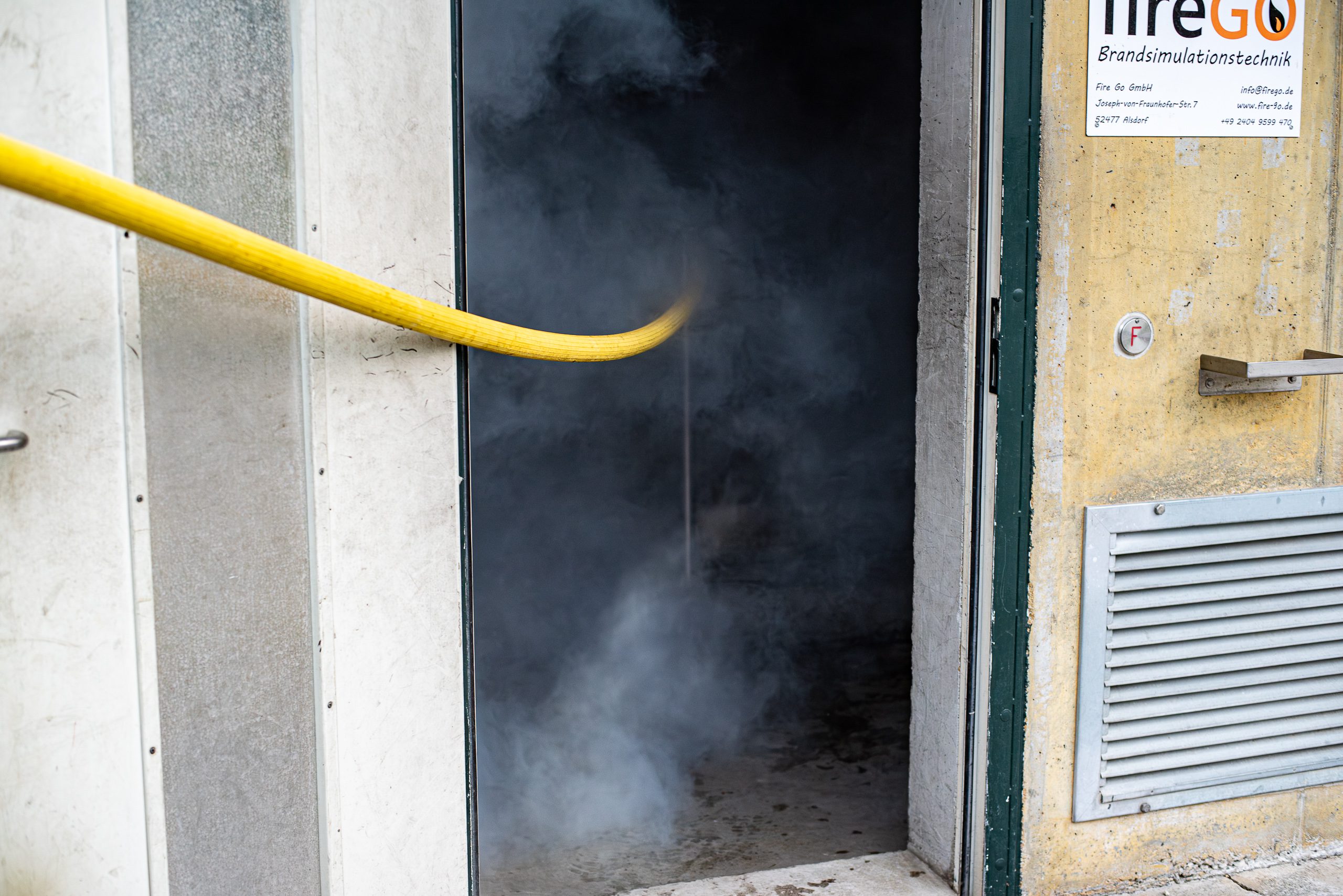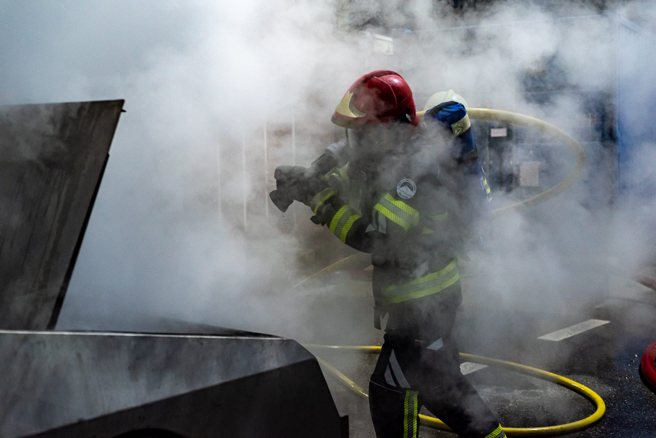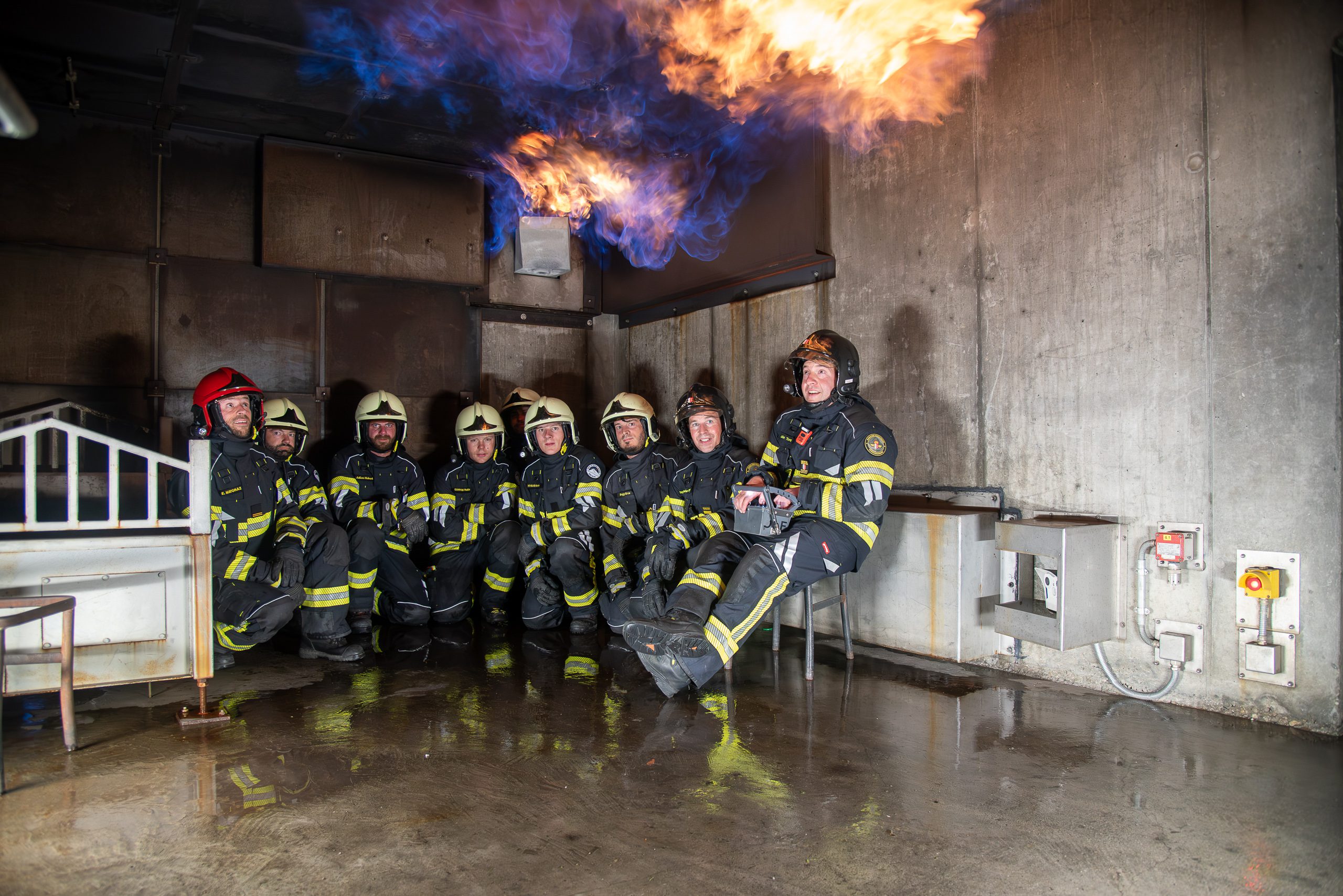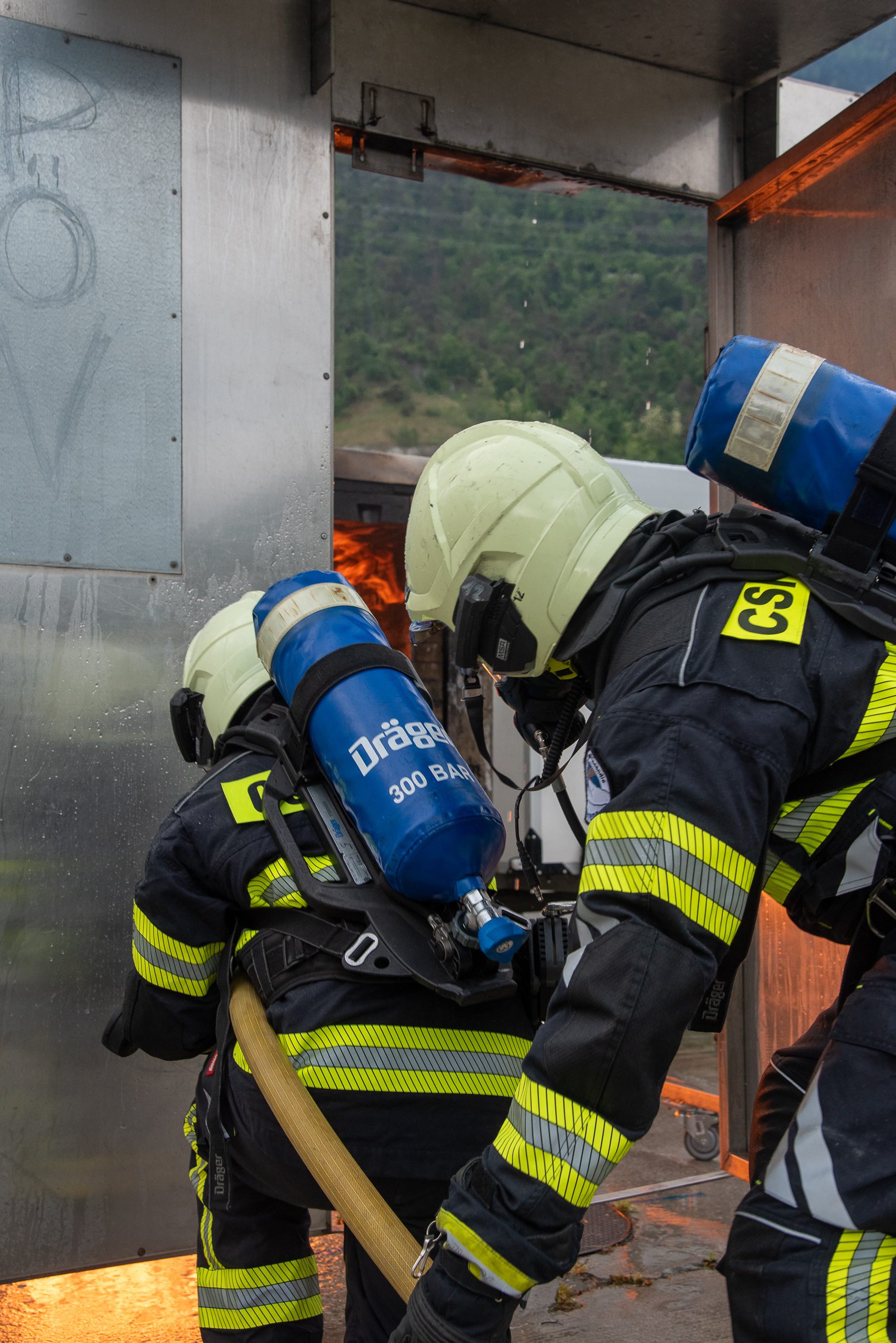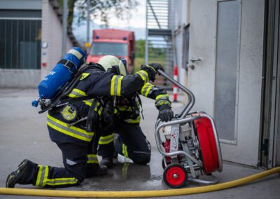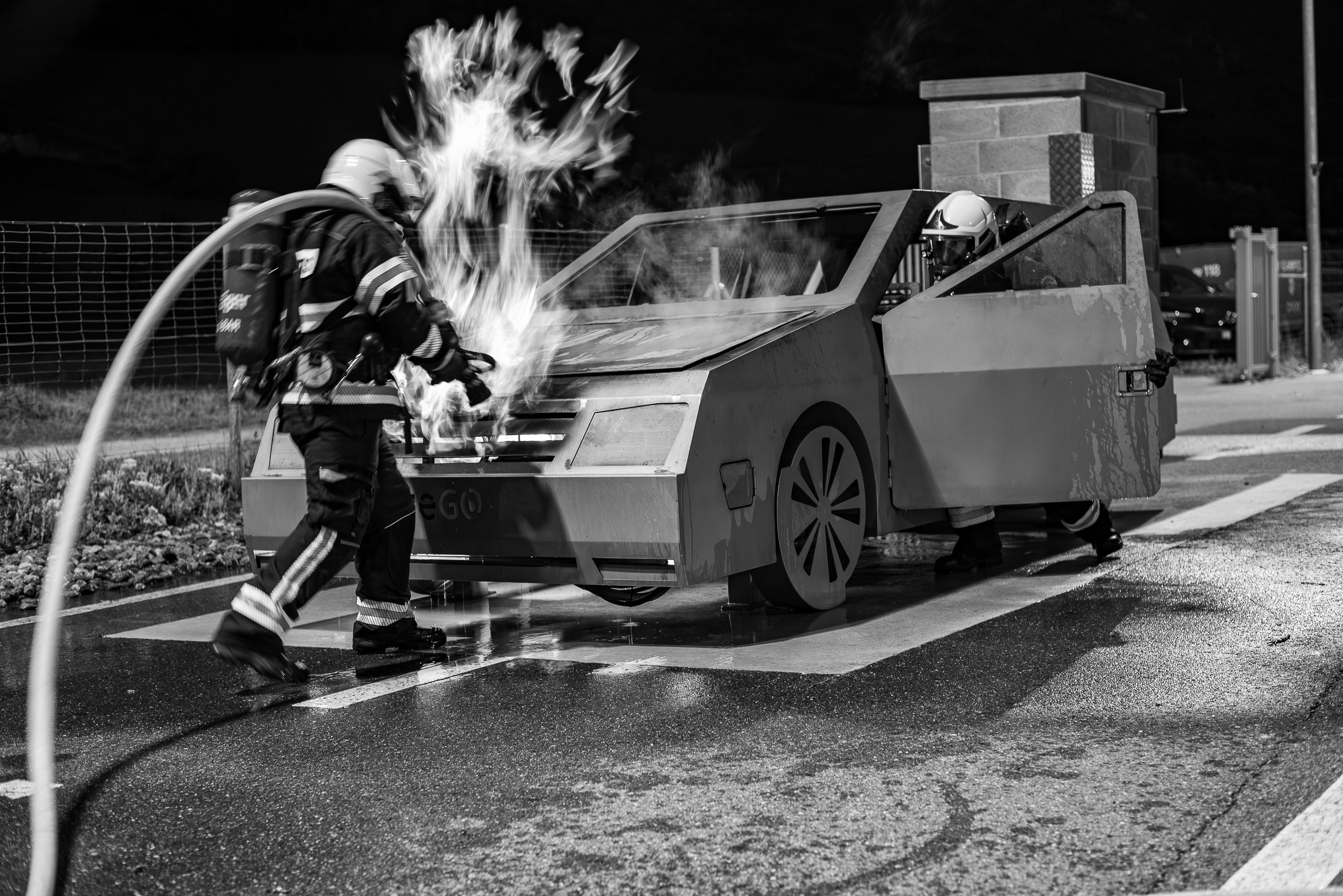 Lieu : Grône • Thèmes : coordination d'équipe, ouverture de porte avec extinction, feu de voiture, désenfumage cage/local, pénétration et extinction