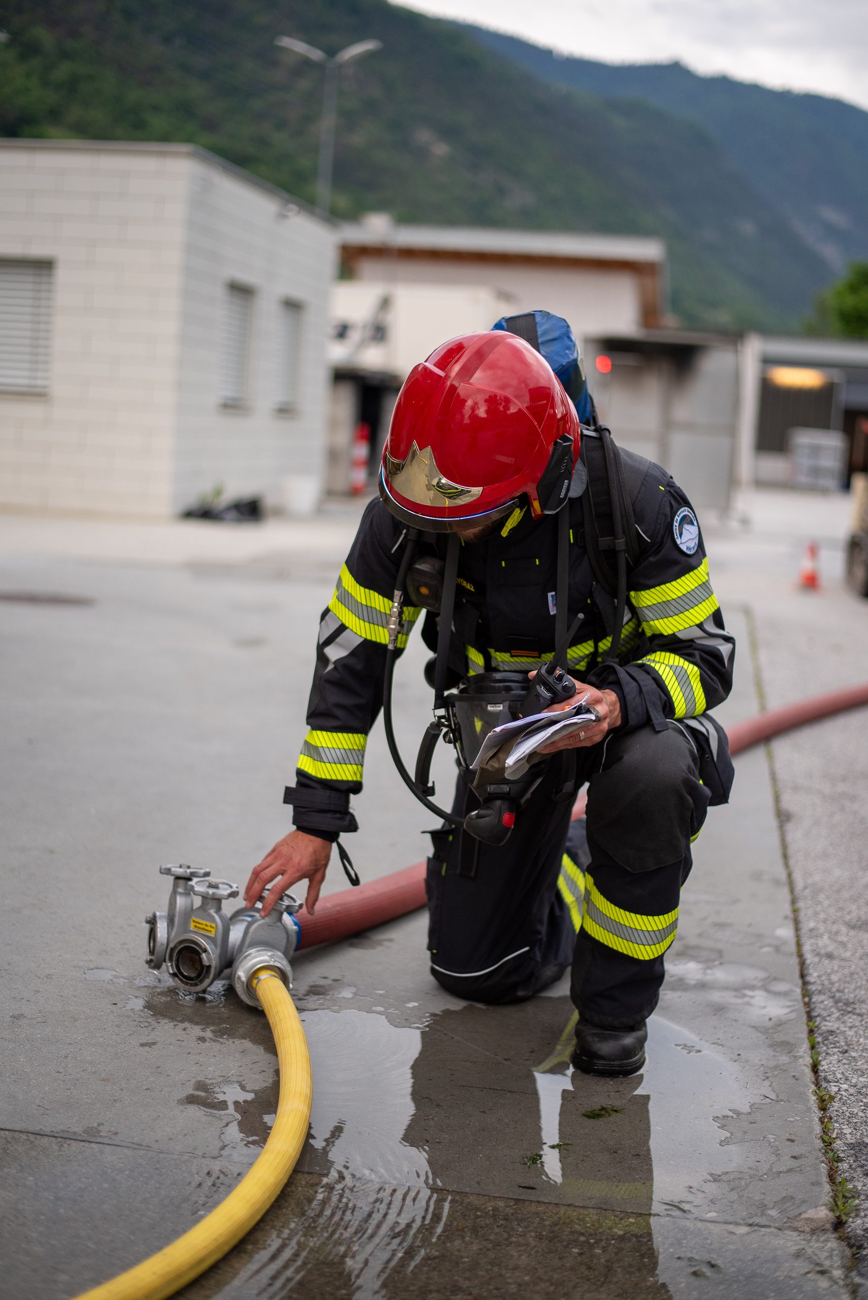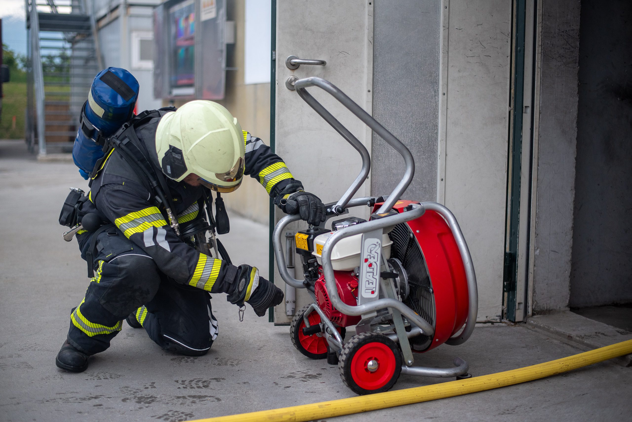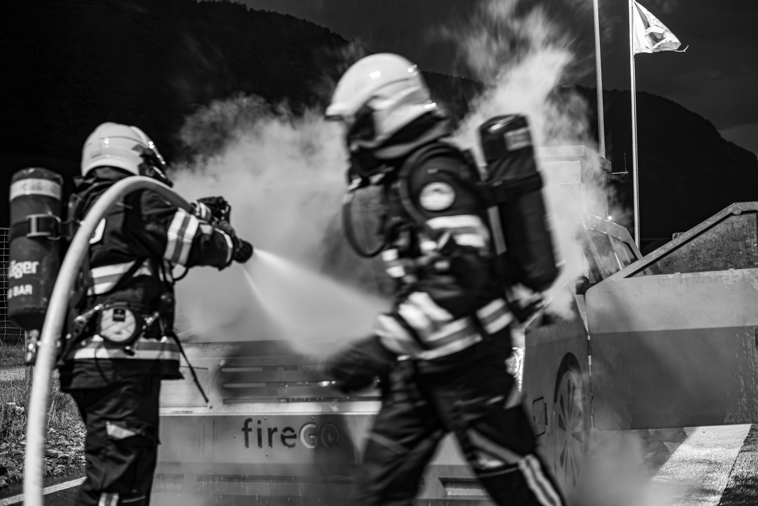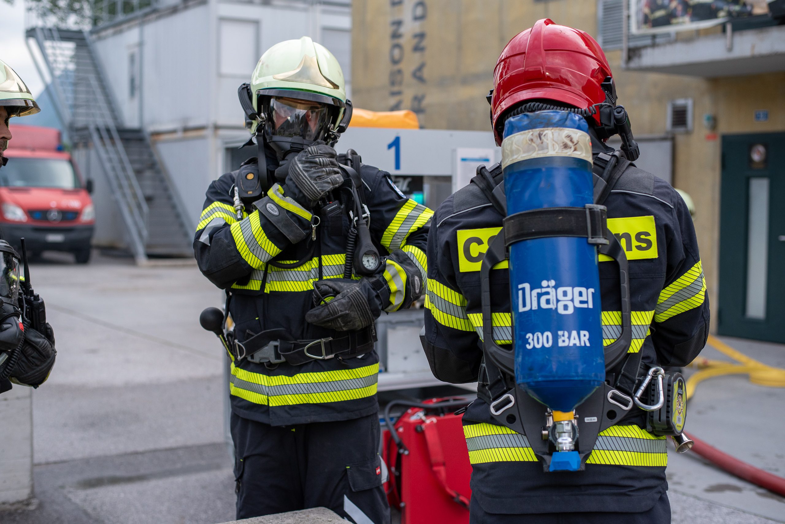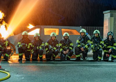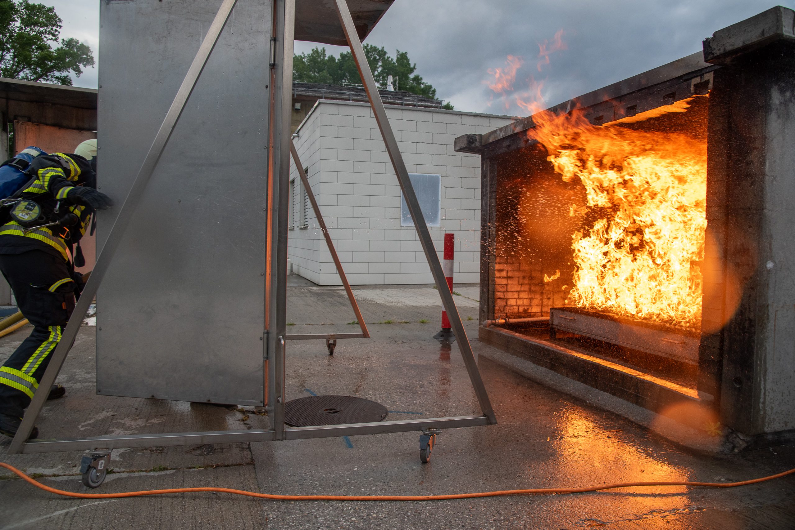 Lieu : Grône • Thèmes : coordination d'équipe, ouverture de porte avec extinction, feu de voiture, désenfumage cage/local, pénétration et extinction