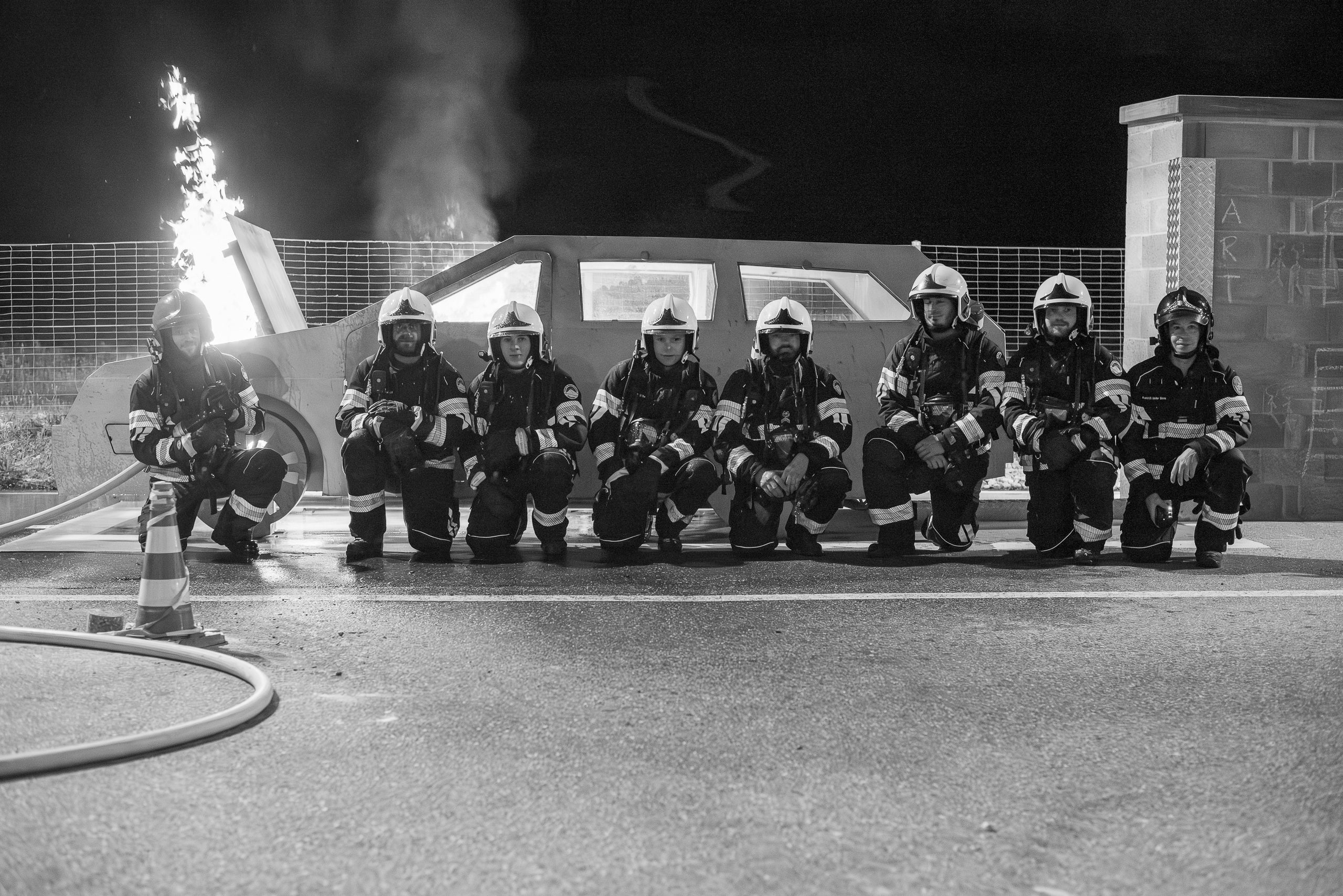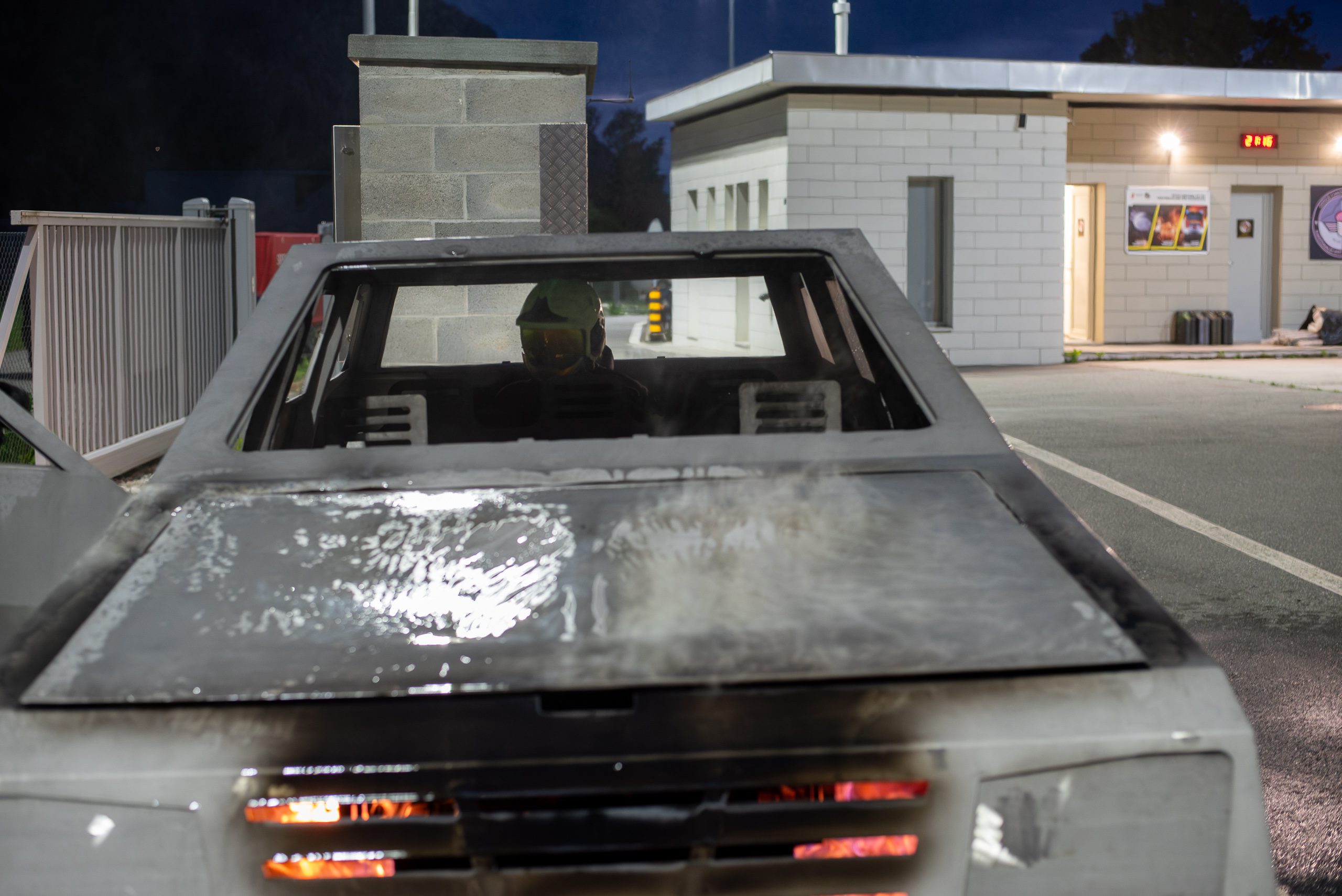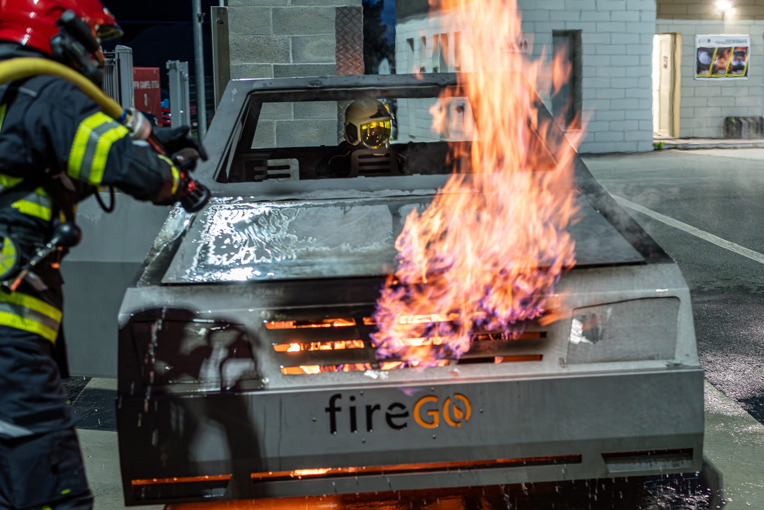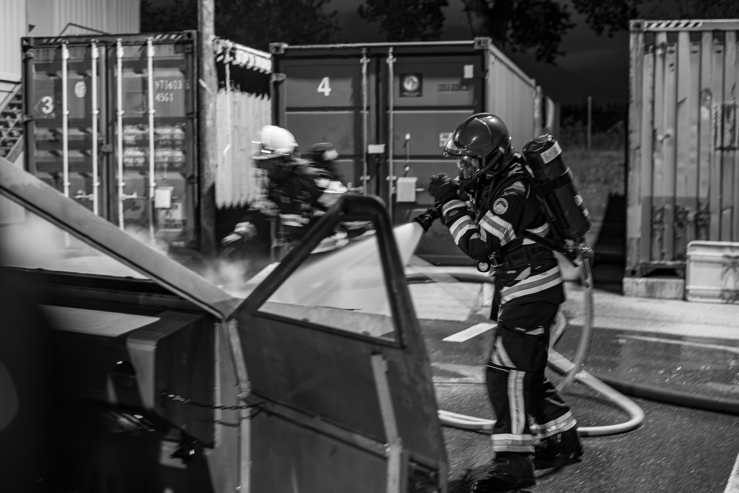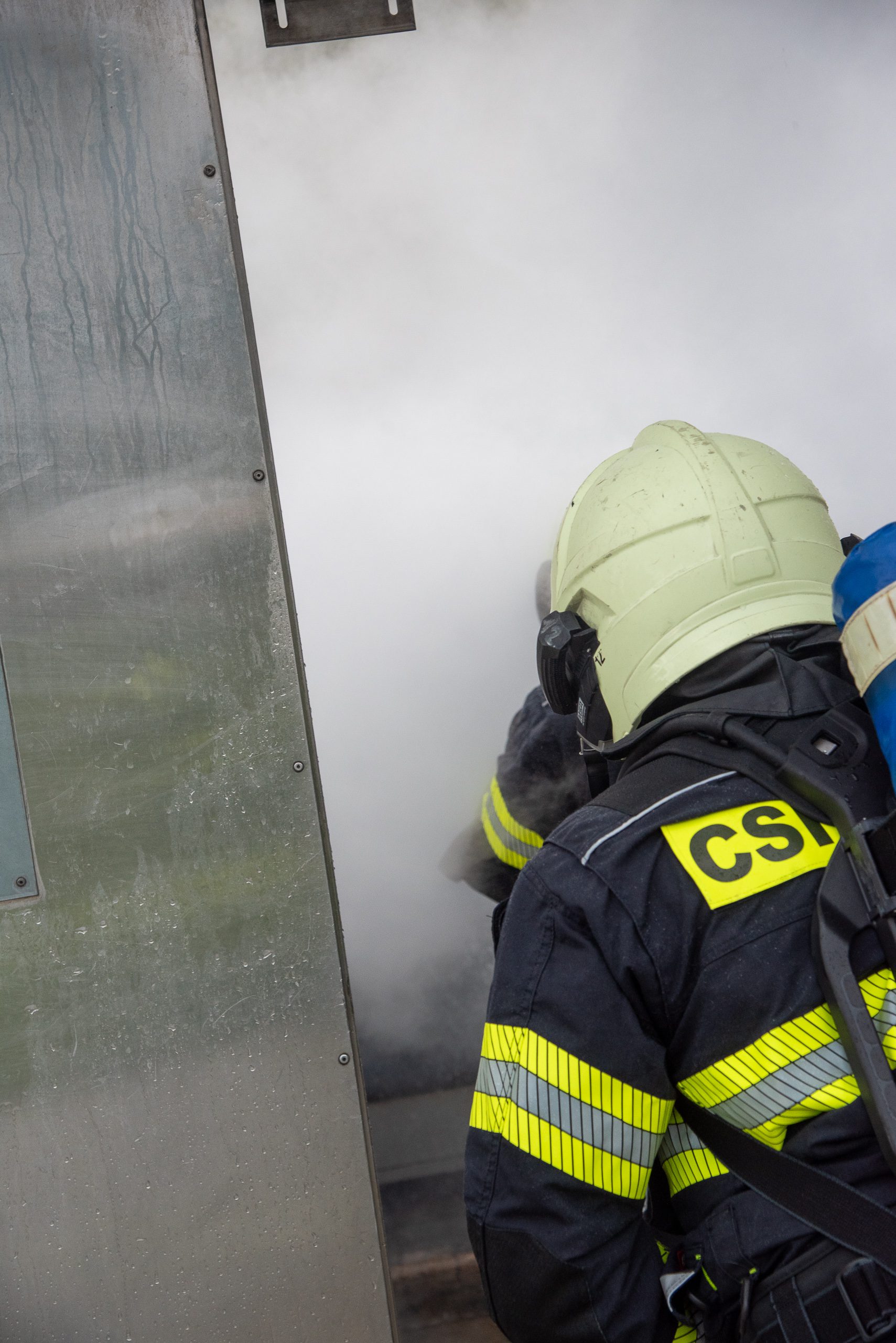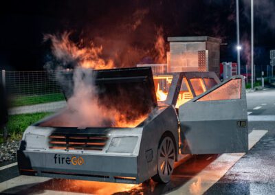 Lieu : Grône • Thèmes : coordination d'équipe, ouverture de porte avec extinction, feu de voiture, désenfumage cage/local, pénétration et extinction