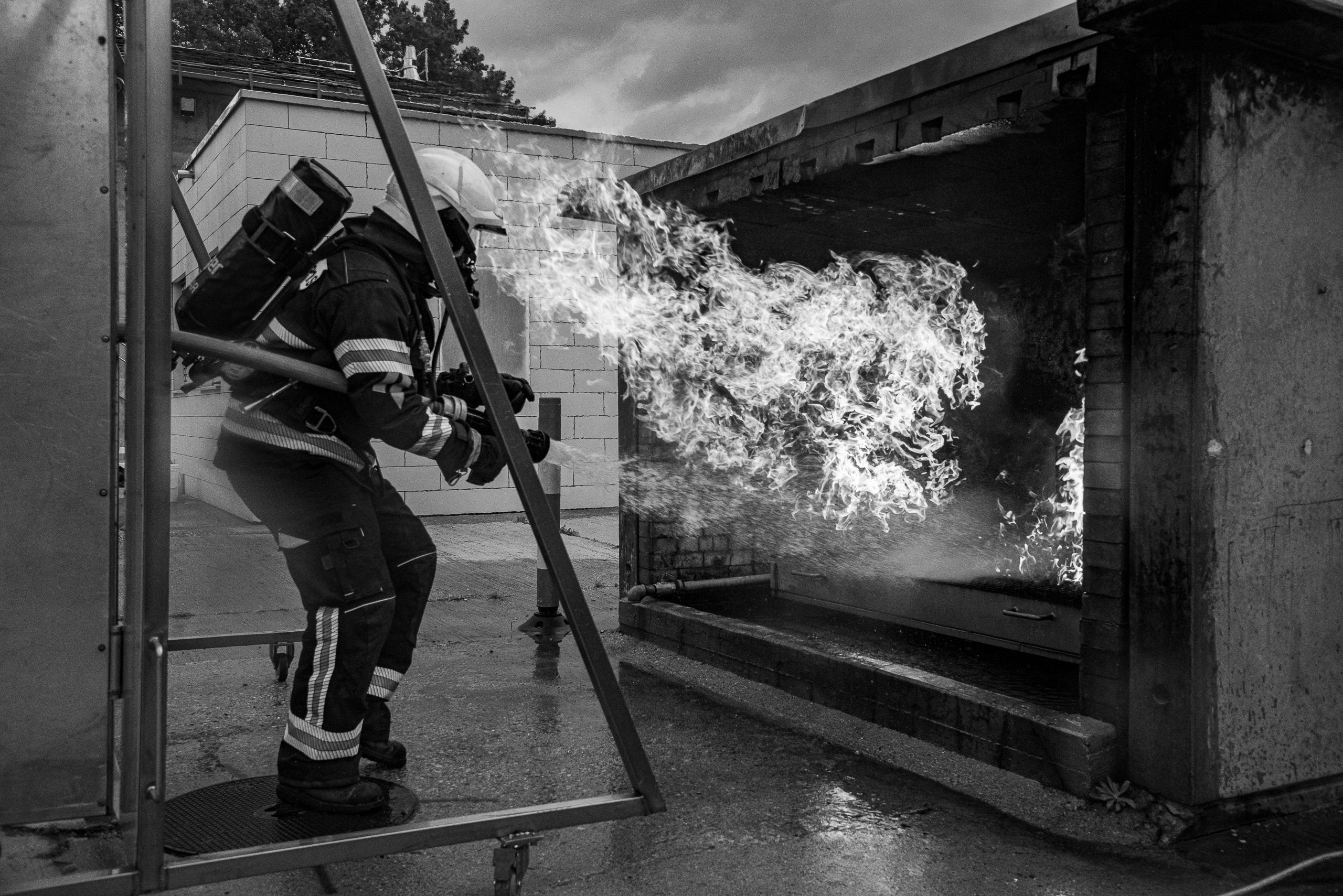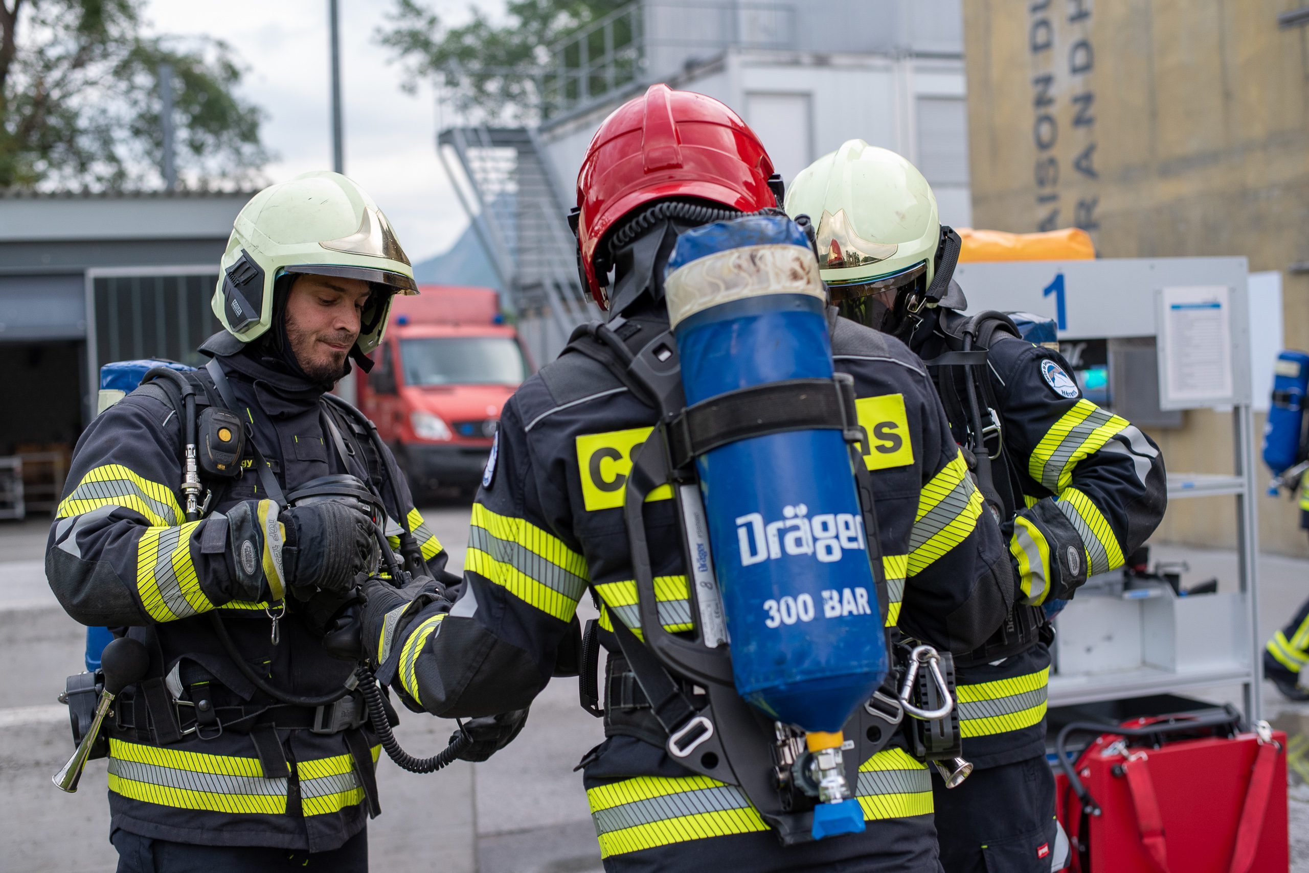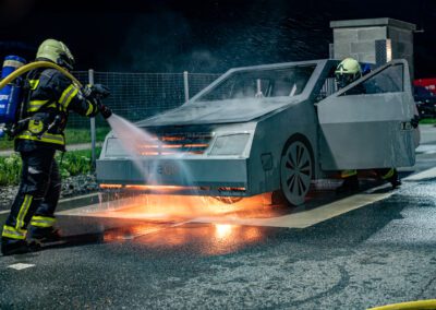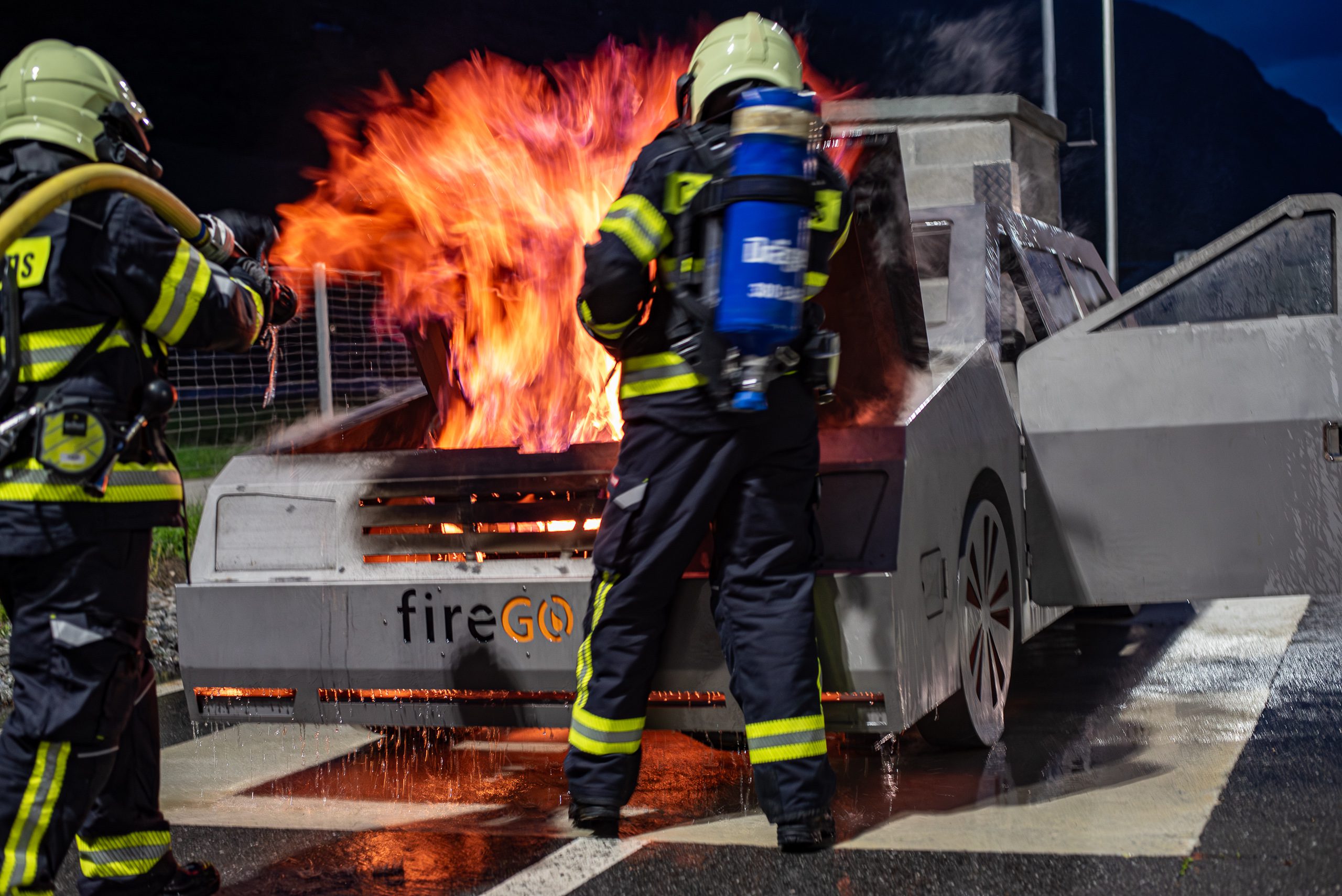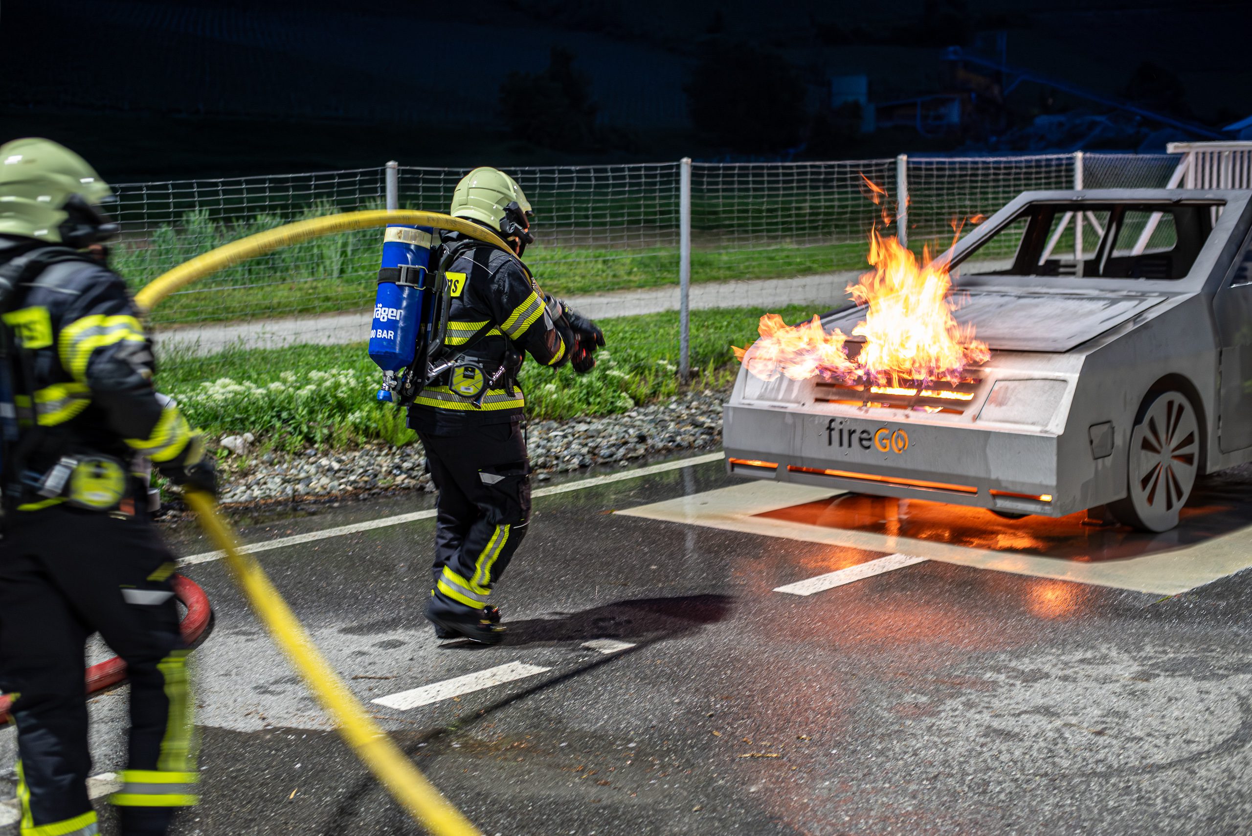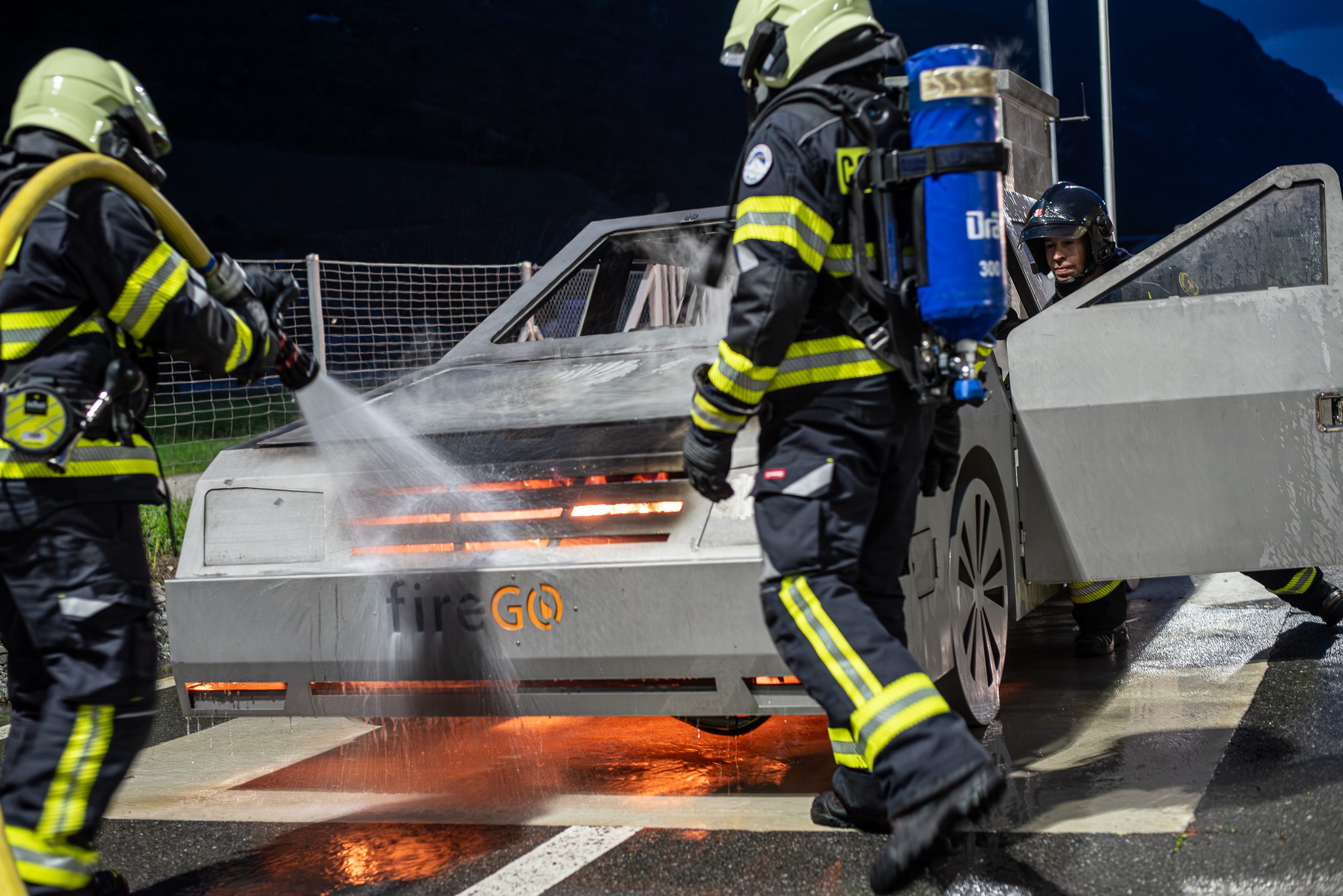Lieu : Grône • Thèmes : coordination d'équipe, ouverture de porte avec extinction, feu de voiture, désenfumage cage/local, pénétration et extinction