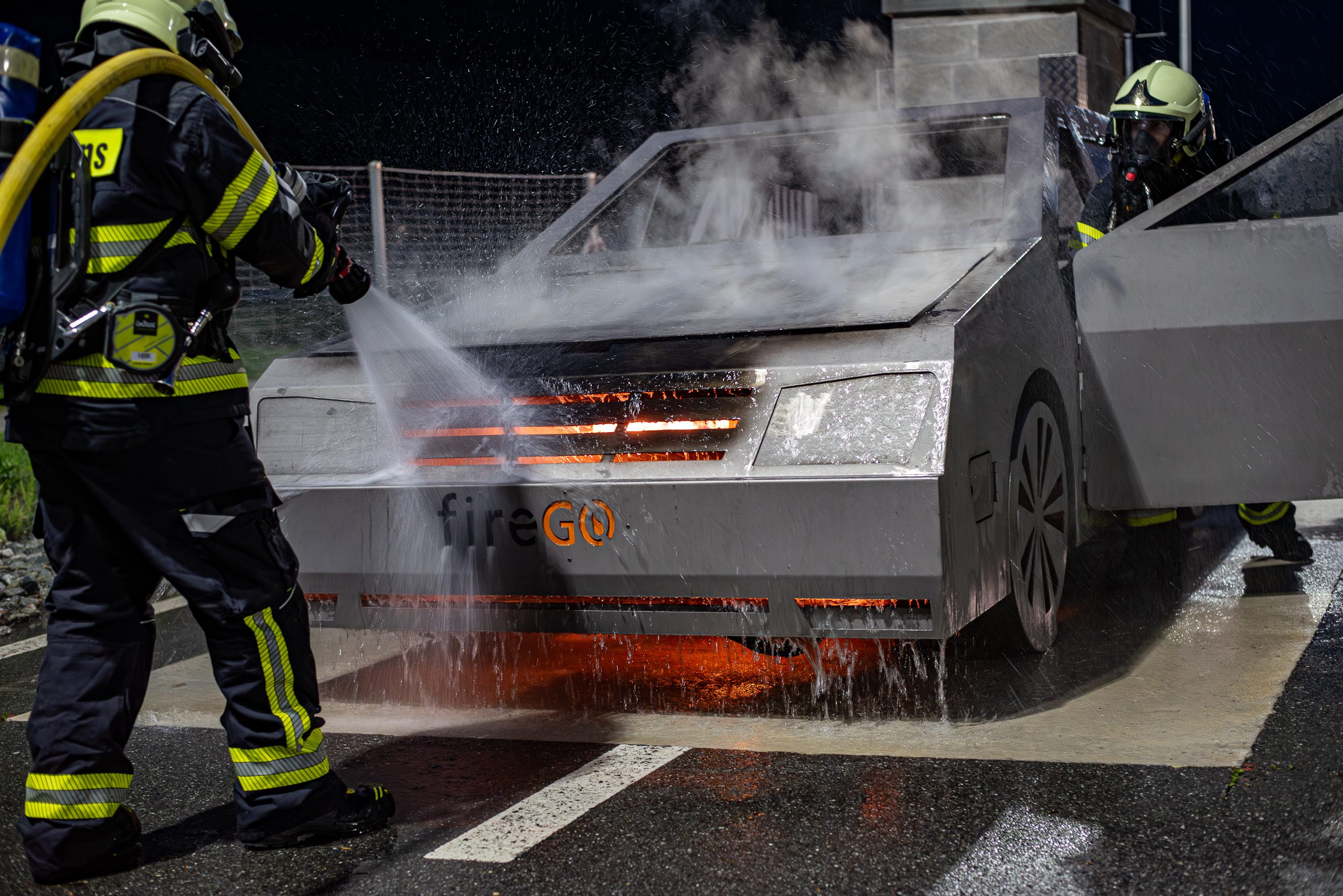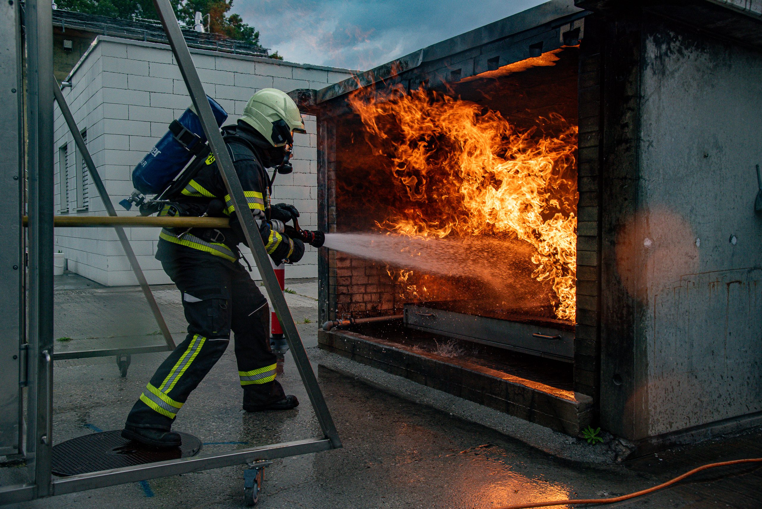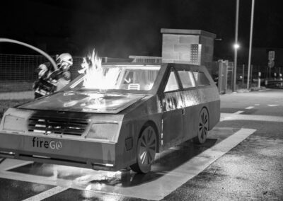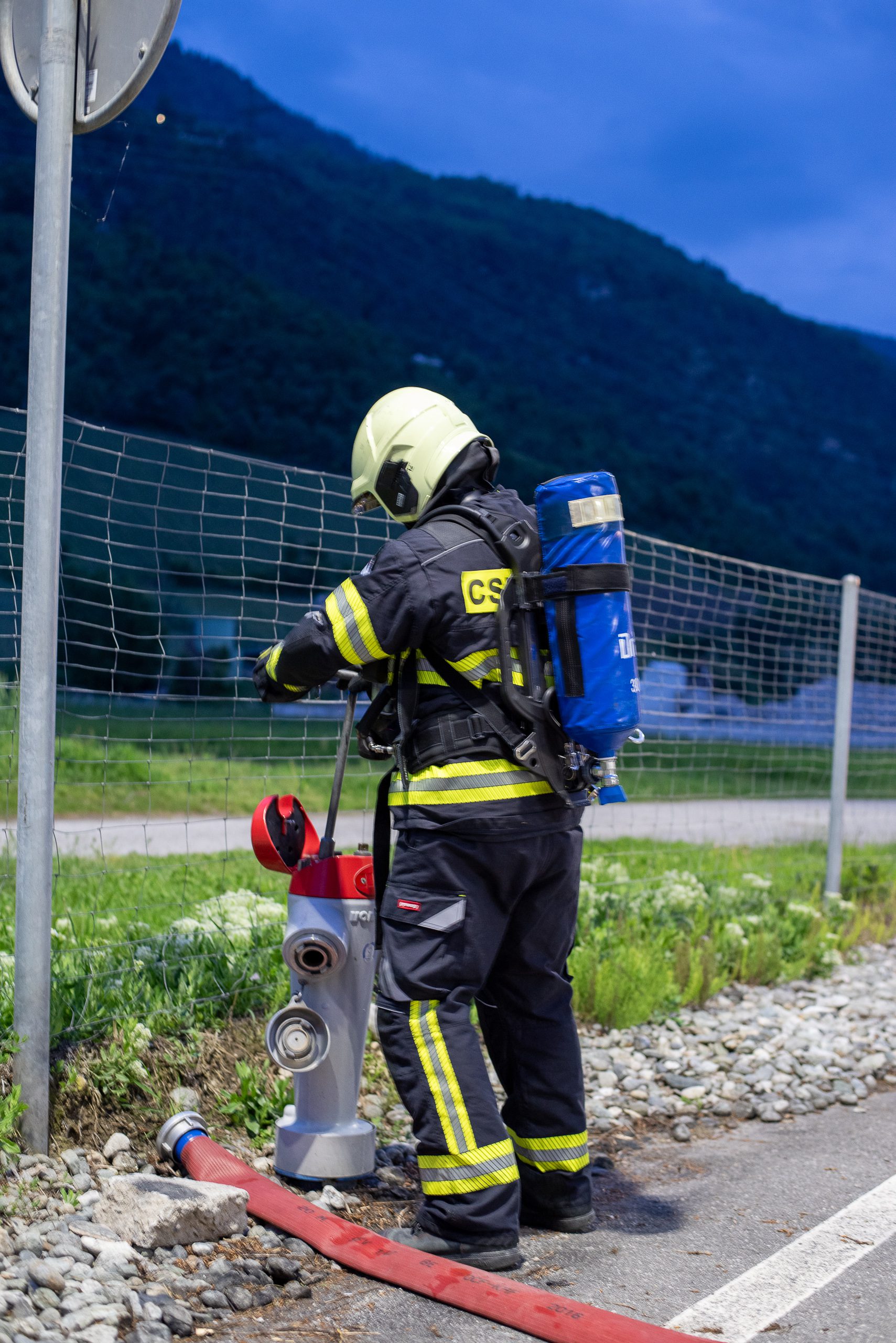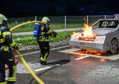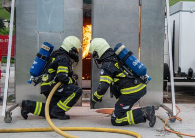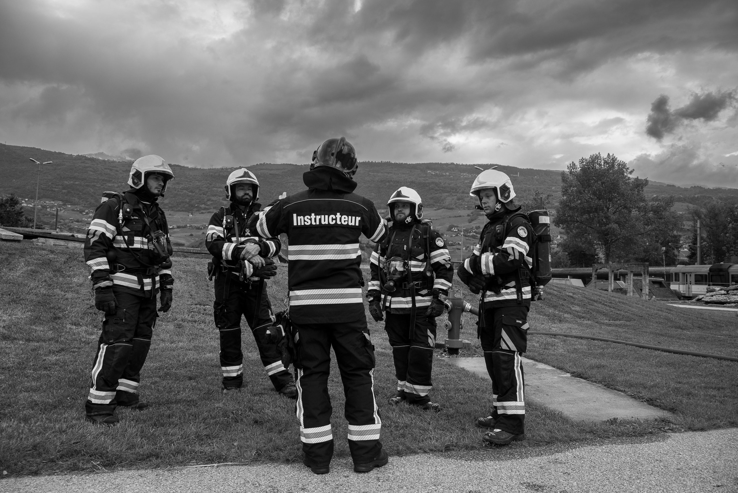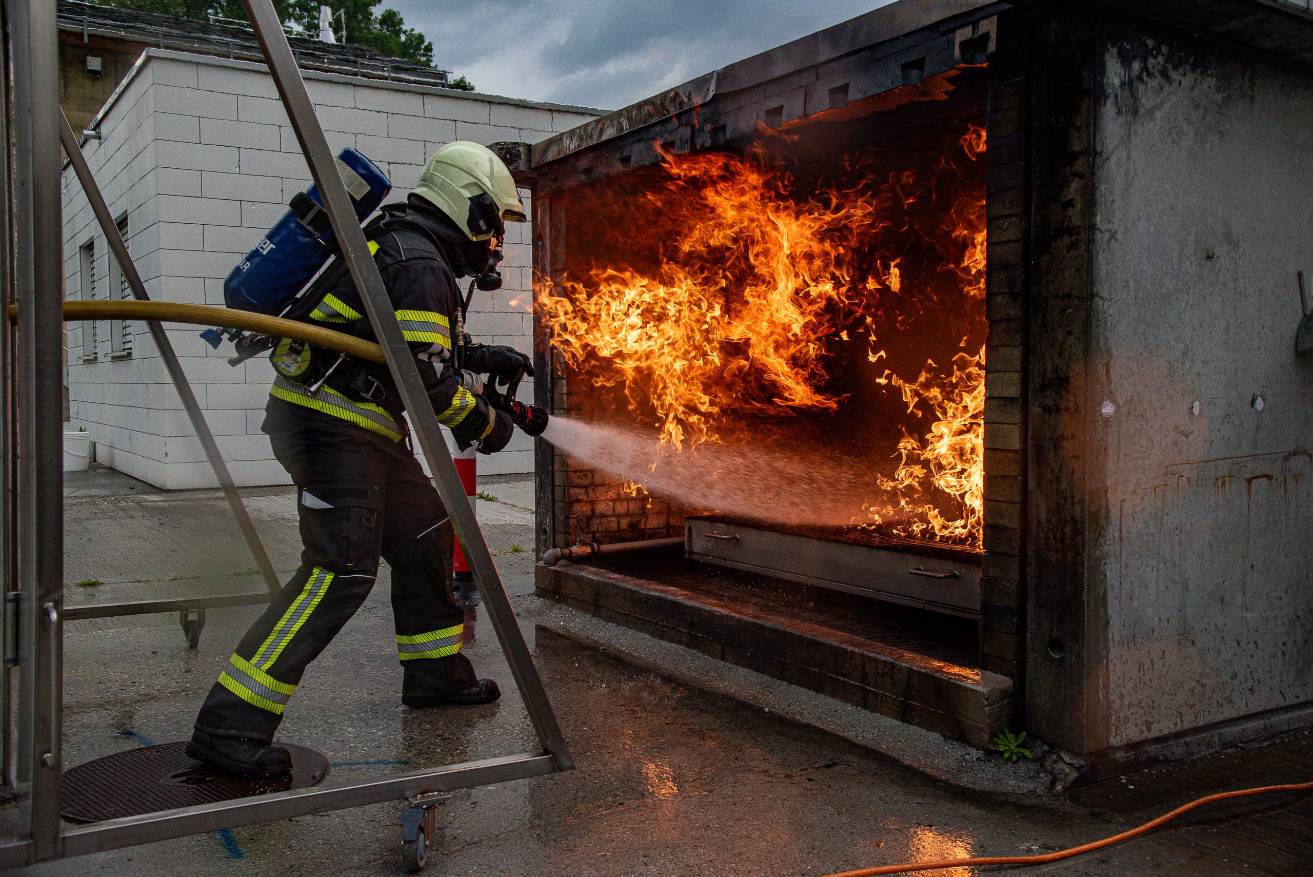 Lieu : Grône • Thèmes : coordination d'équipe, ouverture de porte avec extinction, feu de voiture, désenfumage cage/local, pénétration et extinction