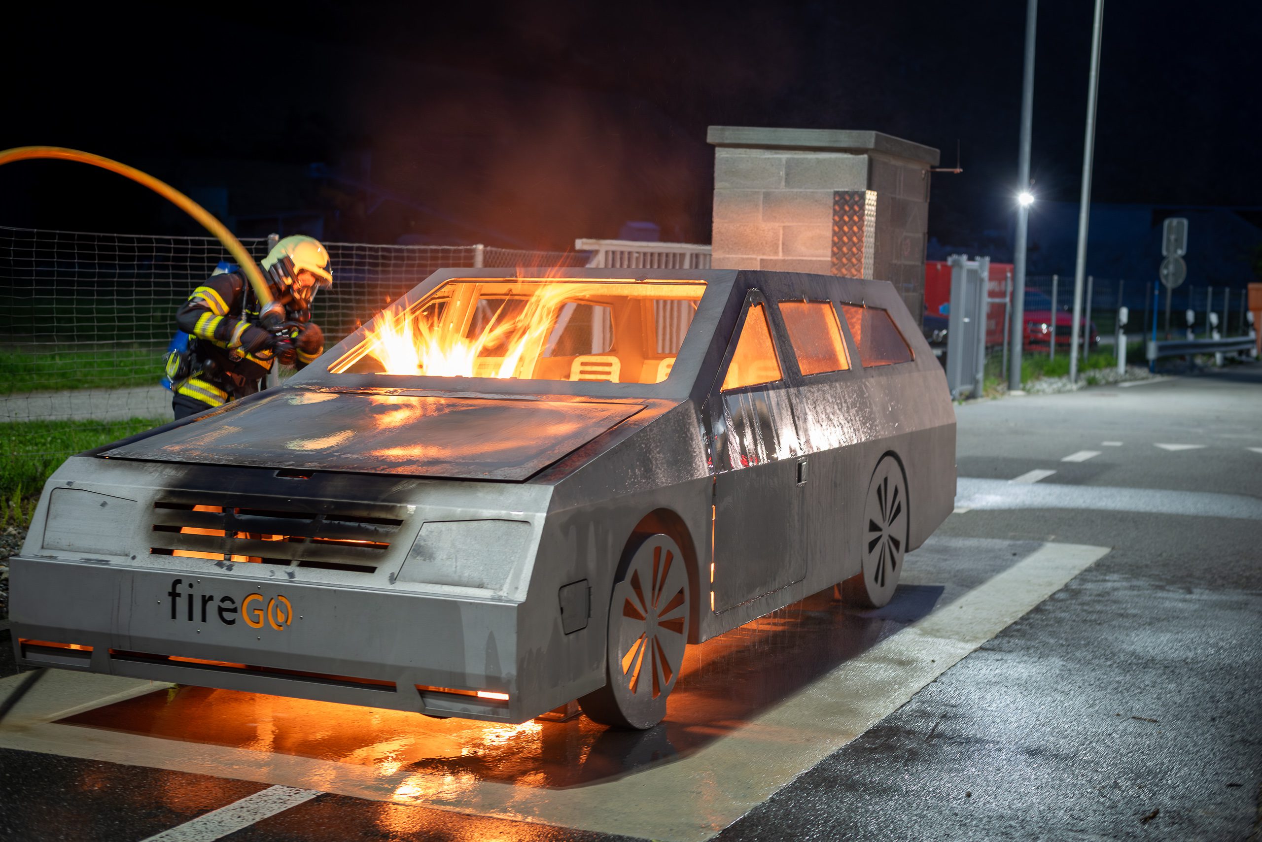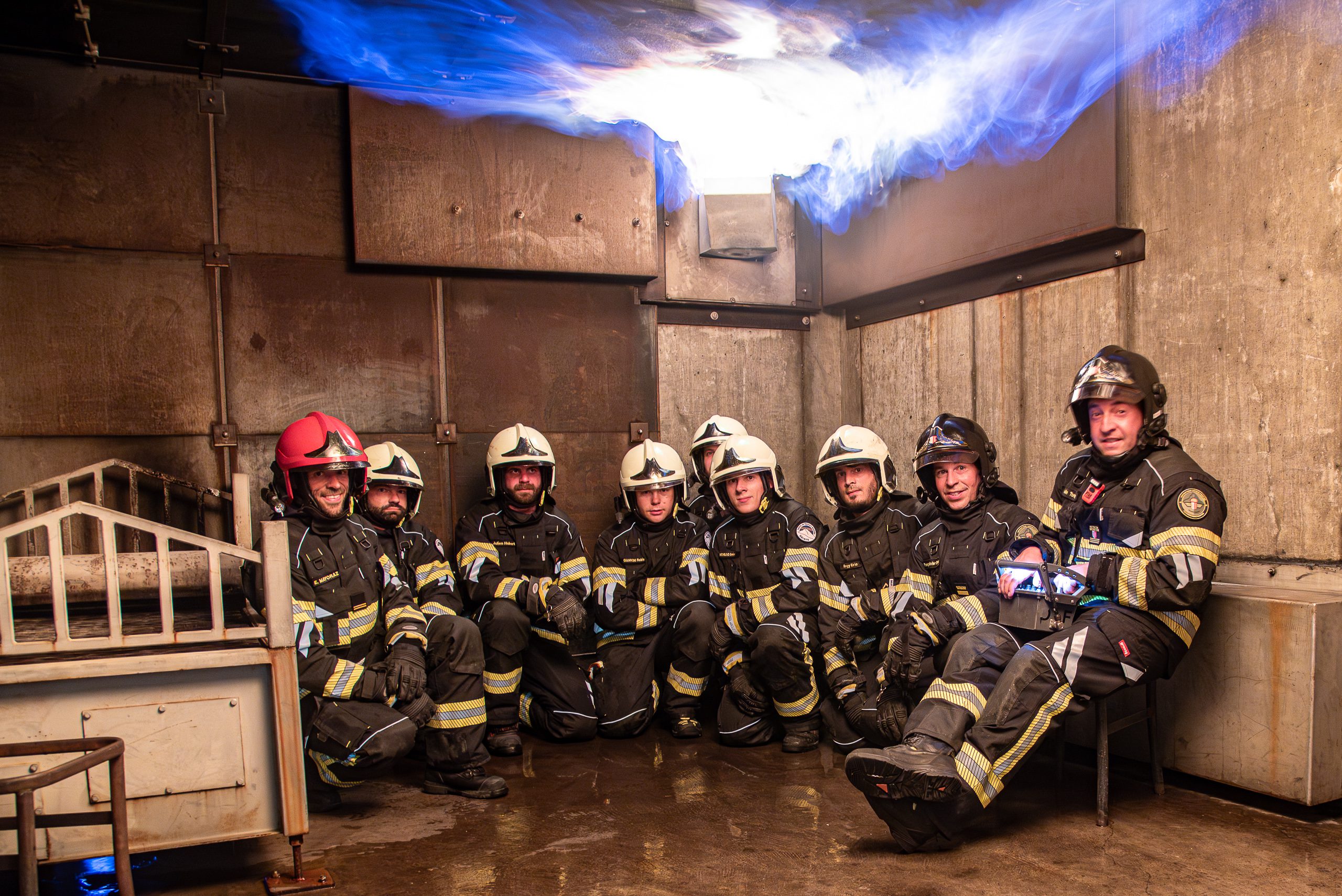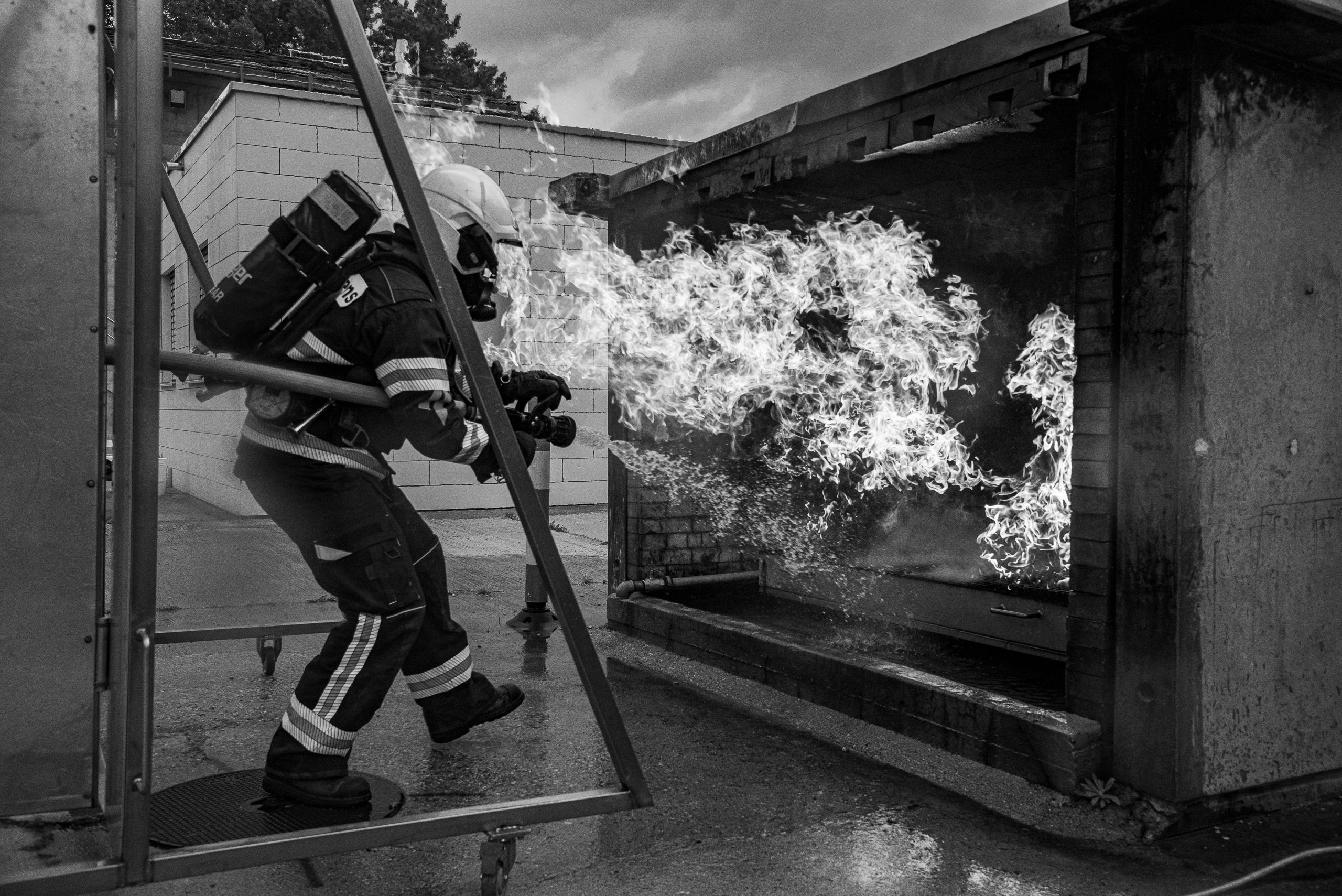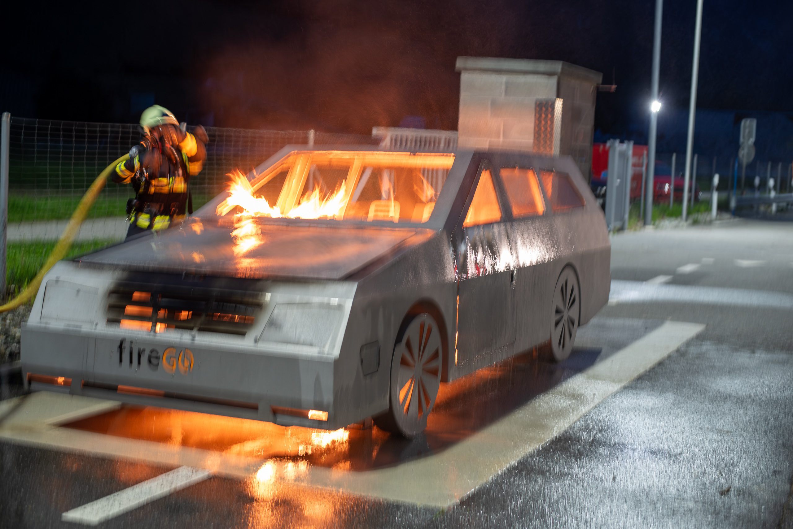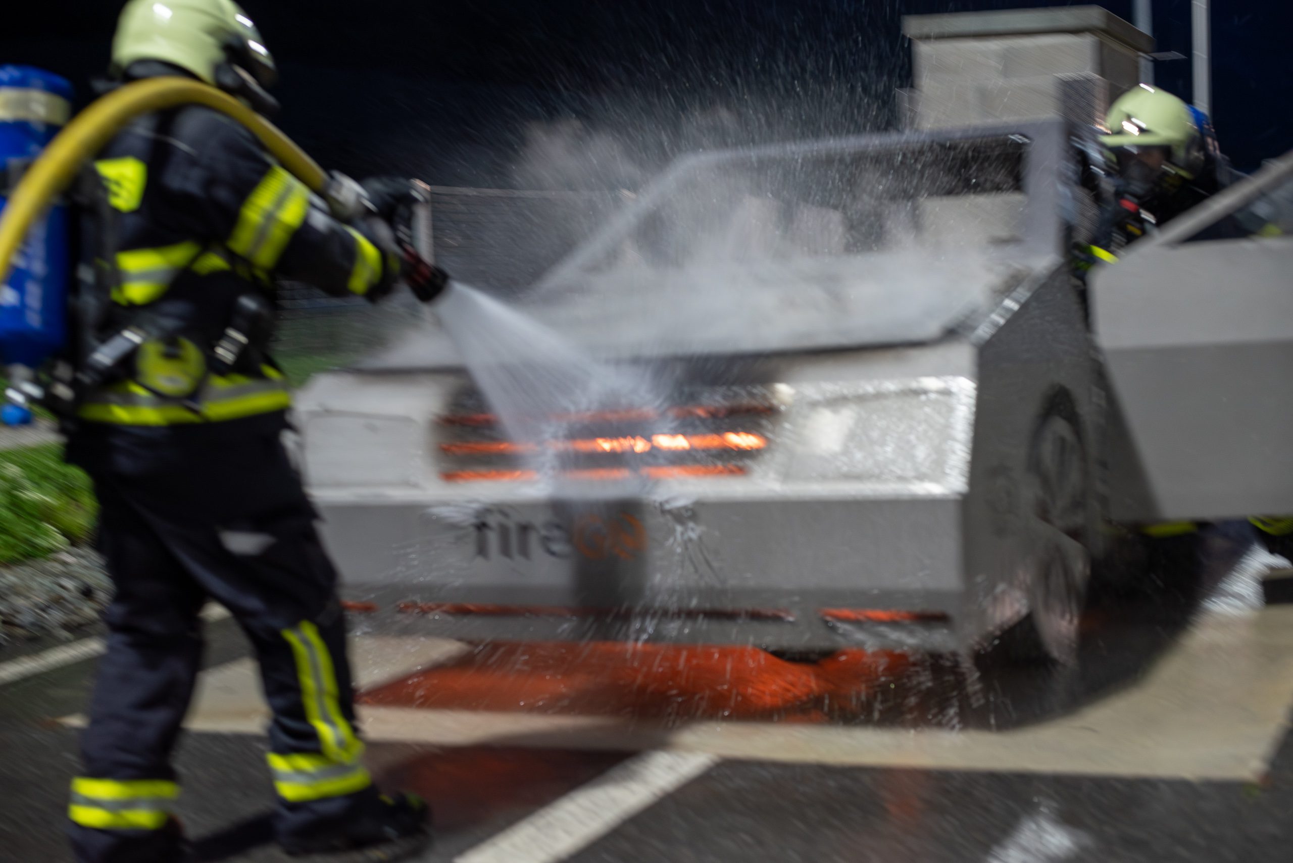 Lieu : Grône • Thèmes : coordination d'équipe, ouverture de porte avec extinction, feu de voiture, désenfumage cage/local, pénétration et extinction