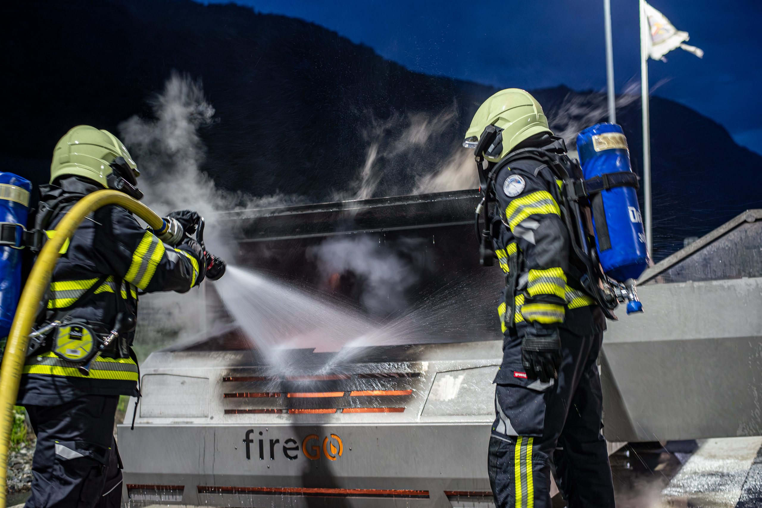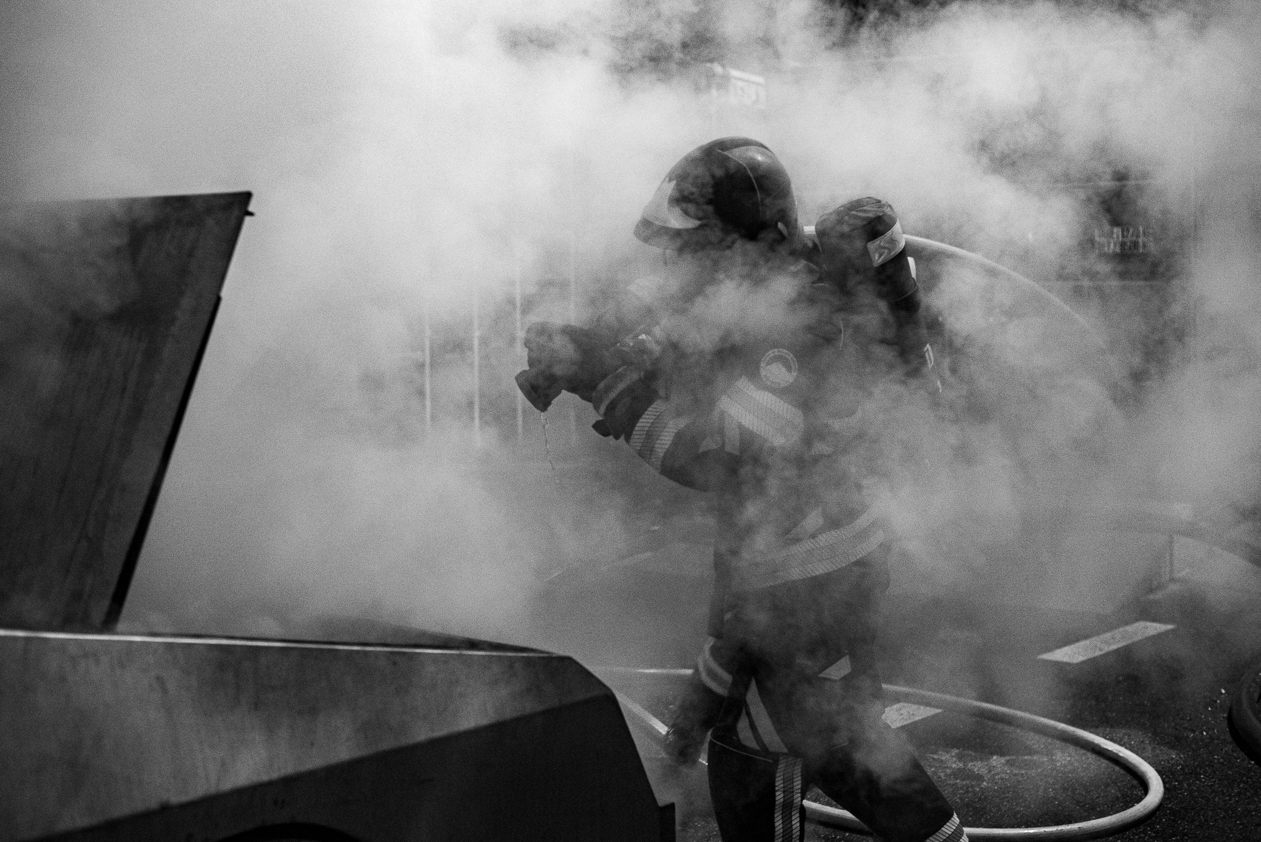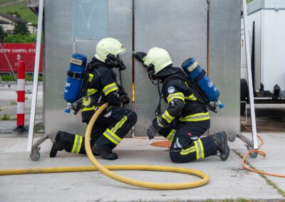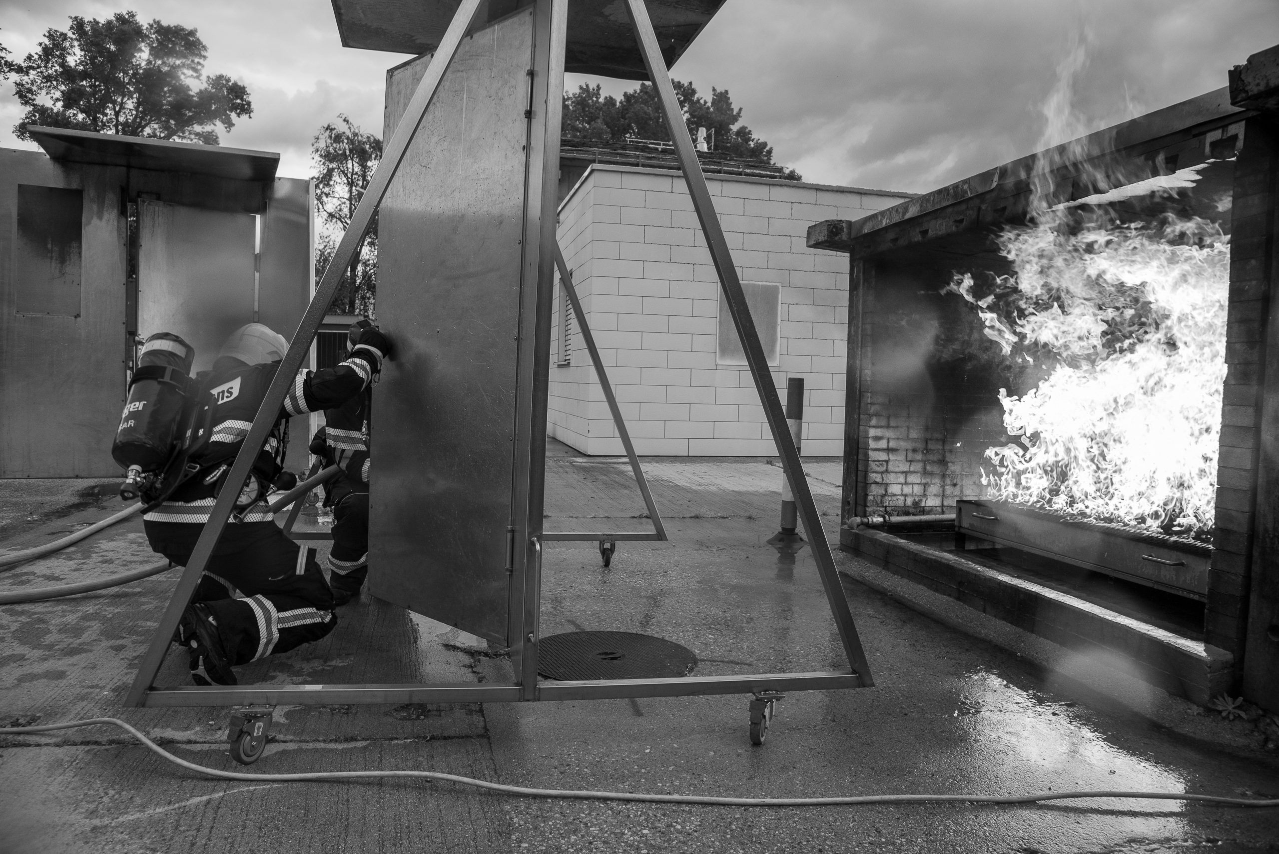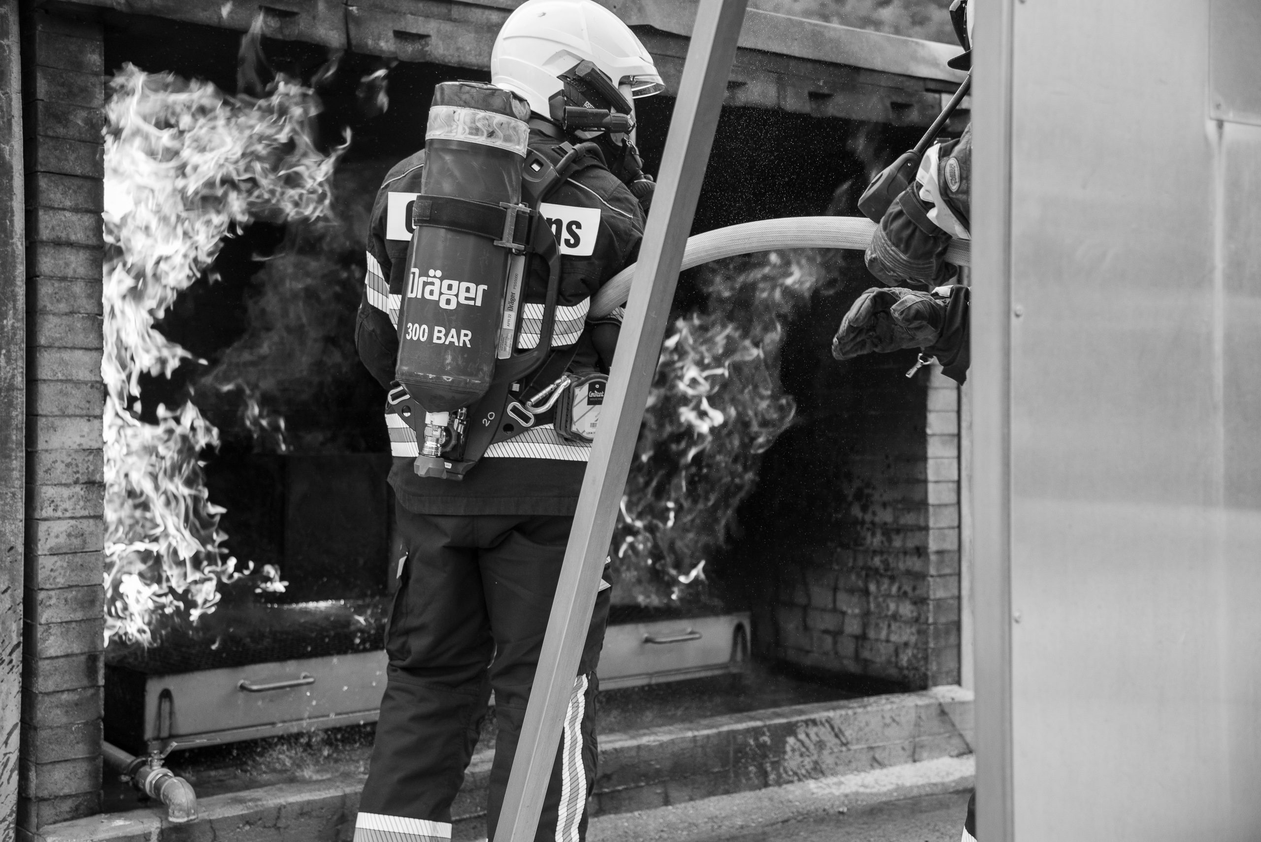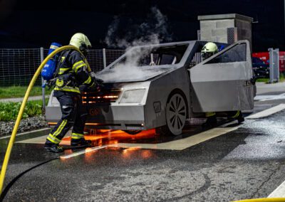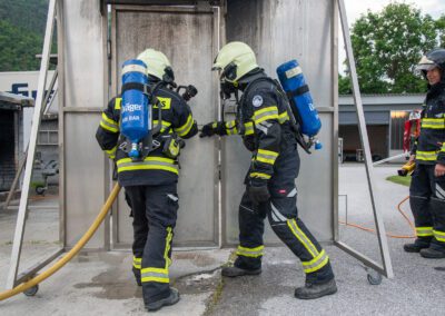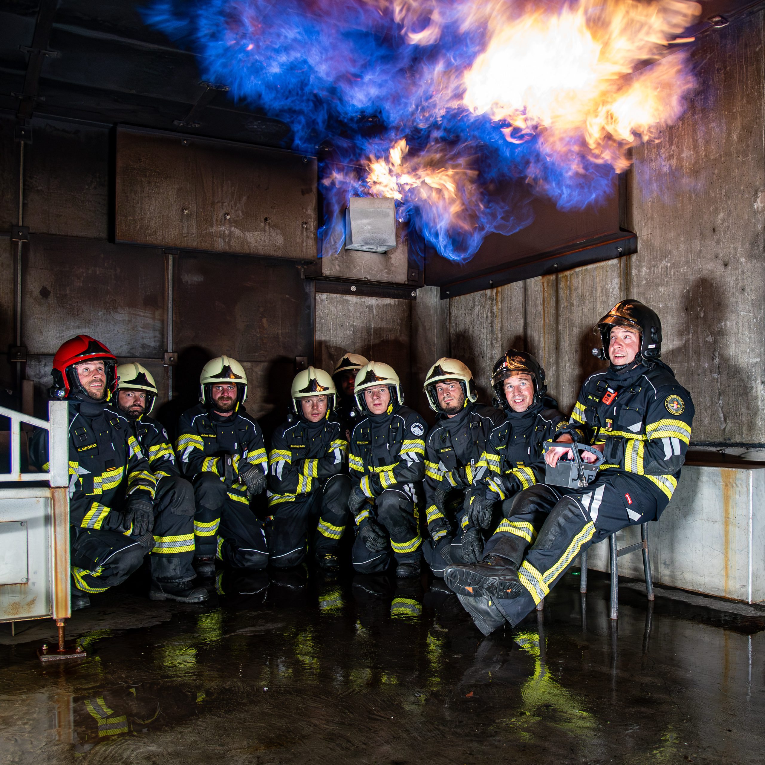 Lieu : Grône • Thèmes : coordination d'équipe, ouverture de porte avec extinction, feu de voiture, désenfumage cage/local, pénétration et extinction