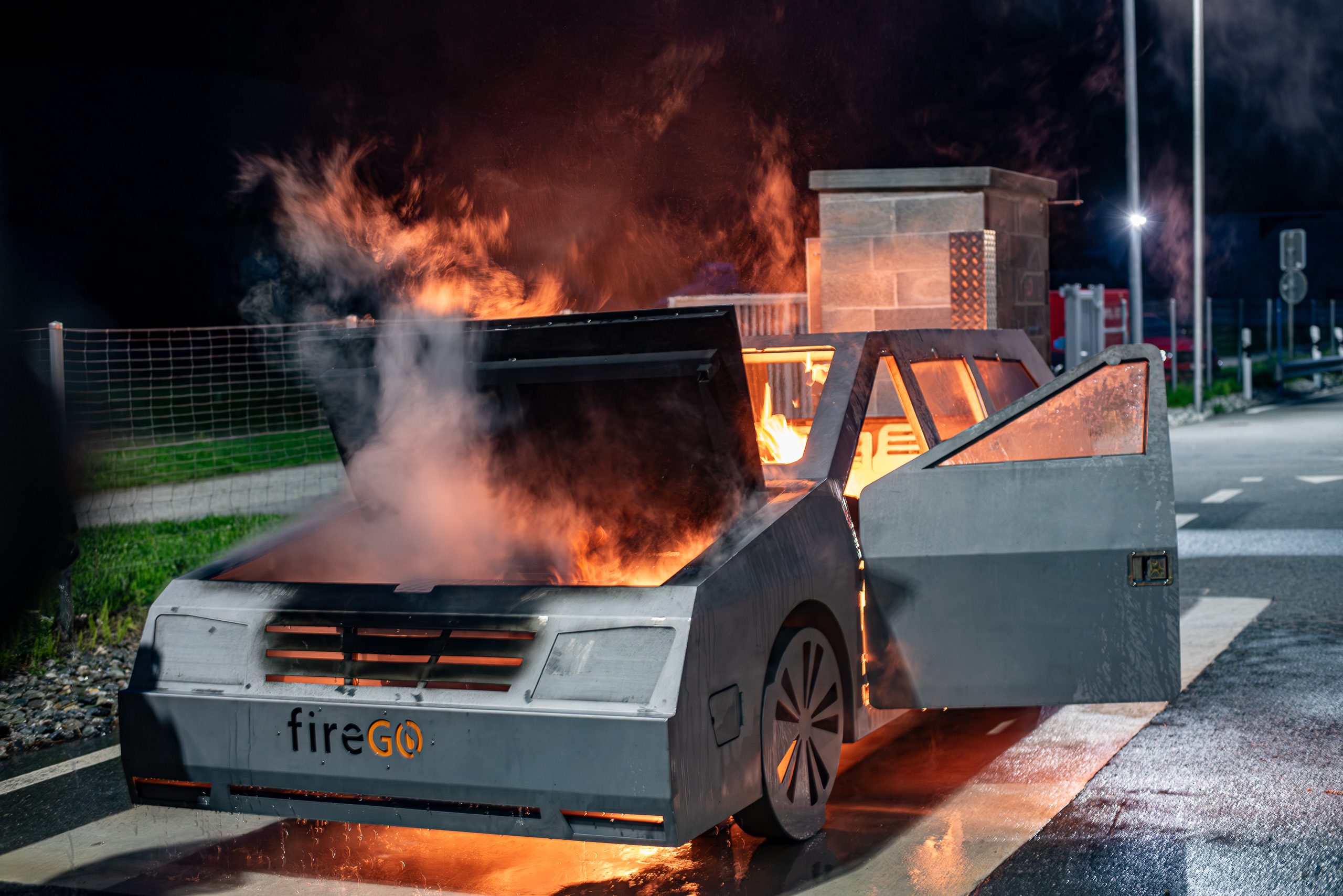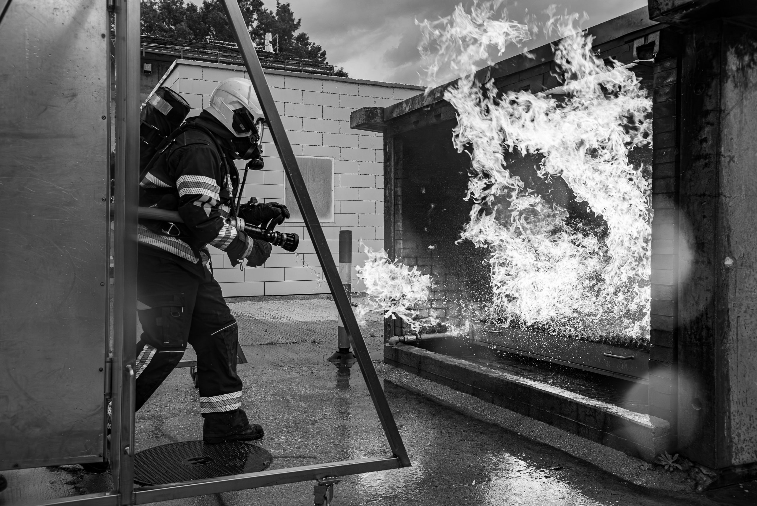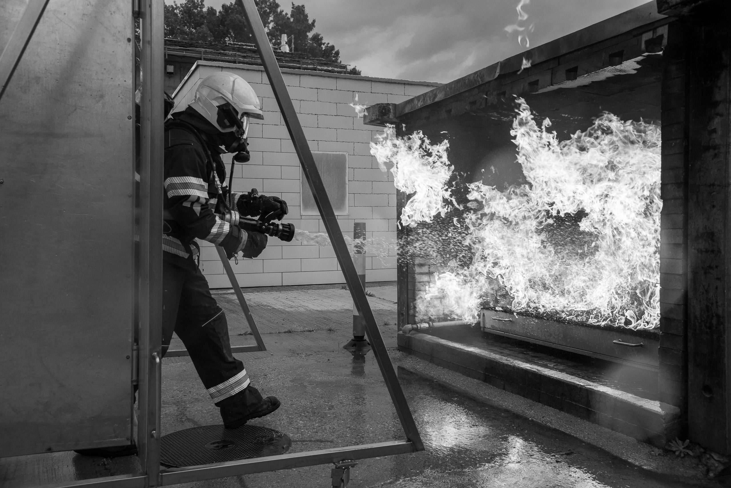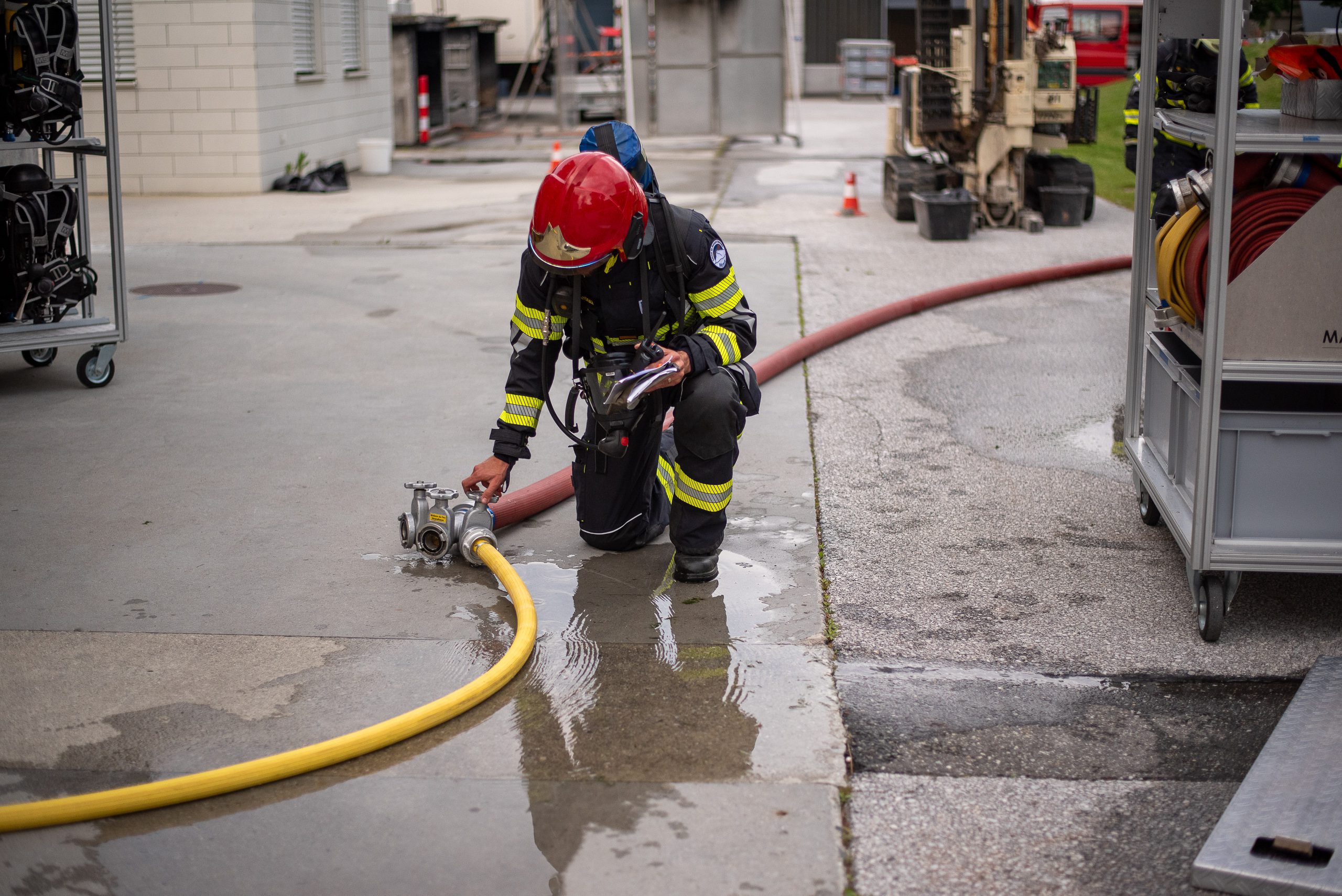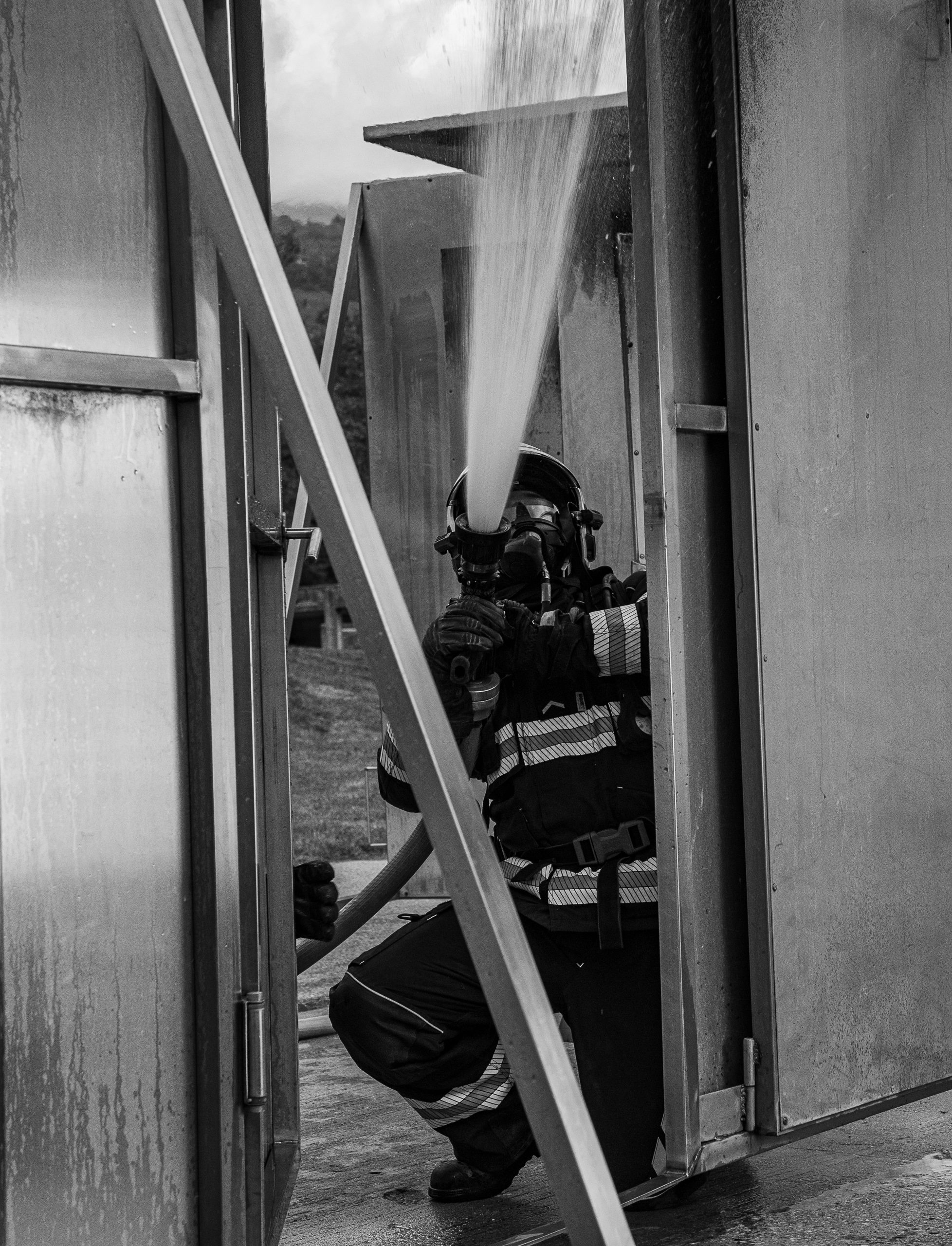 Lieu : Grône • Thèmes : coordination d'équipe, ouverture de porte avec extinction, feu de voiture, désenfumage cage/local, pénétration et extinction
