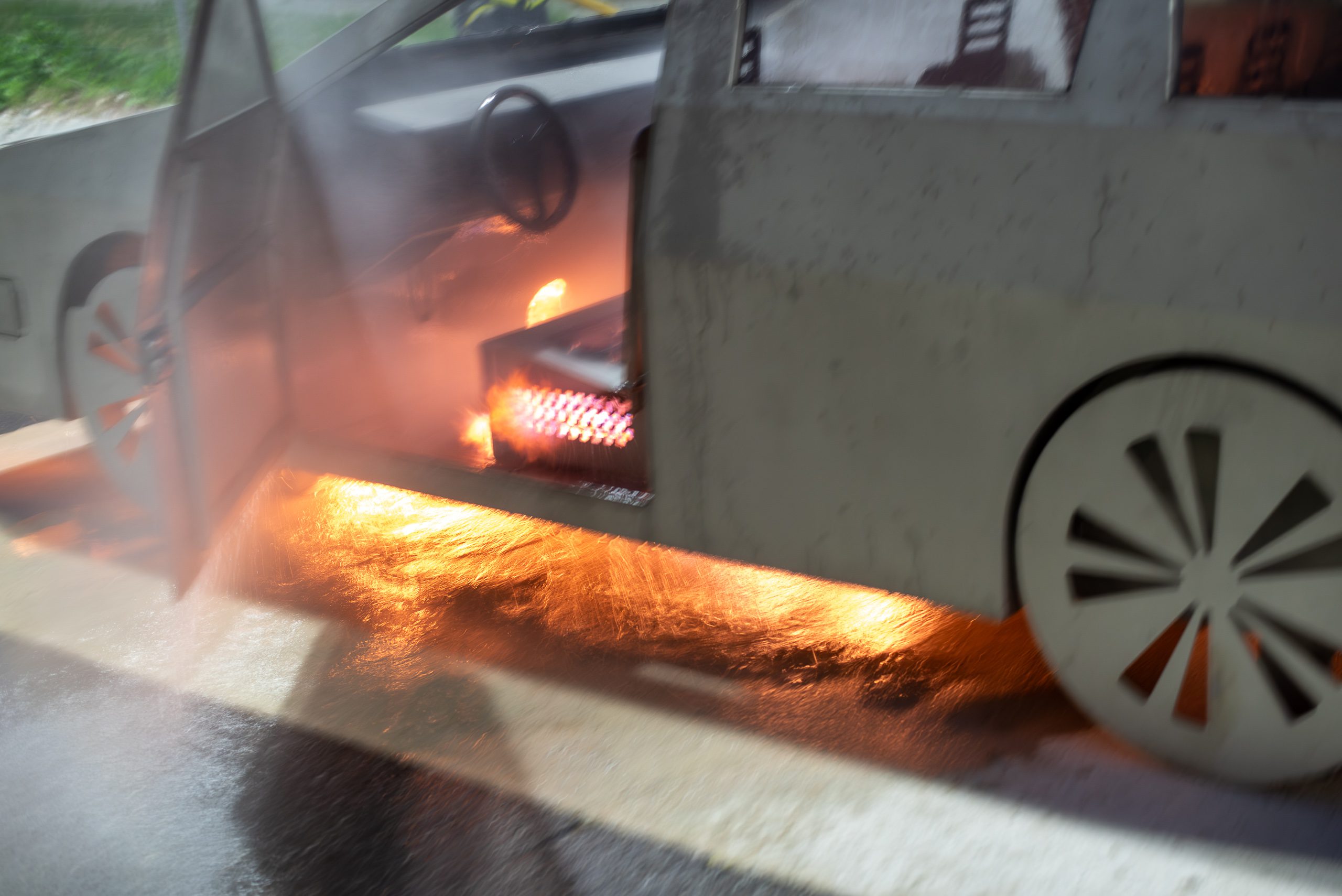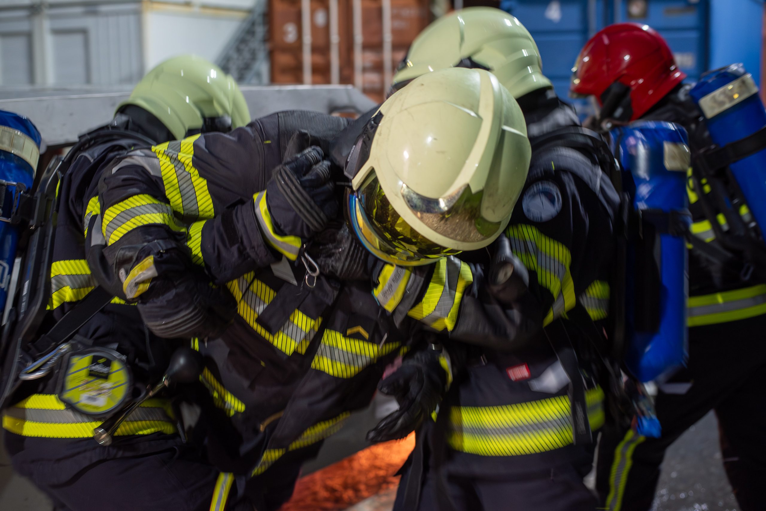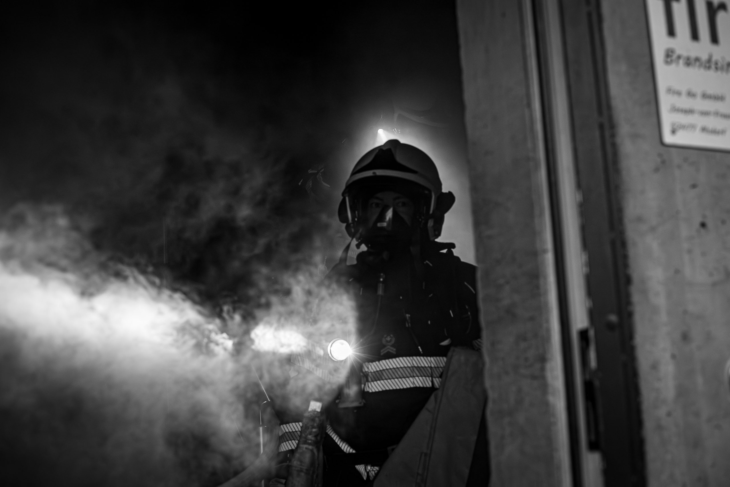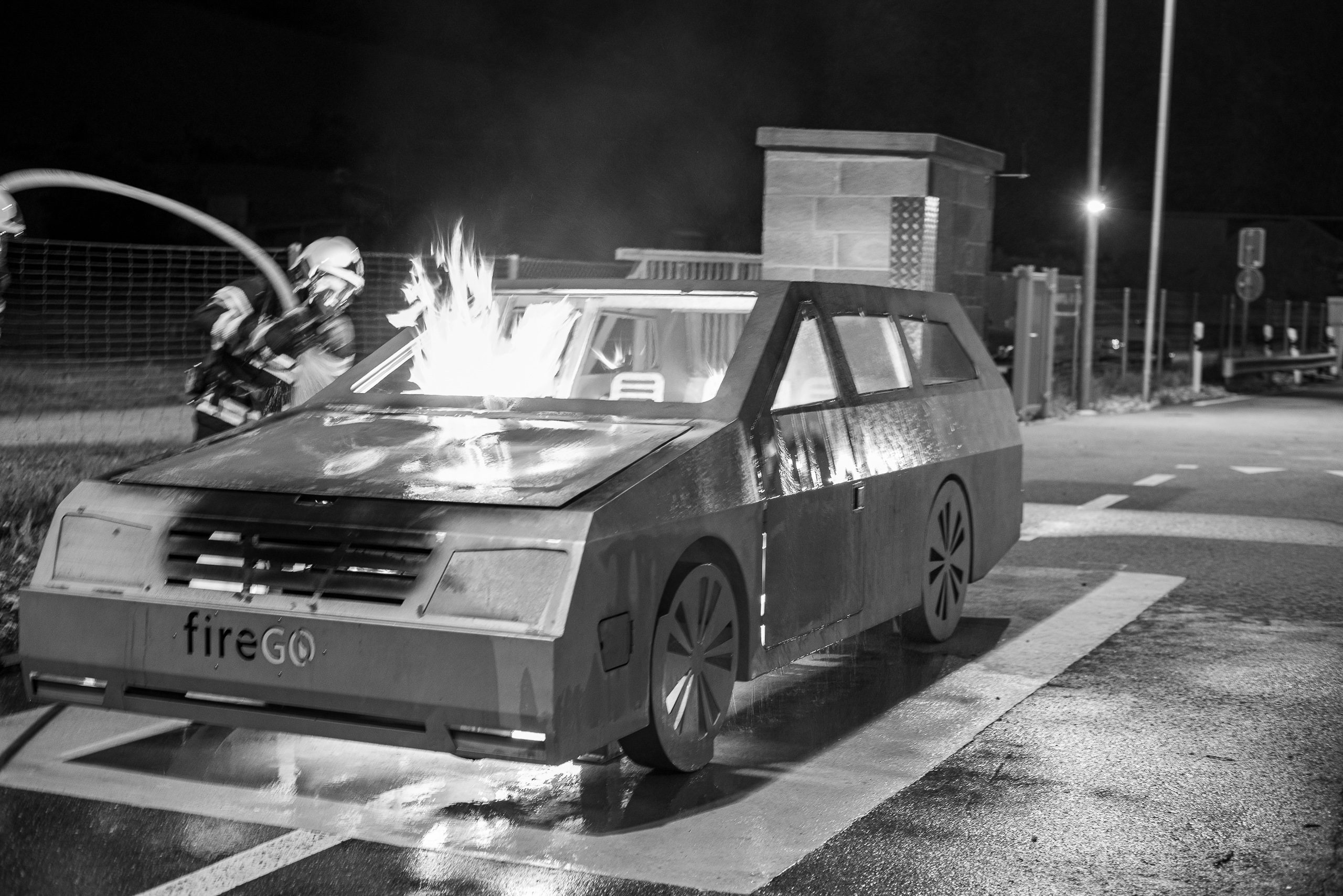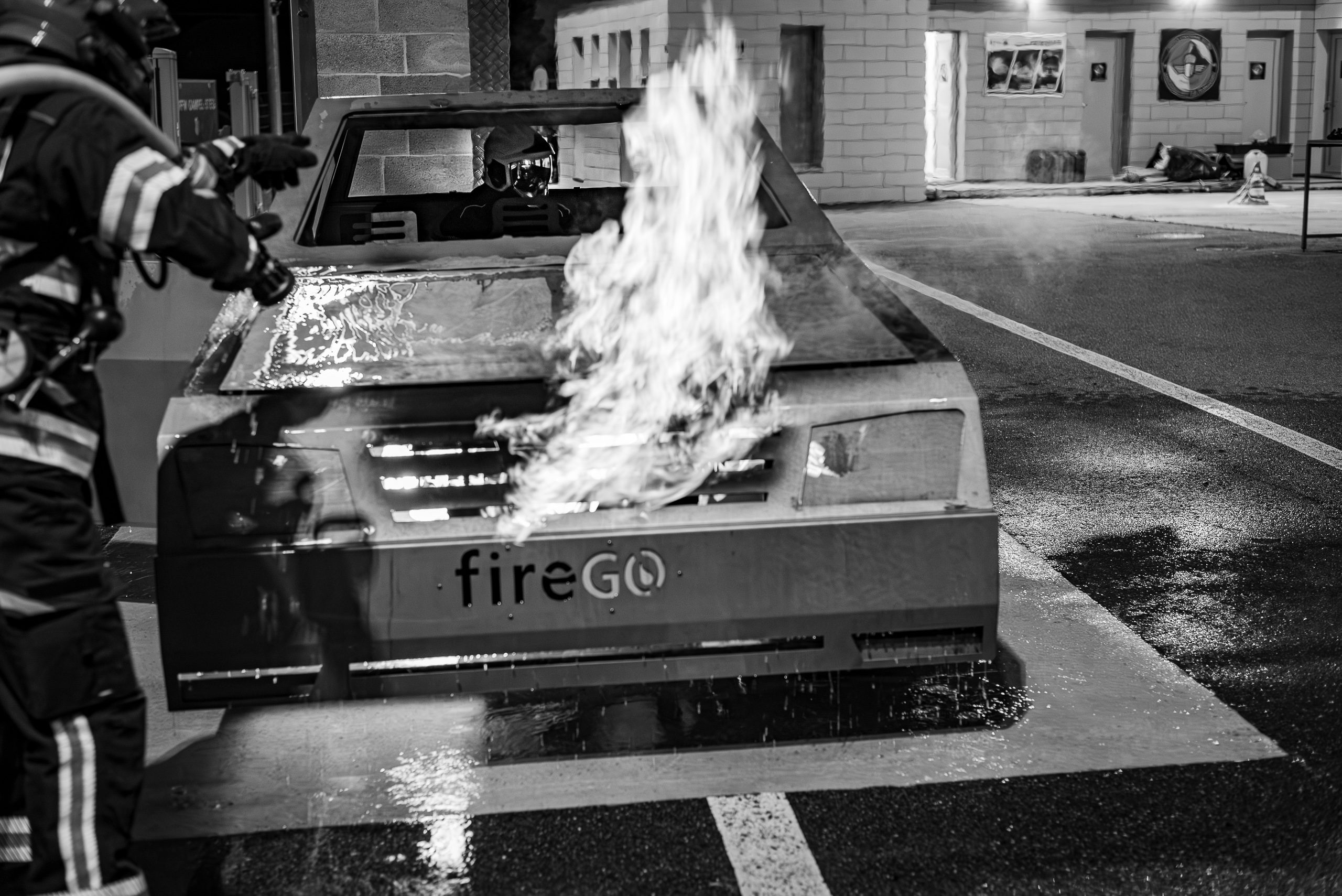 Lieu : Grône • Thèmes : coordination d'équipe, ouverture de porte avec extinction, feu de voiture, désenfumage cage/local, pénétration et extinction