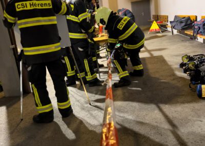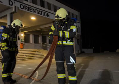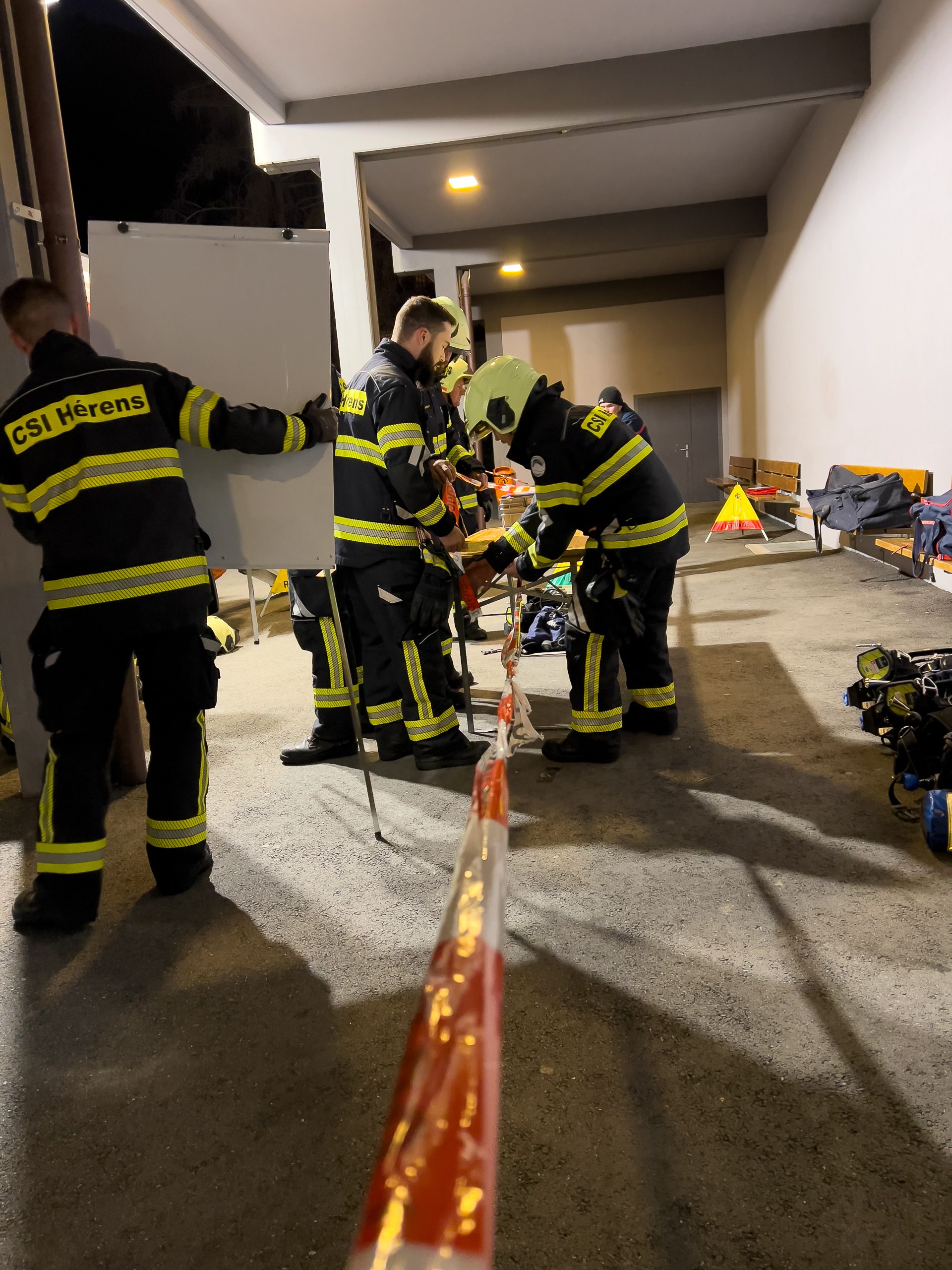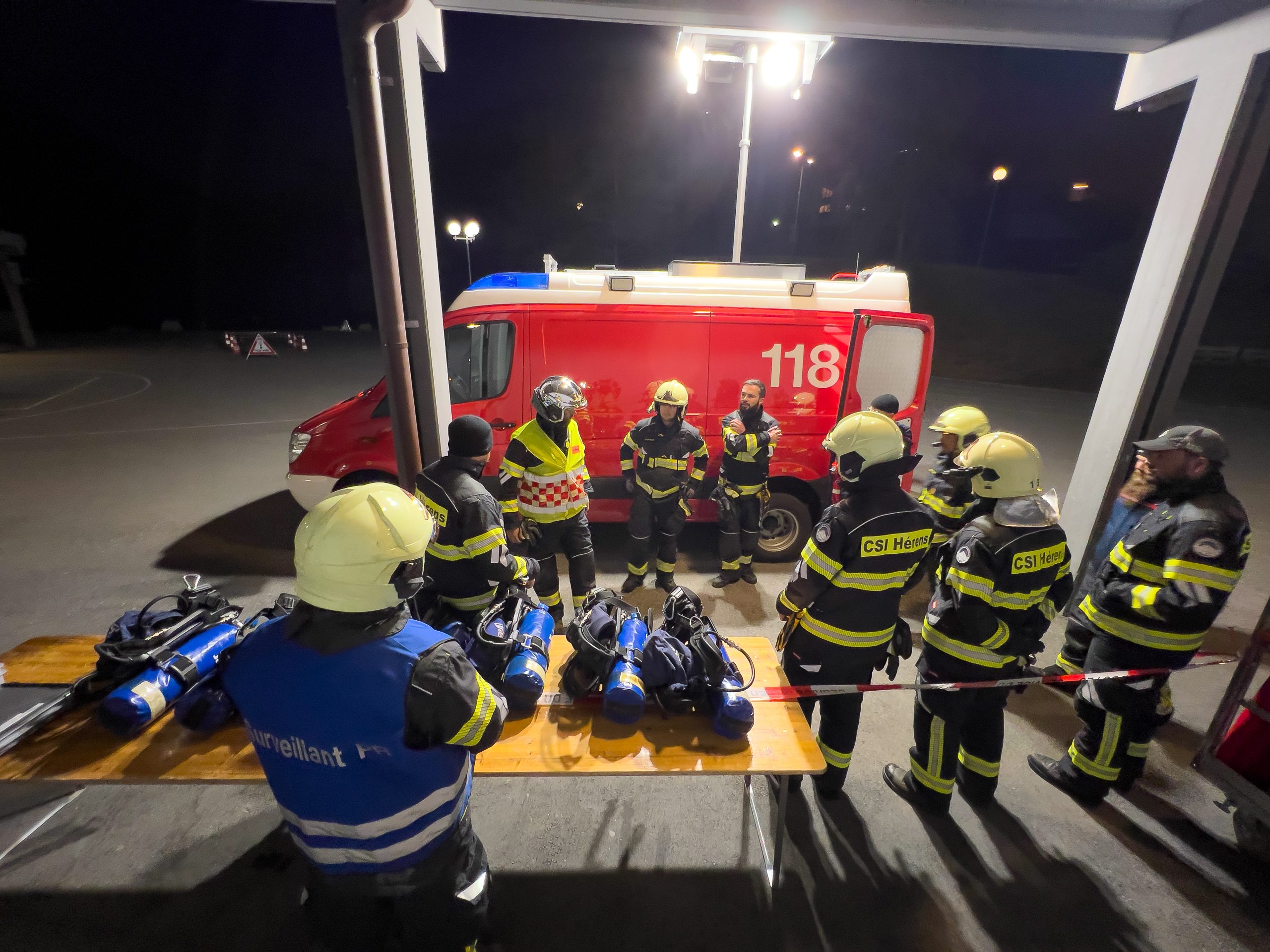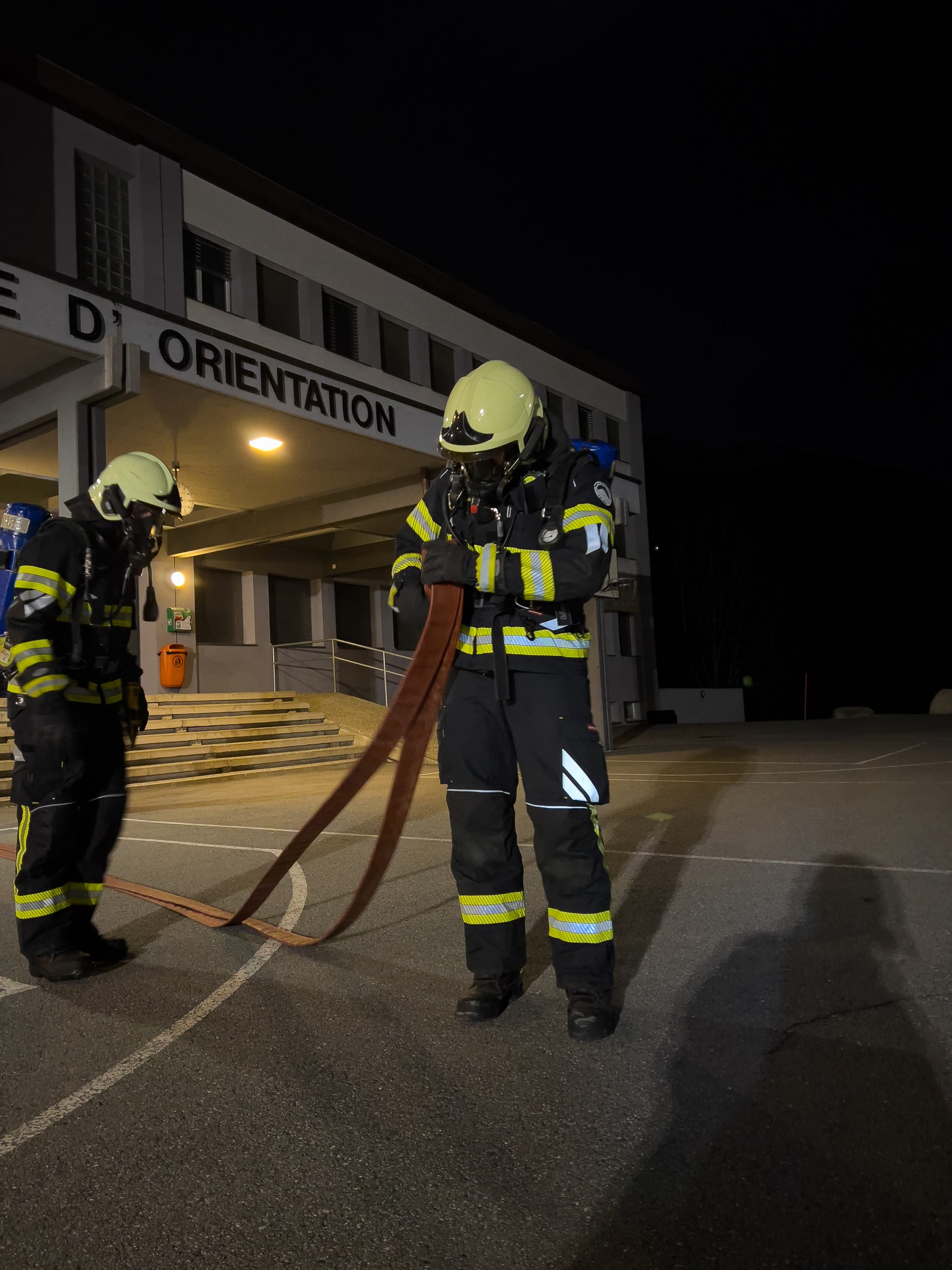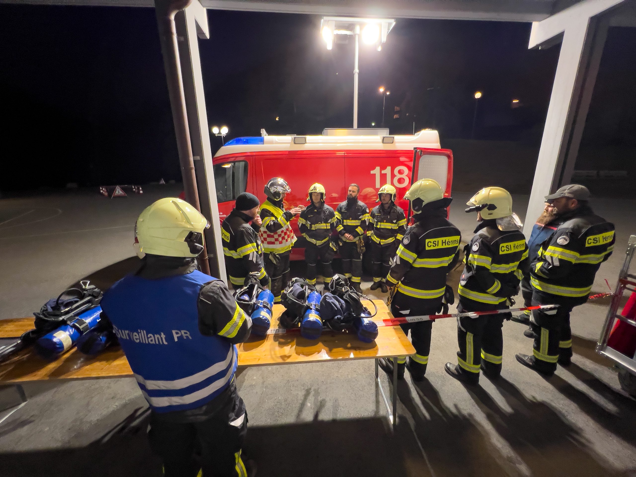 Séance de protection respiratoire réalisée au centre scolaire : reconnaissance et progression en binômes sur lignes guide, mise en place de repères, contrôle régulier des appareils respiratoires (ARI) et points de sécurité. Les équipes ont travaillé la communication radio avec le poste de conduite et la gestion des flux entre les binômes. Des mises en situation réalistes ont permis d’entraîner l’orientation, la recherche et la sortie sous faible visibilité, suivies d’un débriefing axé sécurité et bonnes pratiques et exercices de cardio et d'endurance.