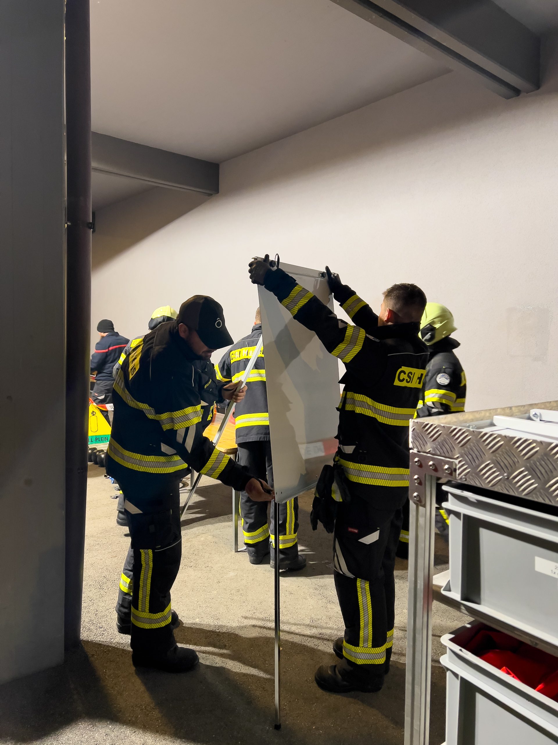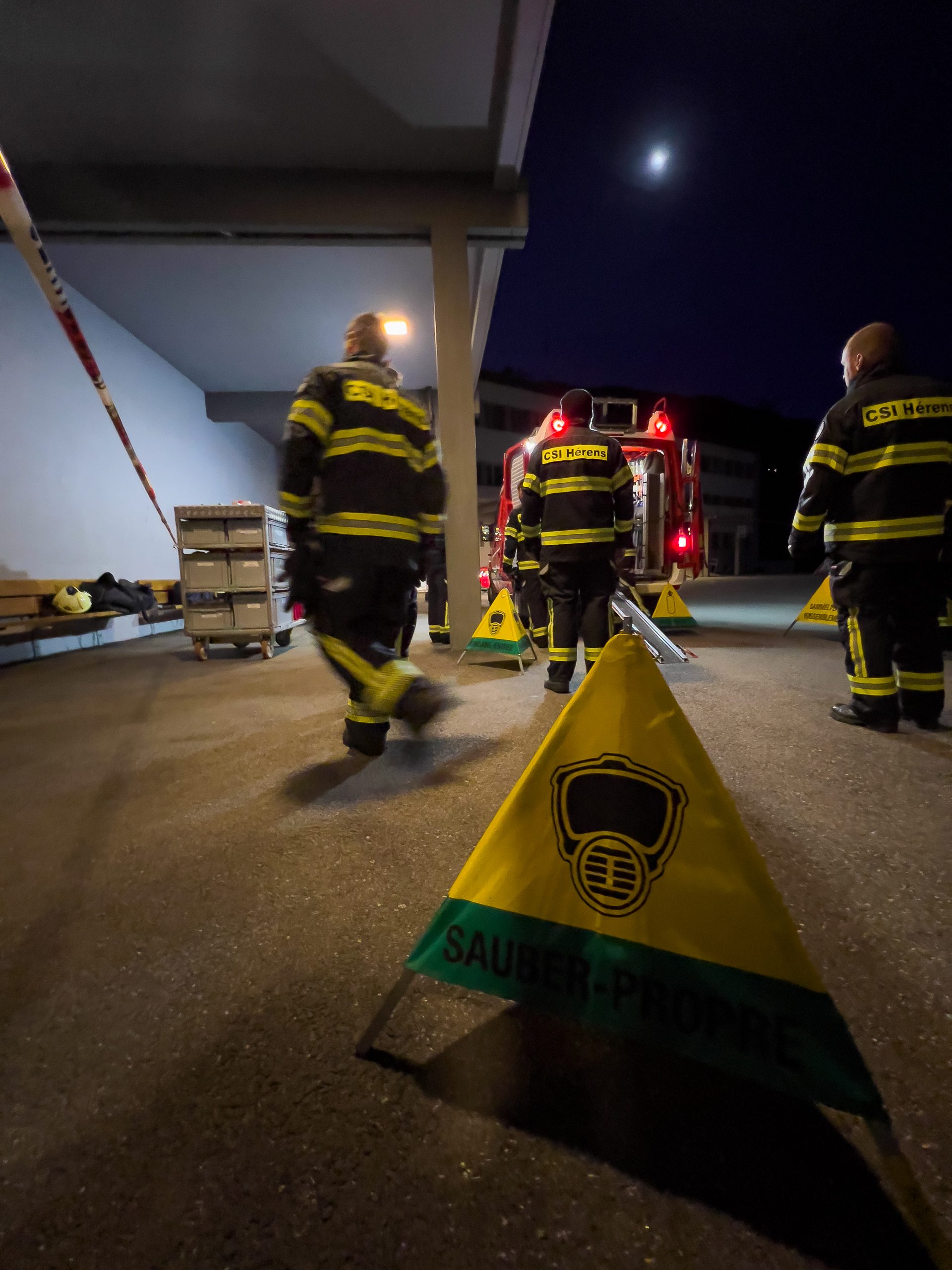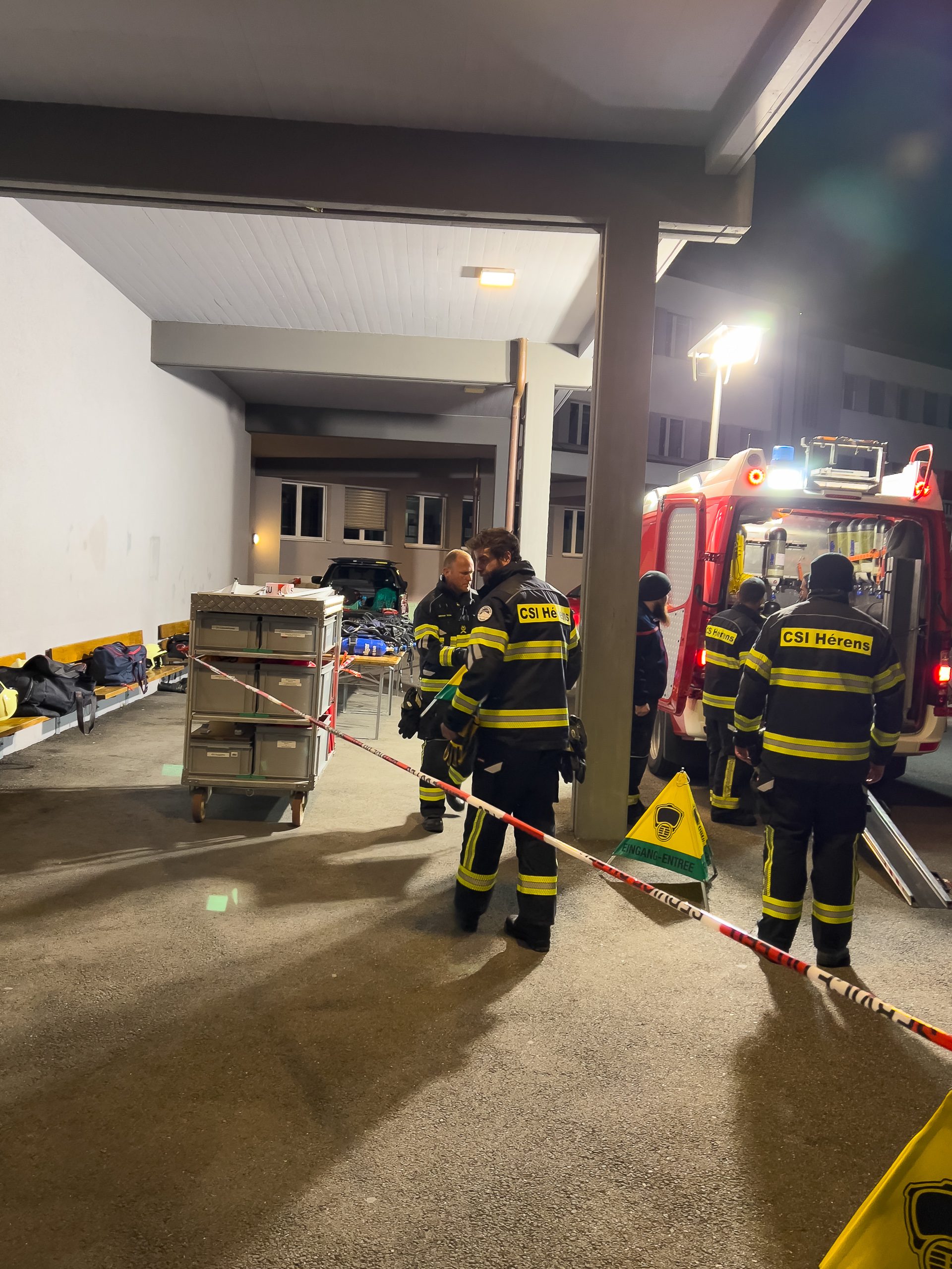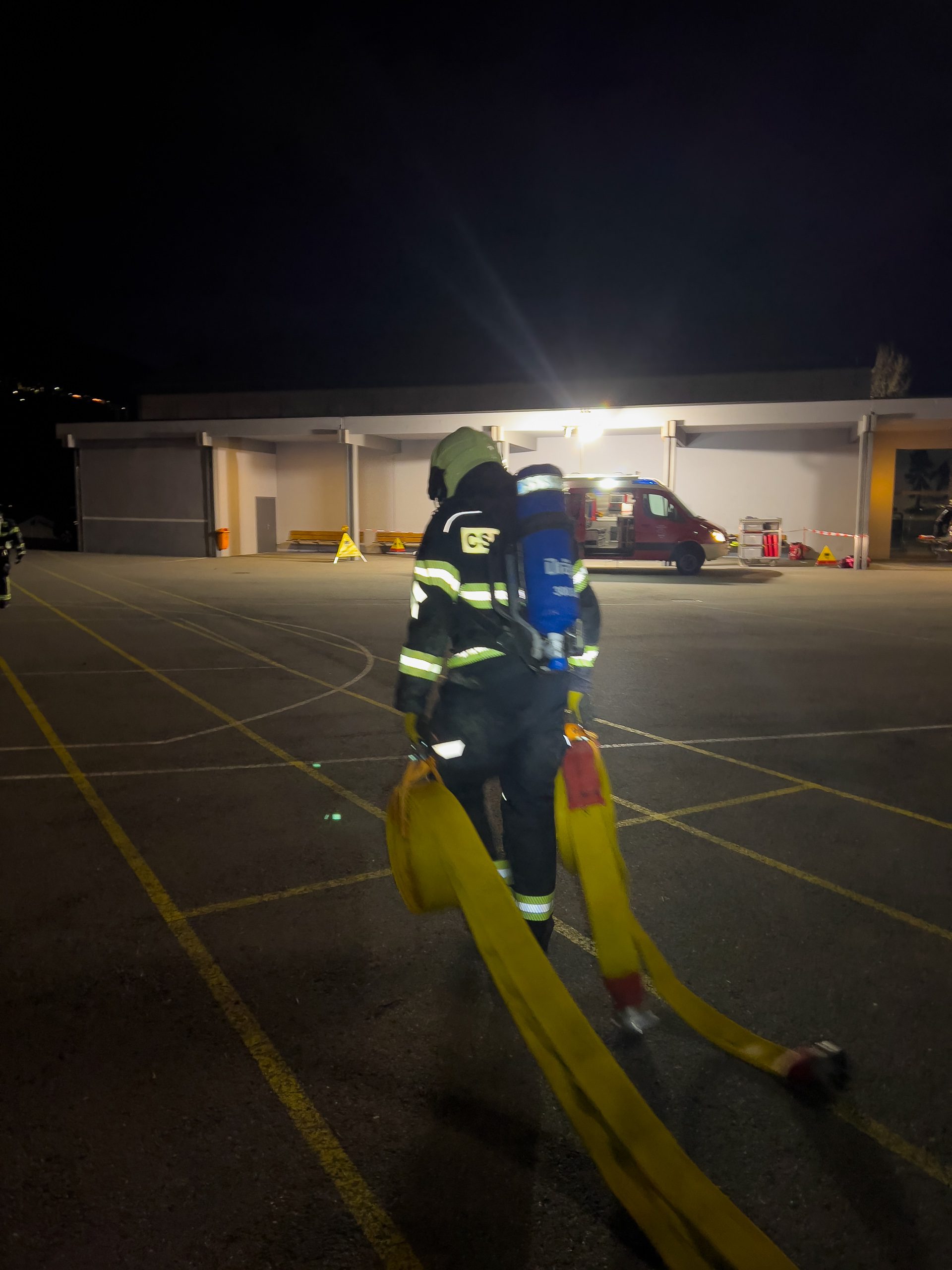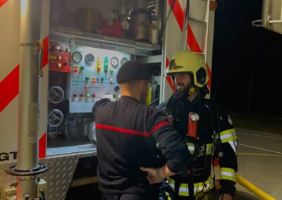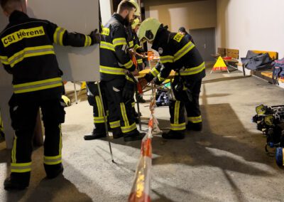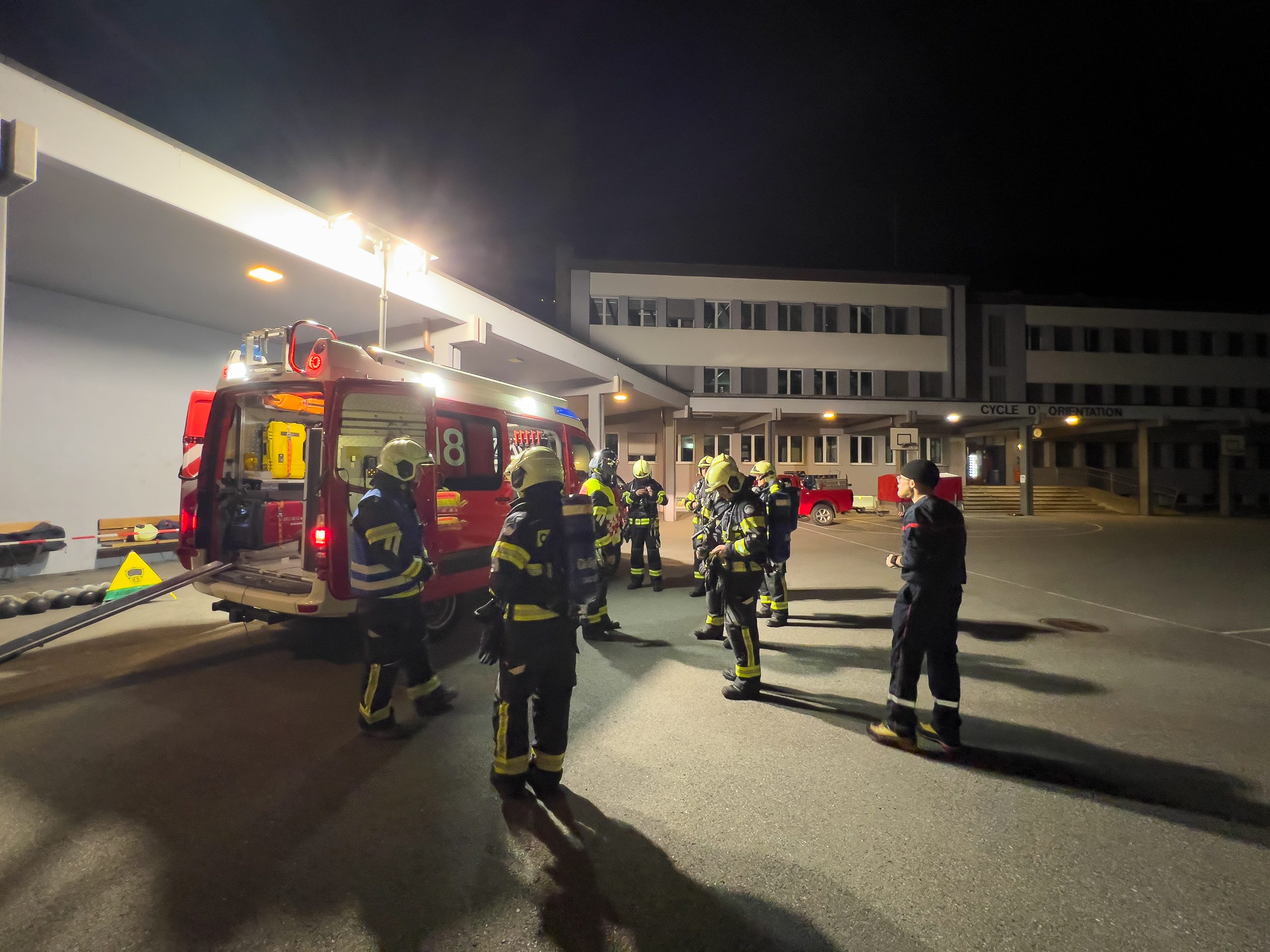 Séance de protection respiratoire réalisée au centre scolaire : reconnaissance et progression en binômes sur lignes guide, mise en place de repères, contrôle régulier des appareils respiratoires (ARI) et points de sécurité. Les équipes ont travaillé la communication radio avec le poste de conduite et la gestion des flux entre les binômes. Des mises en situation réalistes ont permis d’entraîner l’orientation, la recherche et la sortie sous faible visibilité, suivies d’un débriefing axé sécurité et bonnes pratiques et exercices de cardio et d'endurance.