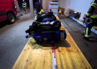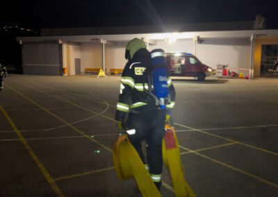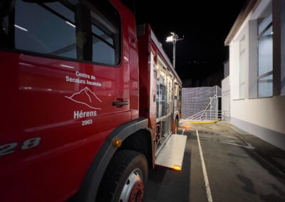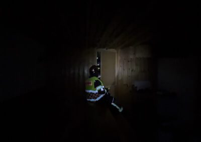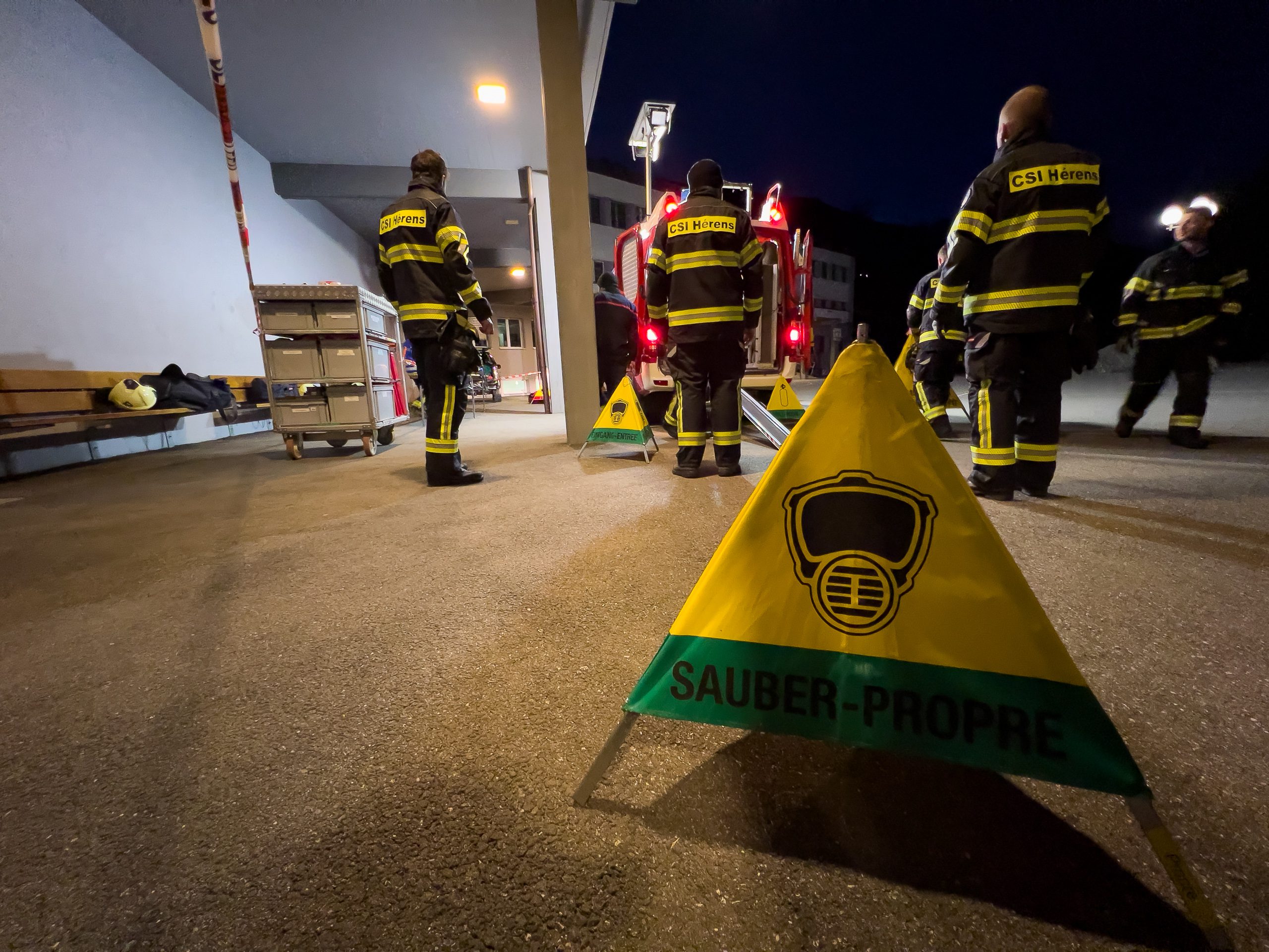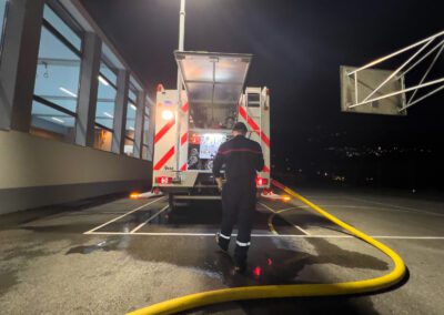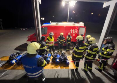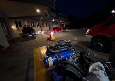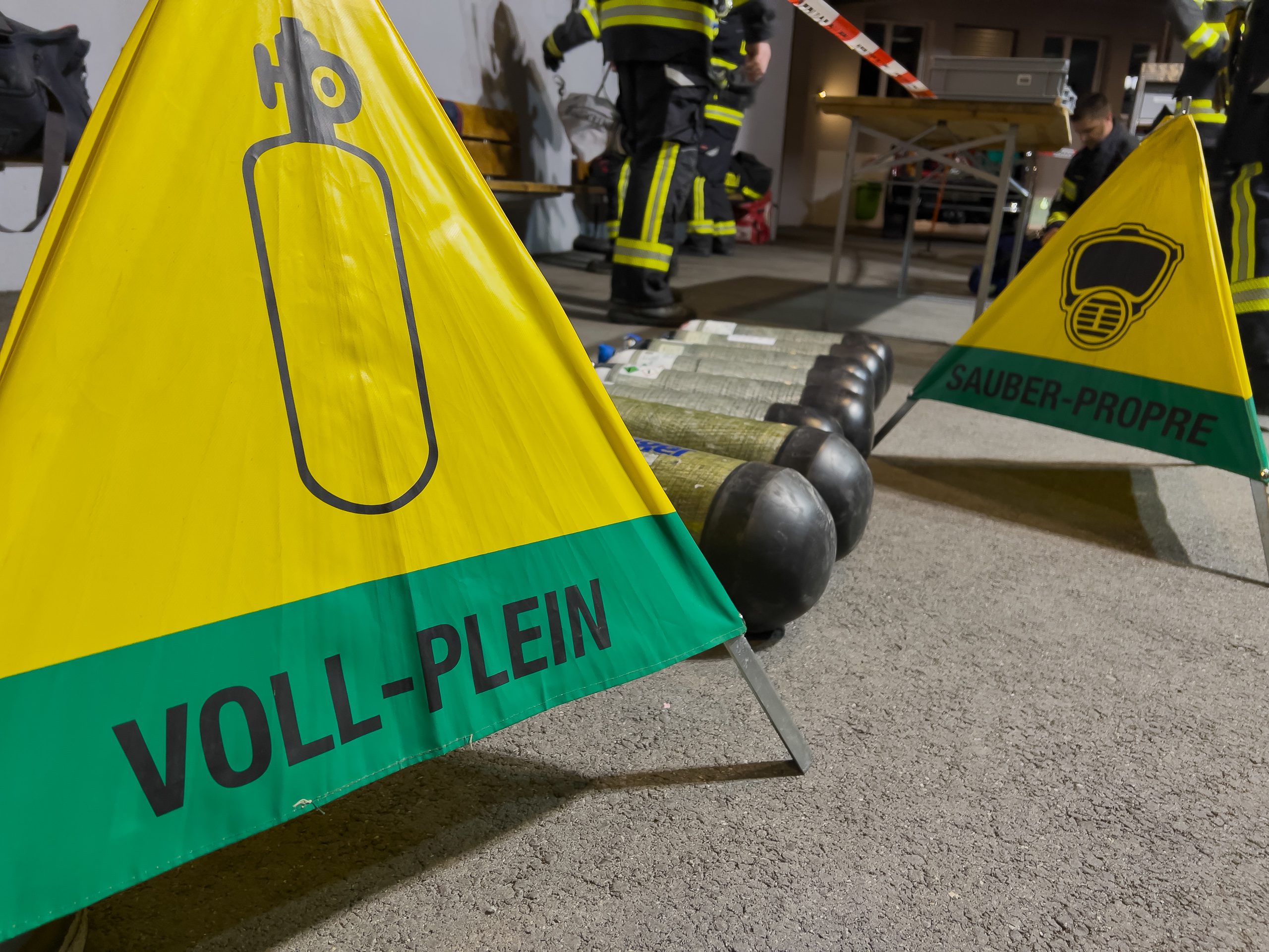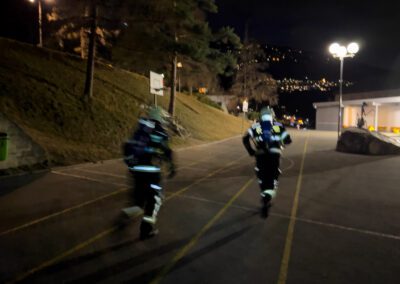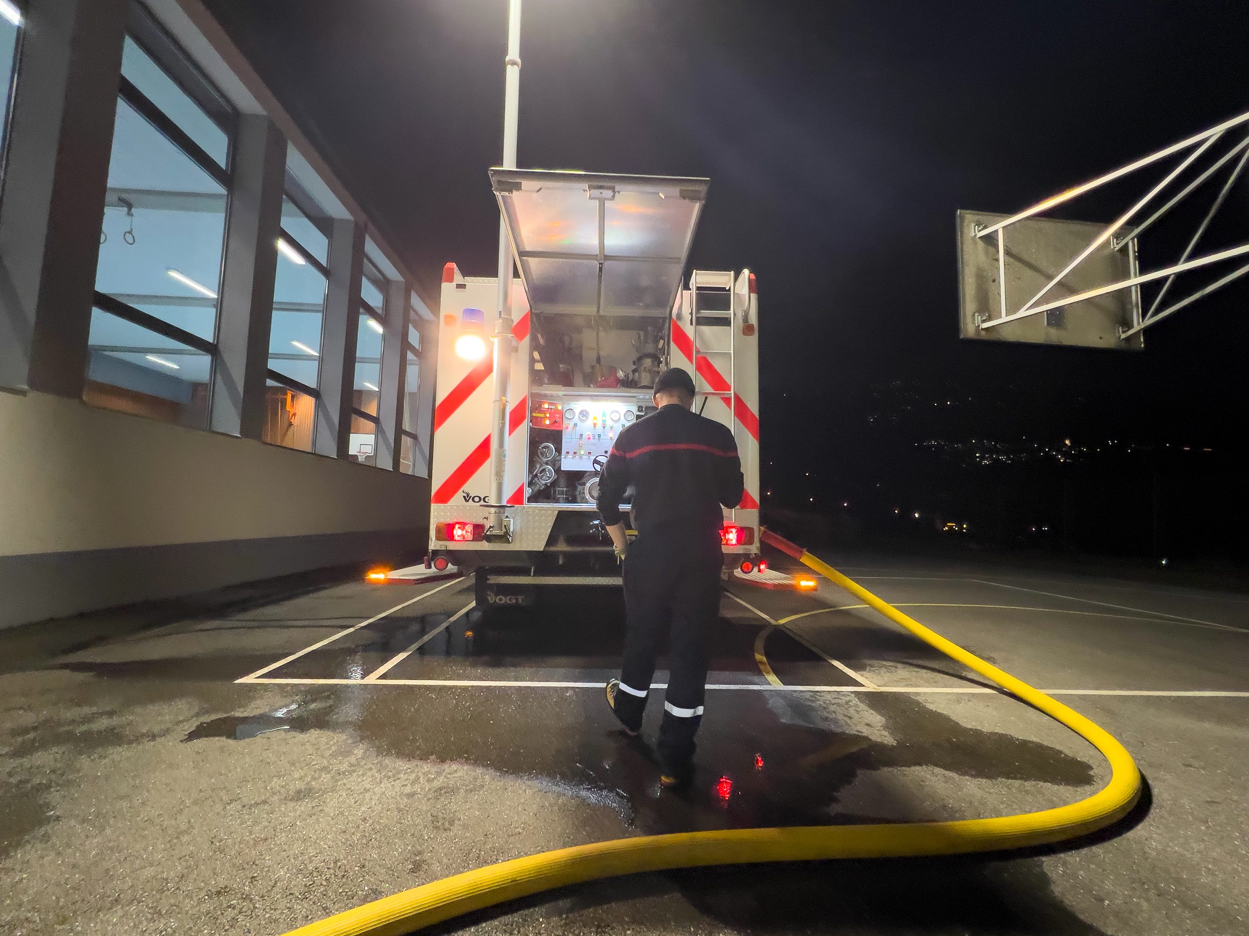 Séance de protection respiratoire réalisée au centre scolaire : reconnaissance et progression en binômes sur lignes guide, mise en place de repères, contrôle régulier des appareils respiratoires (ARI) et points de sécurité. Les équipes ont travaillé la communication radio avec le poste de conduite et la gestion des flux entre les binômes. Des mises en situation réalistes ont permis d’entraîner l’orientation, la recherche et la sortie sous faible visibilité, suivies d’un débriefing axé sécurité et bonnes pratiques et exercices de cardio et d'endurance.